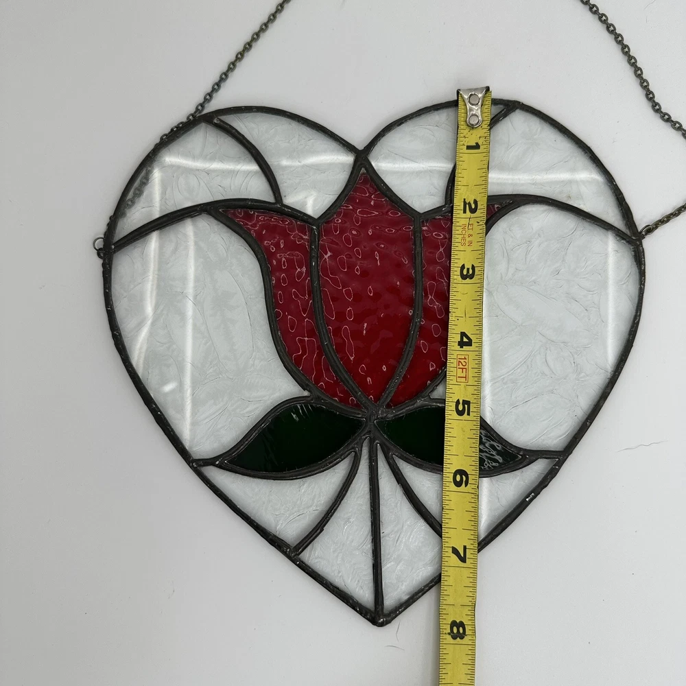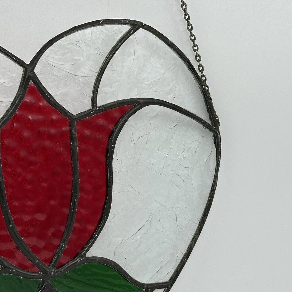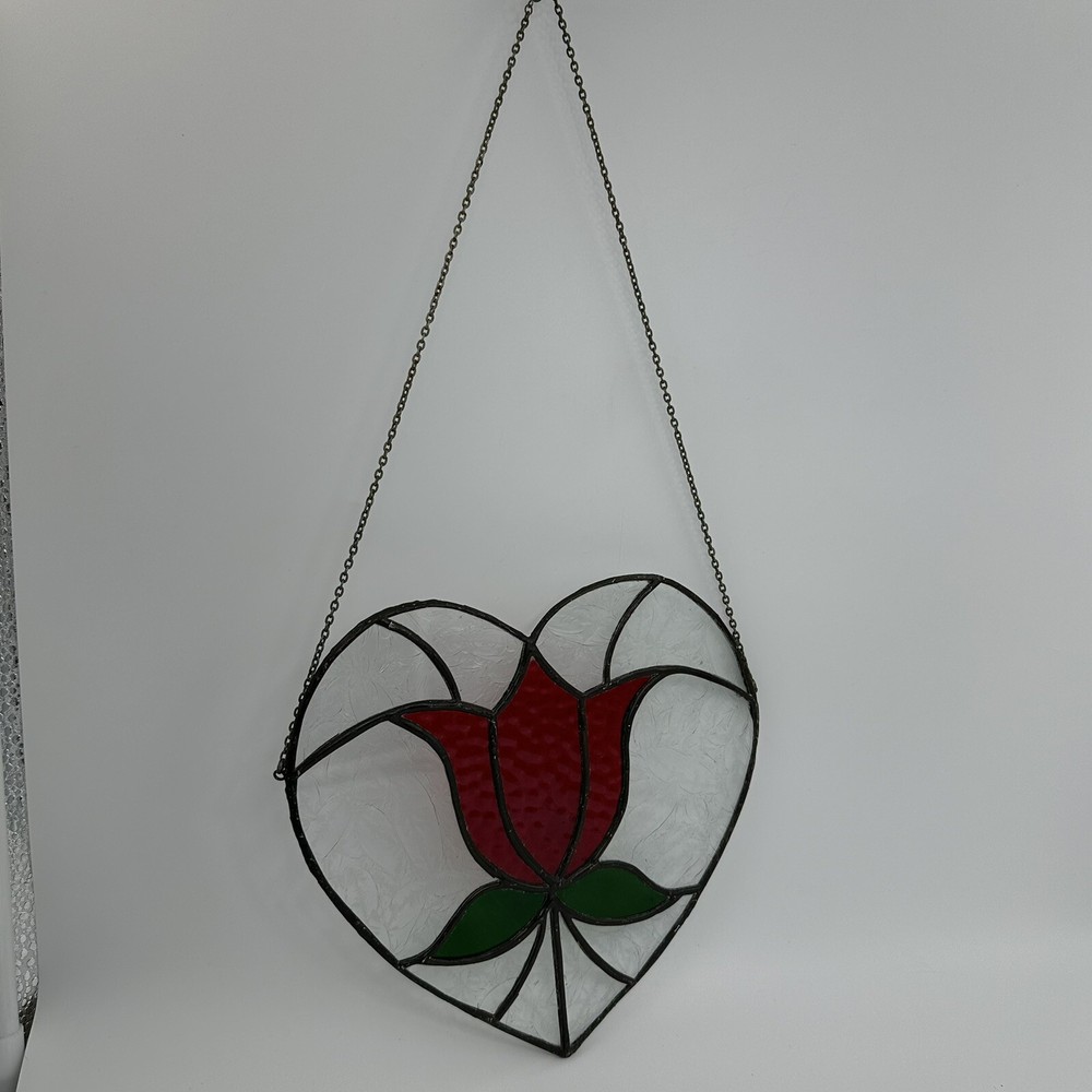 8" Stained Art Glass Heart Shaped Red Rose & Green Leaves Hanging Chain. Good, pre-owned condition. There is a tiny crack on one of the pieces near the bottom. See photos for accurate condition.
