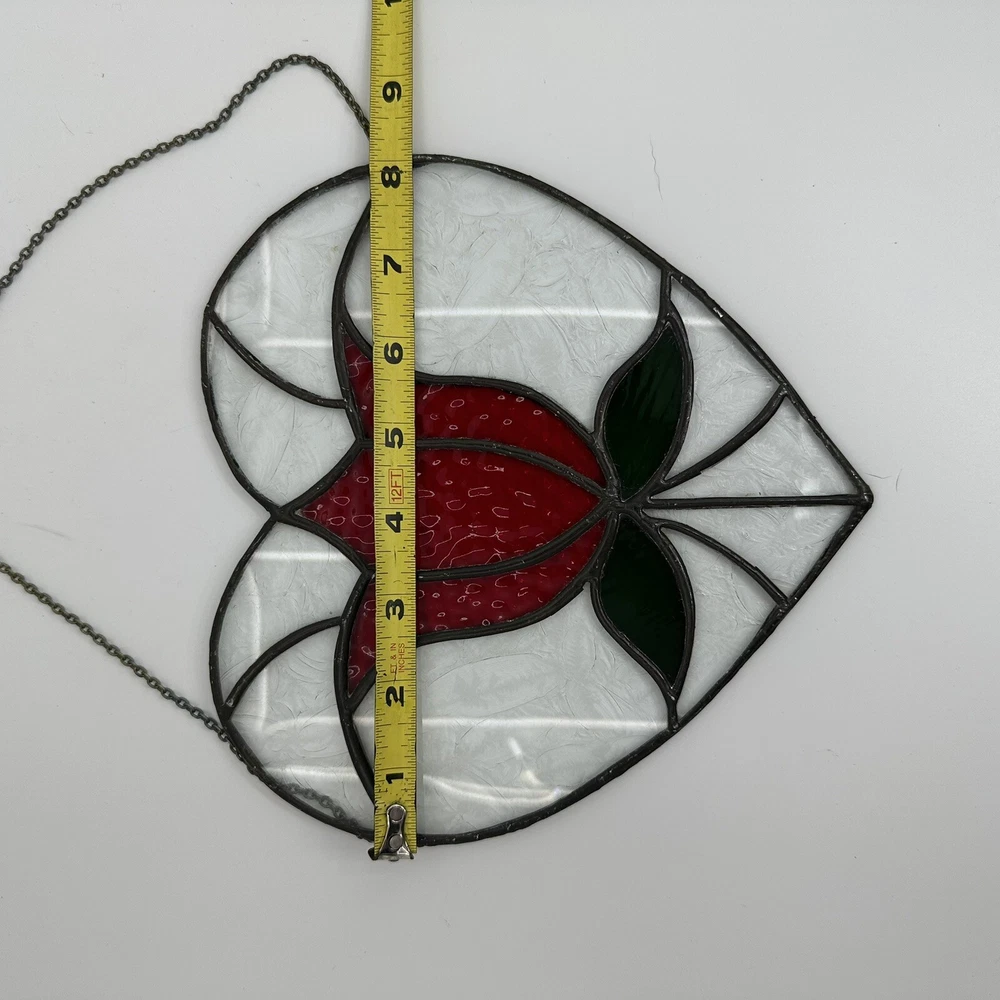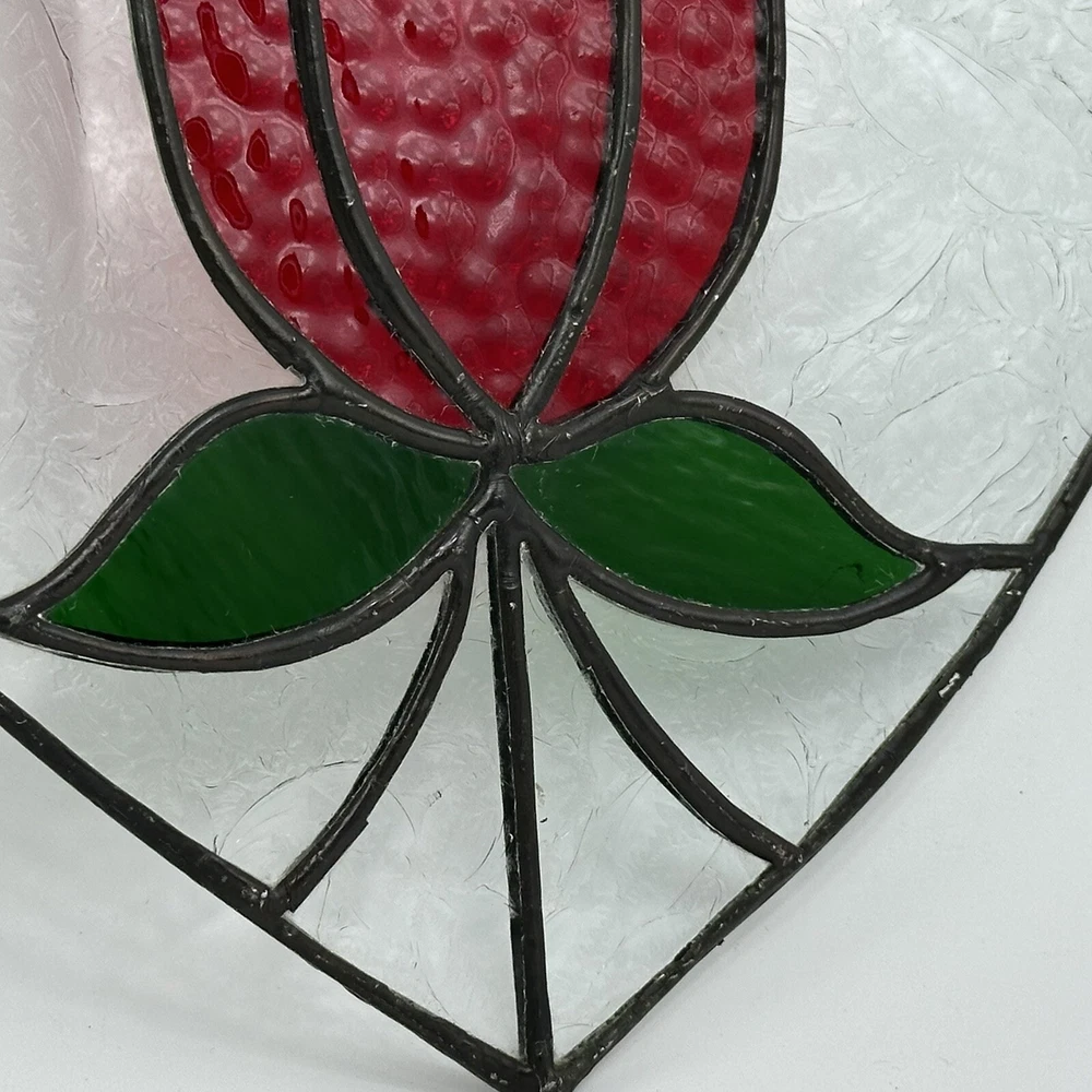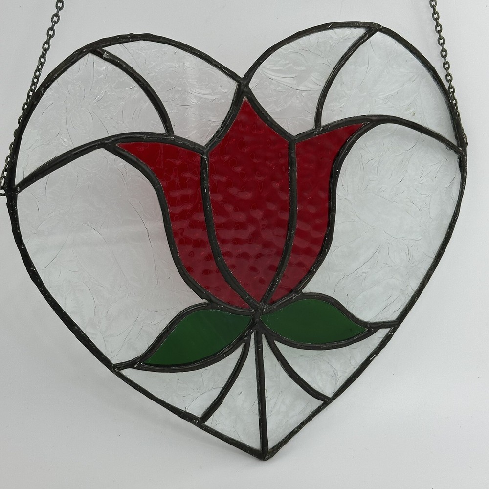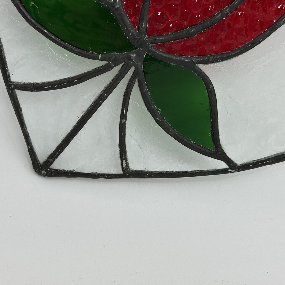 8" Stained Art Glass Heart Shaped Red Rose & Green Leaves Hanging Chain. Good, pre-owned condition. There is a tiny crack on one of the pieces near the bottom. See photos for accurate condition.
