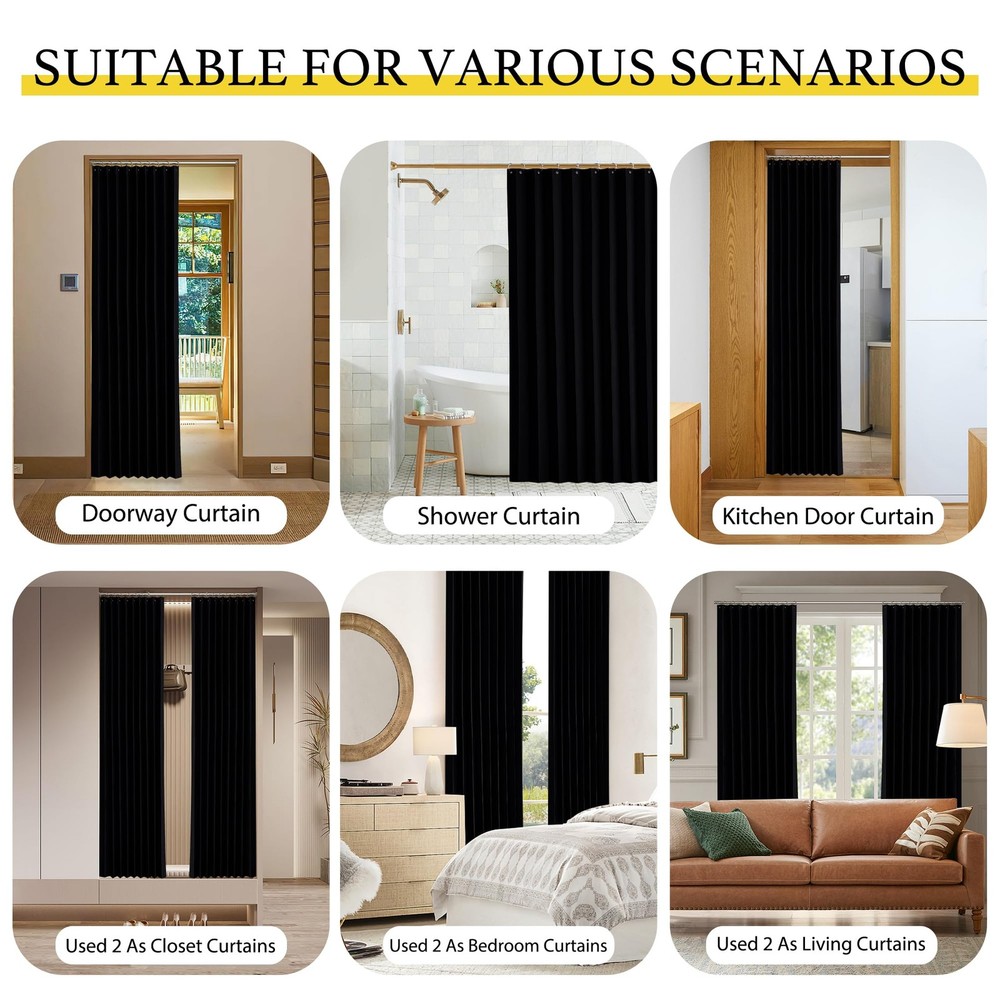 We all love Door Curtains for the way they make our home elegant and welcoming. Product Info.: The door curtain package comes with 1 panel and Hooks. Each panel measures 50 inches wide by 80 inches long. The length excludes the rings.It's easy hanging and removing on an existing rod. Genius Idea of Door: Are you tired of all the same doors? Depressed by small Spaces? Shy away from expensive doors? Need more conveniently pass through? Now you don't have to worry, we offer a brand new temporary door, this easy install soft blackout drape is perfect for you instead of doors now. Fabric Function: No formaldehyde, no chemical coating, no pungent smell, high-quality material is safe for babies and small kids. Blackout curtain liners block out sunlight, harmful UV rays, noise, and heat while offering privacy. Versatile Home Decor: Use the simple, modern and soft drapery as an exterior door curtain or interior door curtain between kitchen, dining room, bedroom, living room, patio glass door, and closet, hallway. Easy Care: blackout curtains are made to last. Machine washable in normal temperature water, use mild detergent, no bleaching, tumble or natural dry. Steam ironing can easily remove the wrinkles or any fold marks.