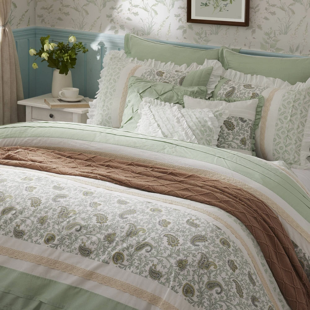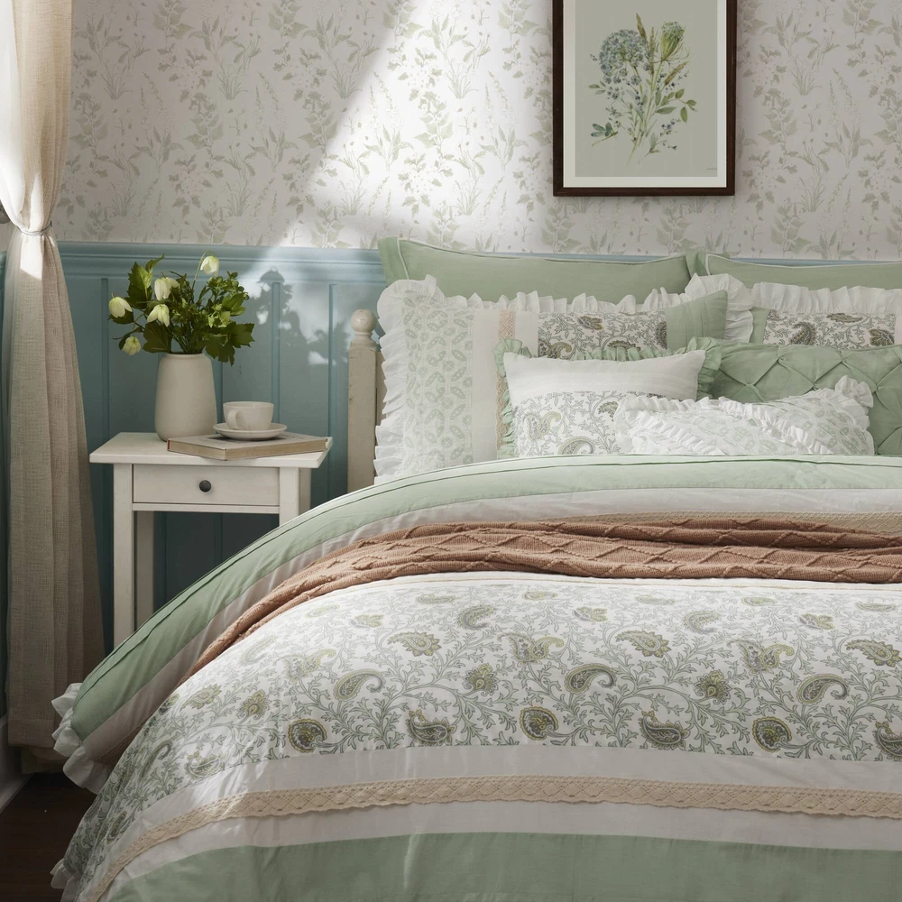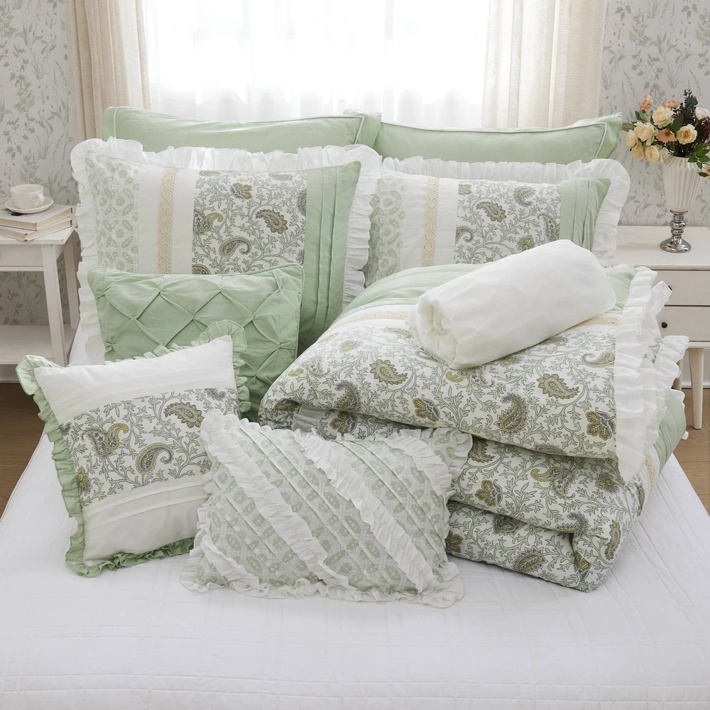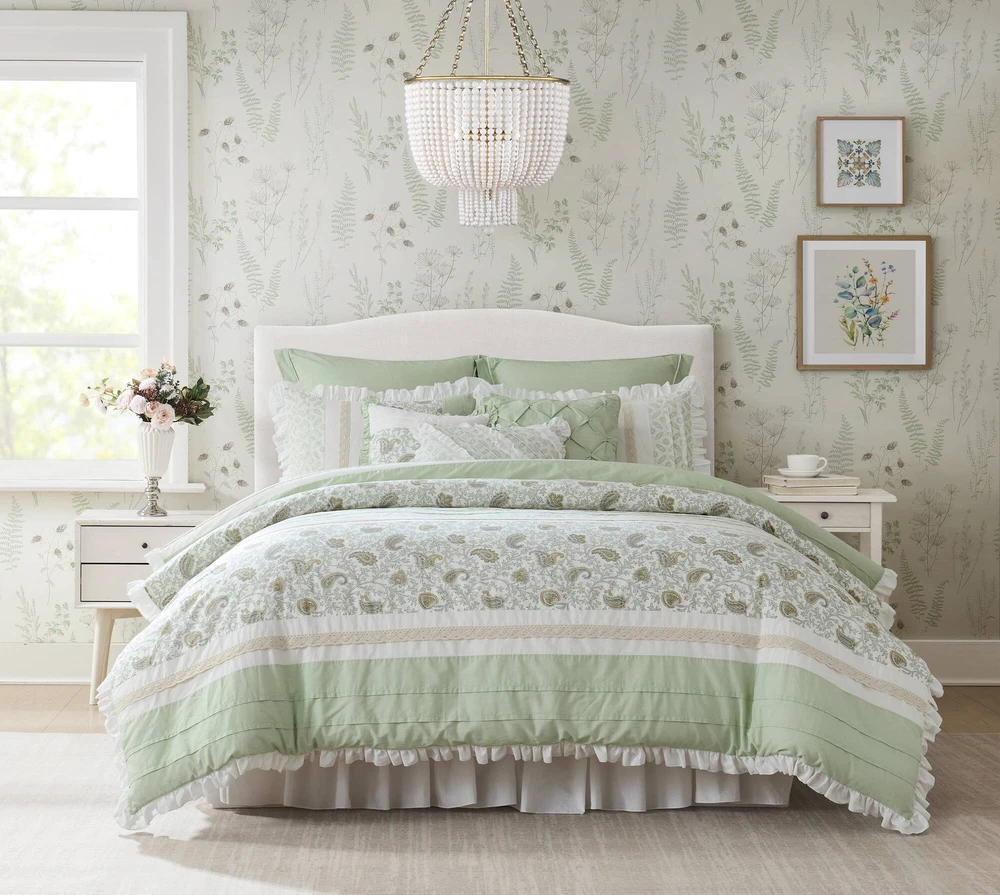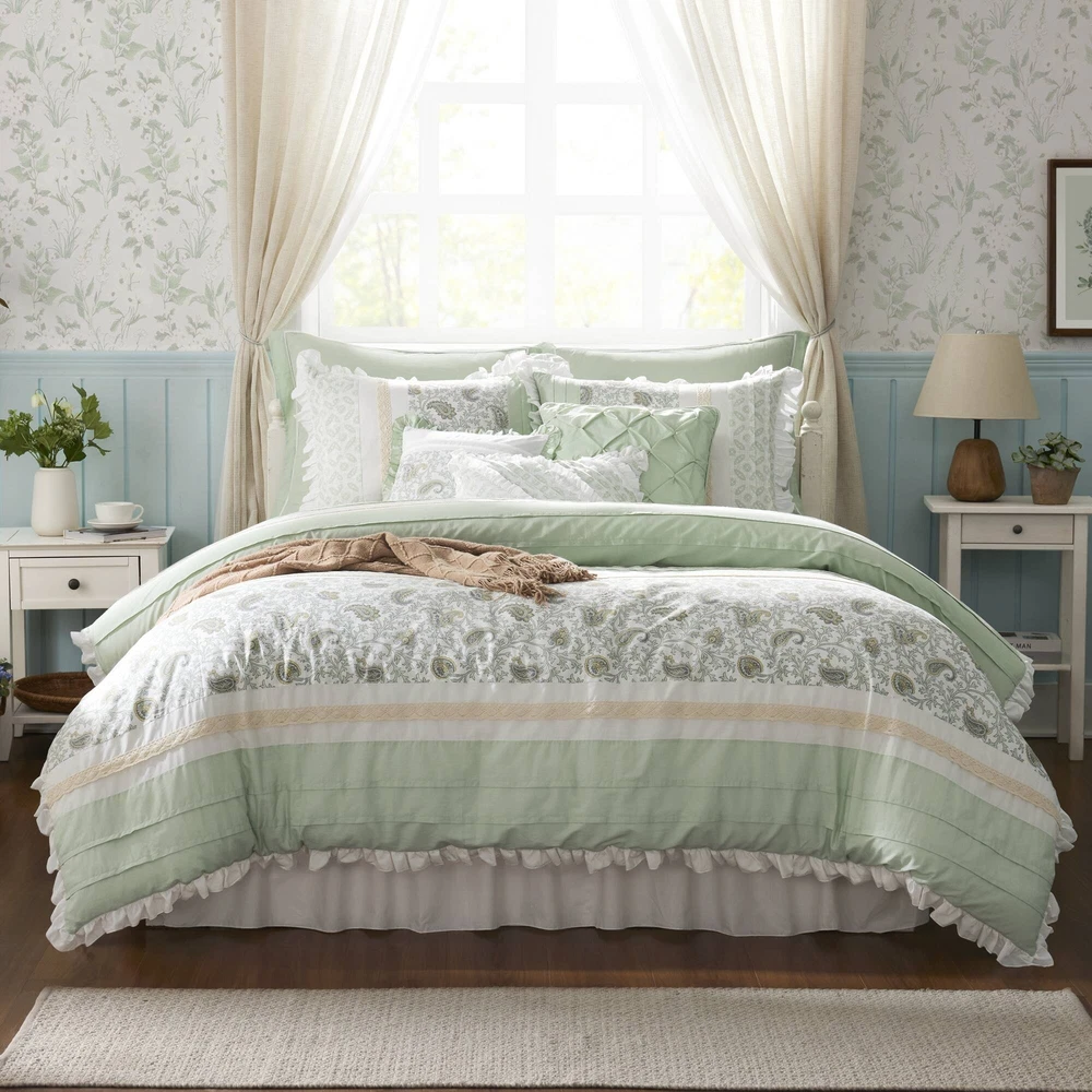 Specification Product Information Item Code:B035P294109 Product Type:Single Box Product Product Name:9 Piece Cotton Percale Comforter Set Queen Main Color:Sage Green Main Material:Cotton Bed Size:Queen Product Dimensions Assembled Length (in.):90.00 Assembled Width (in.):90.00 Assembled Height (in.):1.50 Product Weight (lbs.):13.55 Package Size Length (in.):23.62 Width (in.):18.90 Height (in.):11.42 Weight (lbs.):16.41 Product Features 【Elegant Floral Design】 The Madison Park 9-Piece Comforter Set showcases a floral print on cotton percale, enhanced by cottage-inspired details like pintucking, lace taping, and a ruched flange. 【Premium Cotton Percale】 Crafted from high-quality cotton percale, this comforter set is durable, breathable, and OEKO-TEX certified, meeting high standards to ensure wellness and comfort. 【Complete 9-Piece Set】 Includes 1 floral comforter, 2 standard shams, 2 Euro shams, a bed skirt, and 3 decorative pillows, with each piece designed to complement the floral theme. 【All Season Comforter Set】 This floral comforter set provides warmth in cooler months and breathability in warmer seasons, ensuring year-round comfort. 【Easy Care】 Machine washable on a cold, gentle cycle and tumble dry low. Fluff or steam to remove wrinkles. 【Enhance Your Decor】 Elevate your bedroom with this 9-piece floral comforter set, blending cottage-inspired, shabby chic, and farmhouse styles for timeless appeal. Description PRODUCT DETAILS Queen 1 Comforter: 90"W x 90"L 2 Standard Shams: 20"W x 26"L+2"D(2) 1 Bed skirt: 60"Wx80"L+15"D 2 Euro Shams: 26"W x 26"L(2) 1 Decorative Pillow: 16"W x 16"L 1 Decorative Pillow: 18"W x 18"L 1 Decorative Pillow: 12"W x 18"L MATERIAL Printed cotton face, cotton/poly back comforter and shams, 8oz/sq yard polyester filling; cotton/poly bedskirt, euro shams and pillows