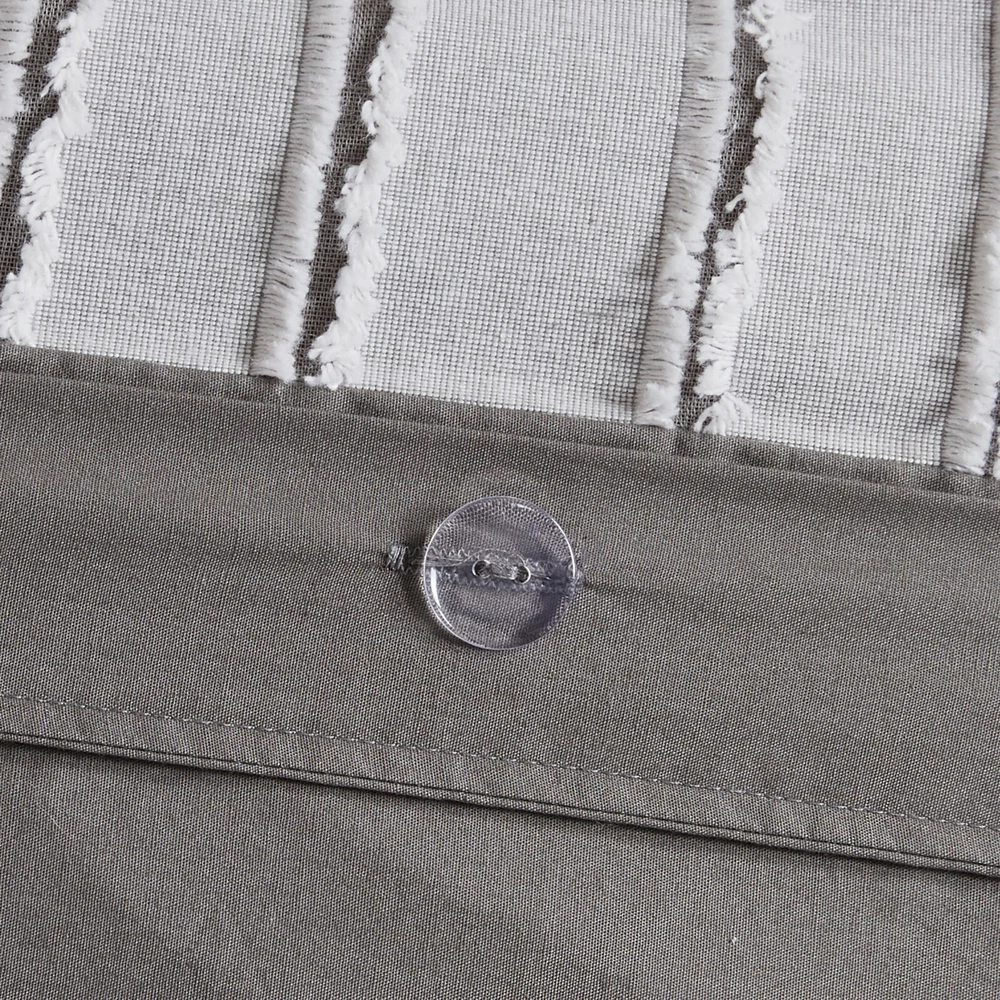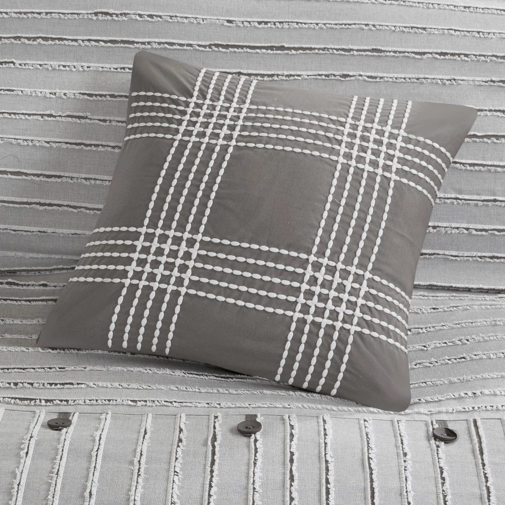 Store Categories Store Categories Bedding Comforters Decorative Pillows Duvet Covers Quilts & Coverlets Sheets Blankets & Throws Mattress Pads Pillows Home Decor Window Treatments Wall Art Home Accents Furniture Beds Dining Seating Ottomans & Benches Accent Chairs Accent Tables Dining Tables Sofas Bath Bath Robes Shower Curtains Towels Bath Rugs Bath Accessories Apparel Pajama Sets Nightgowns Rugs Rugs & Carpets Lighting Lamp Pendant Other Product Overview Details DESCRIPTION This farmhouse styled cotton clip jacquard comforter features a pieced design with striped pattern and decorative buttons, for a casual look. Two matching shams and two coordinating Euro knit shams (3 in King size) complement the top of the bed. Also included are three decorative pillows: one knit square, one trimmed square with embroidery details, and one carpet stitch oblong with decorative embroidery details that add the finishing touches to this set. This oversized and overfilled comforter uses a removable duvet-style insert that is secured by inner ties and a hidden button closure. This provides no visible bartacking lines on top of the bed to create a smooth, clean face. It comes in 2 colors including an ivory on natural light taupe ground or a white on grey ground. Dry clean comforter cover only and machine wash comforter filler. FEATURES • Set includes comforter, 2 shams, 2 euro shams (3 in King size), 2 square and 1 oblong throw pillows • Casual farmhouse design cotton clip jacquard adds subtle texture and style in a two tone stripe effect • Oversized and overfilled comforter with removable insert (included), inner ties, and hidden button closure for easy cleaning and keep warm • Duvet style comforter insert, no visible bartacking lines seen on top of the bed • Knit and embroidered decorative pillows have removable cover with hidden zipper • Dry clean comforter cover and machine washable comforter filler (see wash label) • Commercial washer and dryer recommended to provide ample room for movement • Items may come in compressed packaging to ensure efficient shipping, and will need to be fluffed up • Hypoallergenic polyester insert and pillow filling contains no allergens and is dustproof MATERIAL Comforter/sham face: 100% cotton clip jacquard pieced with decorative button; Back: 100% cotton; removable seperate polyester filler insert Euro sham face: 100% arylic knitted fabric, back: 100% cotton faux linen Square pillow 1 cover: 100% acrylic knitted fabric Square pillow 2 cover: 100% cotton faux linen with embroidery Oblong pillow cover: 100% cotton faux line with embroidery All pillows with hidden zipper and 100% polyester filling Available Sizes: Queen Comforter Set includes: 1 Comforter: 92"W x 96"L 2 Standard Shams: 20"W x 26"L 2 Euro Shams: 26"W x 26"L 2 Decorative Pillows: 20"W x 20"L 1 Decorative Pillow: 14"W x 20"L King Comforter Set includes: 1 Comforter: 110"W x 96"L 2 King Shams: 20"W x 36"L 3 Euro Shams: 26"W x 26"L 2 Decorative Pillows: 20"W x 20"L 1 Decorative Pillow: 14"W x 20"L Bedding Comforters Decorative Pillows Duvet Covers Quilts & Coverlets Sheets Blankets & Throws Mattress Pads Pillows Home Decor Window Treatments Wall Art Home Accents Furniture Beds Dining Seating Ottomans & Benches Accent Chairs Accent Tables Dining Tables Sofas Bath Bath Robes Shower Curtains Towels Bath Rugs Bath Accessories Rugs Rugs & Carpets Lighting Lamp Pendant Product Overview Product Details DESCRIPTION This farmhouse styled cotton clip jacquard comforter features a pieced design with striped pattern and decorative buttons, for a casual look. Two matching shams and two coordinating Euro knit shams (3 in King size) complement the top of the bed. Also included are three decorative pillows: one knit square, one trimmed square with embroidery details, and one carpet stitch oblong with decorative embroidery details that add the finishing touches to this set. This oversized and overfilled comforter uses a removable duvet-style insert that is secured by inner ties and a hidden button closure. This provides no visible bartacking lines on top of the bed to create a smooth, clean face. It comes in 2 colors including an ivory on natural light taupe ground or a white on grey ground. Dry clean comforter cover only and machine wash comforter filler. FEATURES • Set includes comforter, 2 shams, 2 euro shams (3 in King size), 2 square and 1 oblong throw pillows • Casual farmhouse design cotton clip jacquard adds subtle texture and style in a two tone stripe effect • Oversized and overfilled comforter with removable insert (included), inner ties, and hidden button closure for easy cleaning and keep warm • Duvet style comforter insert, no visible bartacking lines seen on top of the bed • Knit and embroidered decorative pillows have removable cover with hidden zipper • Dry clean comforter cover and machine washable comforter filler (see wash label) • Commercial washer and dryer recommended to provide ample room for movement • Items may come in compressed packaging to ensure efficient shipping, and will need to be fluffed up • Hypoallergenic polyester insert and pillow filling contains no allergens and is dustproof MATERIAL Comforter/sham face: 100% cotton clip jacquard pieced with decorative button; Back: 100% cotton; removable seperate polyester filler insert Euro sham face: 100% arylic knitted fabric, back: 100% cotton faux linen Square pillow 1 cover: 100% acrylic knitted fabric Square pillow 2 cover: 100% cotton faux linen with embroidery Oblong pillow cover: 100% cotton faux line with embroidery All pillows with hidden zipper and 100% polyester filling Available Sizes: Queen Comforter Set includes: 1 Comforter: 92"W x 96"L 2 Standard Shams: 20"W x 26"L 2 Euro Shams: 26"W x 26"L 2 Decorative Pillows: 20"W x 20"L 1 Decorative Pillow: 14"W x 20"L King Comforter Set includes: 1 Comforter: 110"W x 96"L 2 King Shams: 20"W x 36"L 3 Euro Shams: 26"W x 26"L 2 Decorative Pillows: 20"W x 20"L 1 Deco