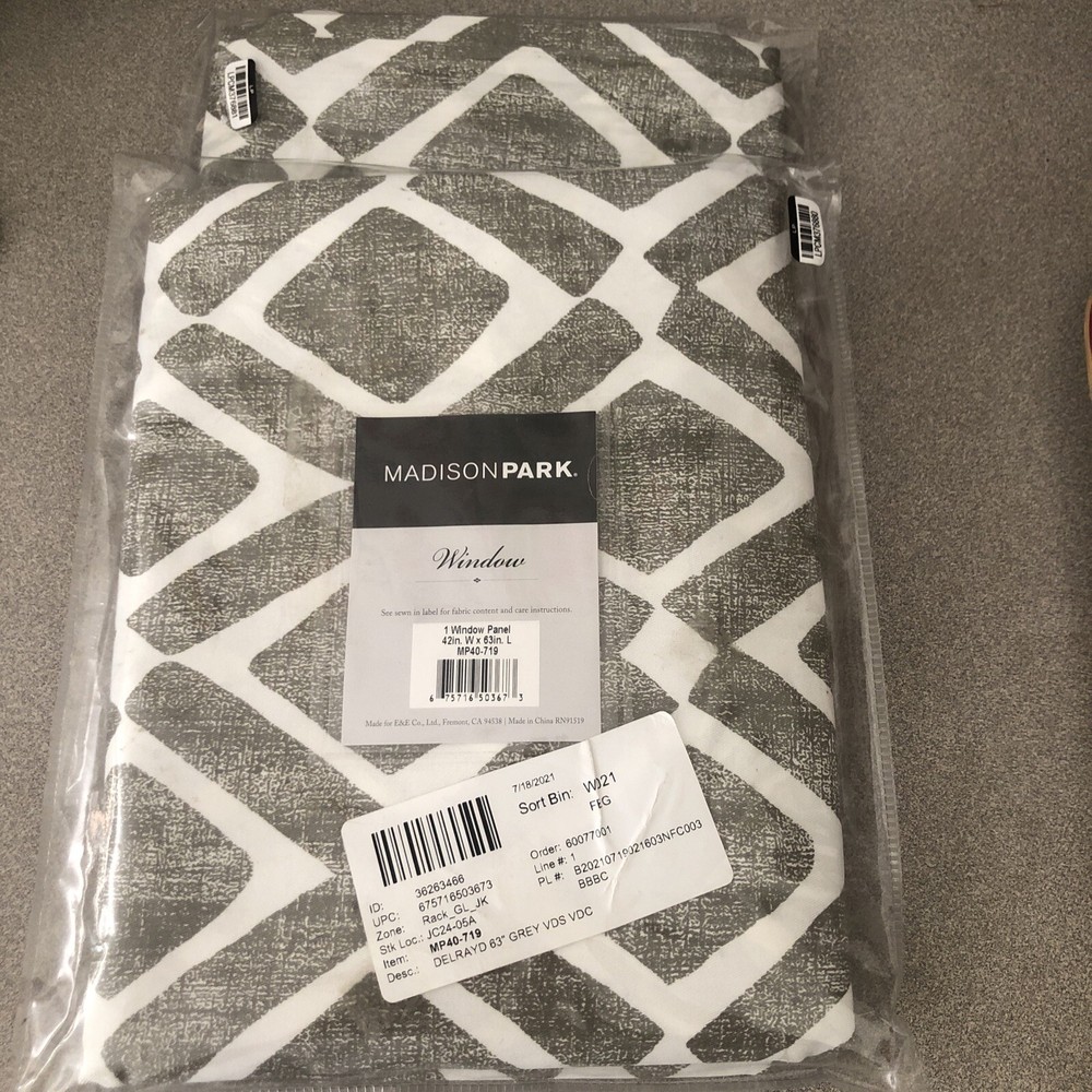 A Pair/ 2 PCs of Madison Park Delray Diamond Print Window Panel 42”x63”. Color grey. Condition are new, open box. Shipped with USPS