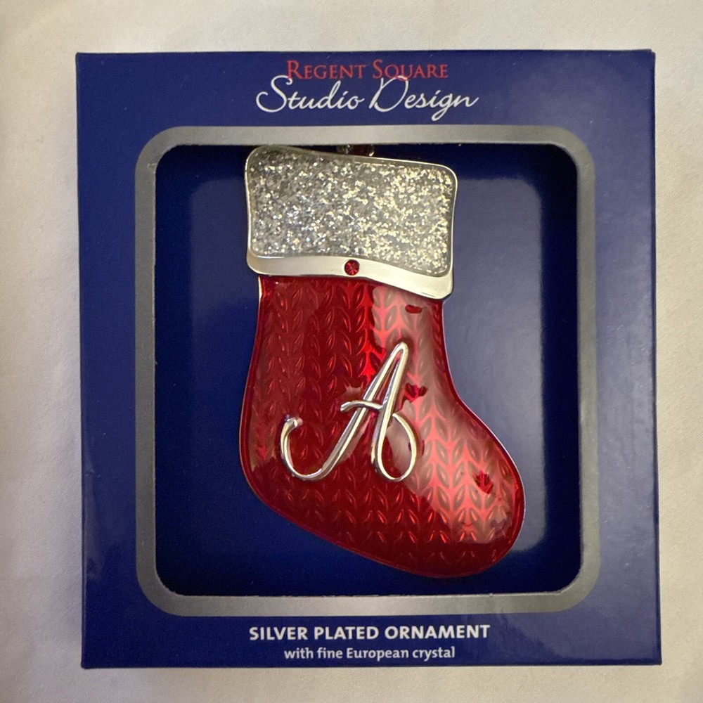 “A” Regent Square Studio Design Monogram Silver Plated Ornament Euro Crystal Box has slight imperfection at top This beautiful Christmas ornament is filled with holiday shine. This ornament is collectible and will add festive charm to special moments shared with friends and family. • Comes with a beautiful ribbon for hanging • Made from durable metal that will last for many Christmases to come • Hand-enameled