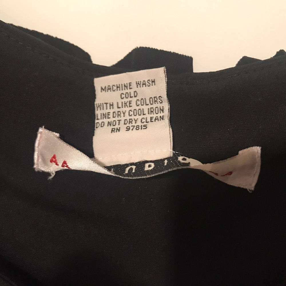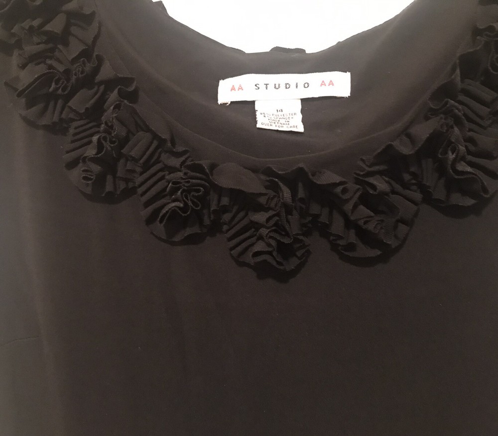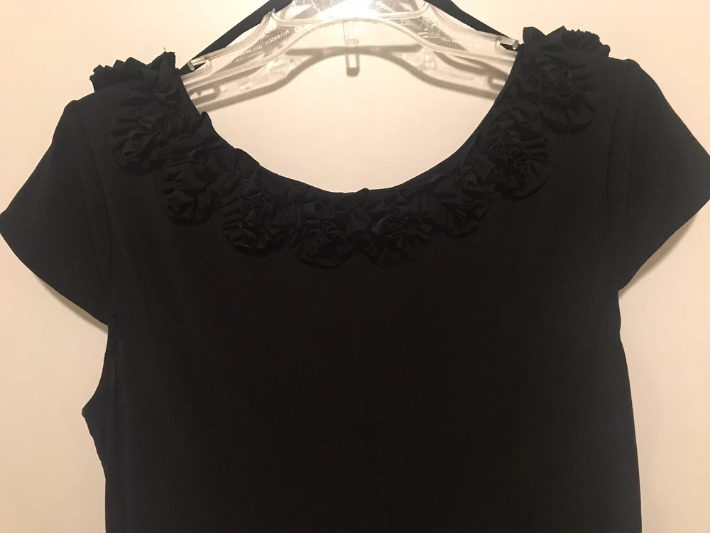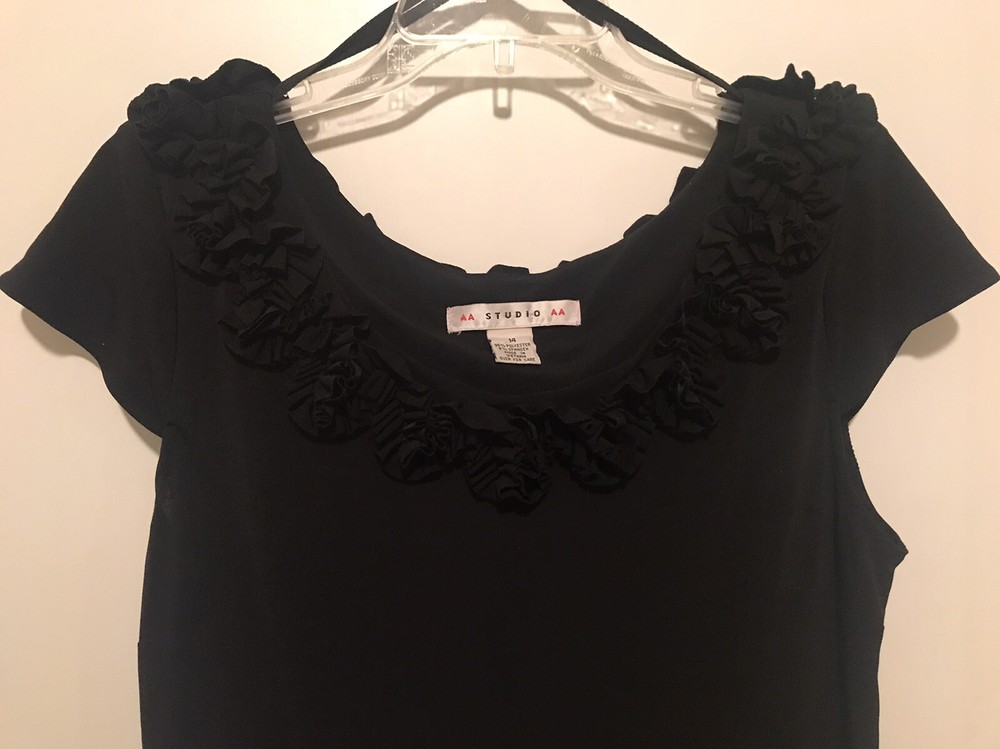 AA Studio AA Women's Short Black CapSleeve Dress Sz14 Ruffle Flower Neckline. Hard to photograph the ruffled neckline, but it goes all the way around. This dress slips on easily with no zipper to contend with. The length is 37” and the width across the bust is 19”, the cap sleeve is 4.5” all are approximate measurements