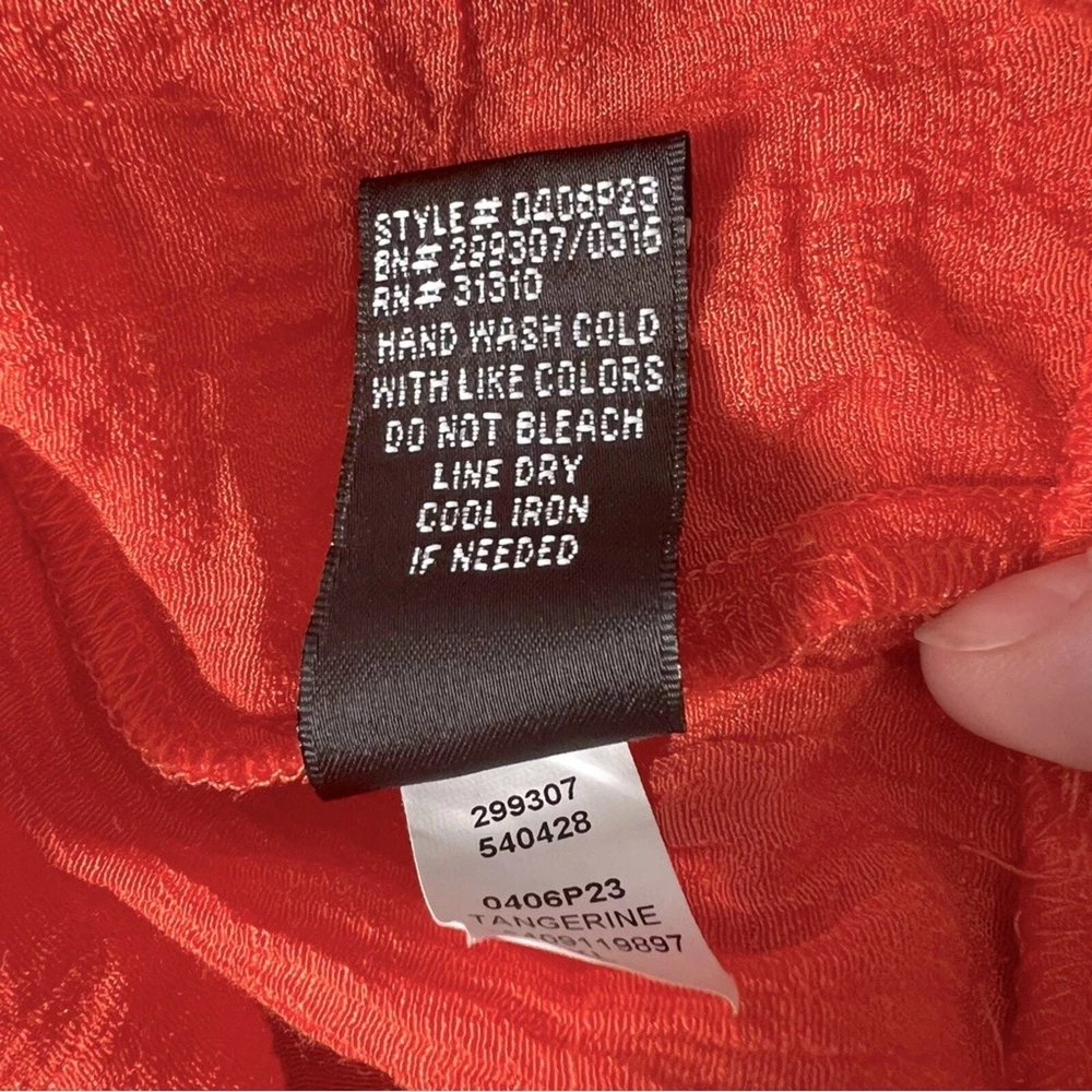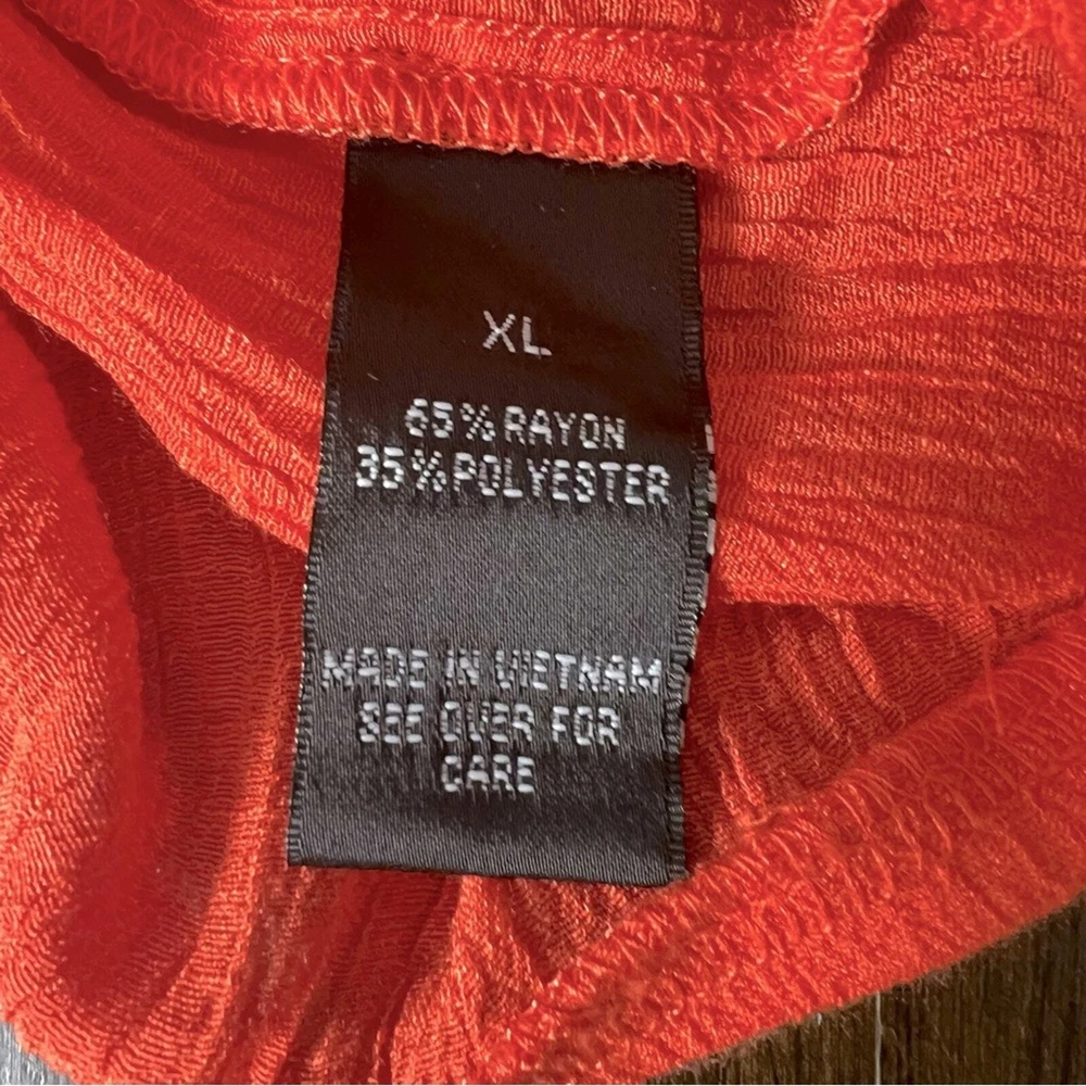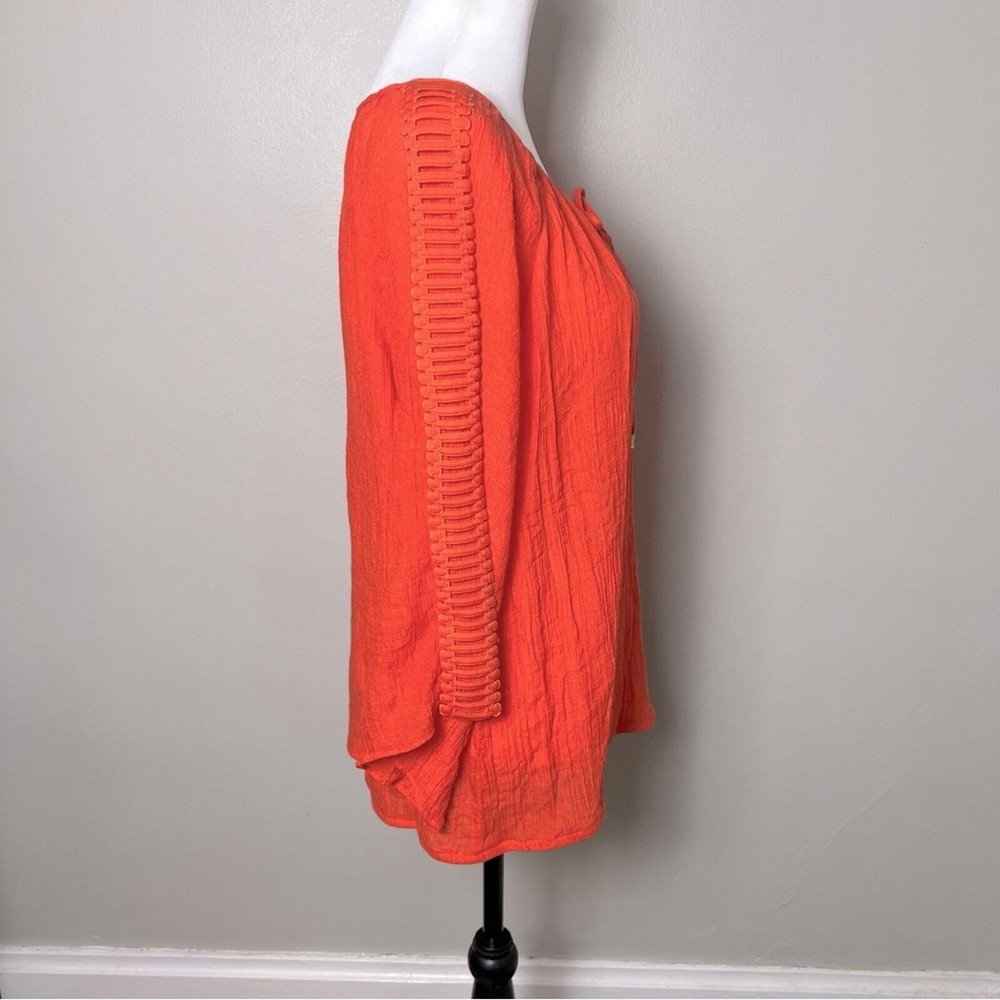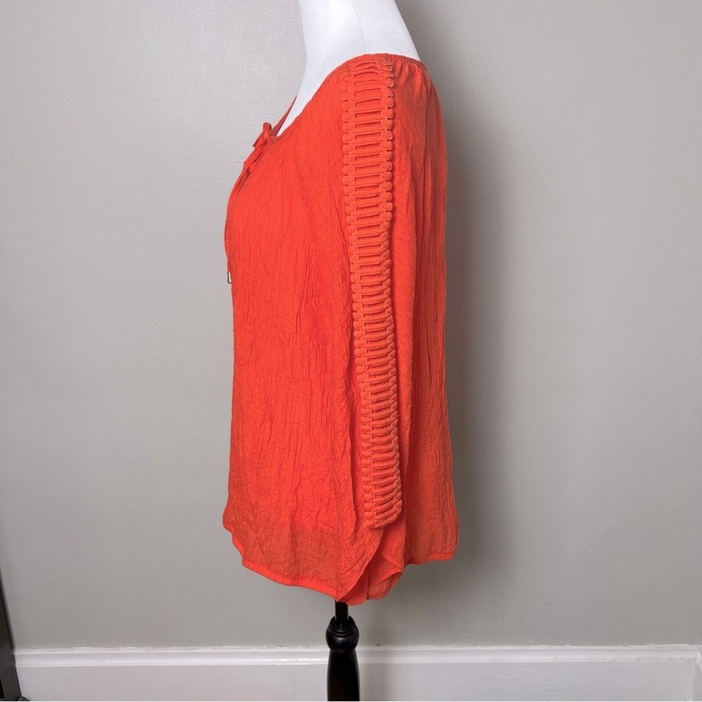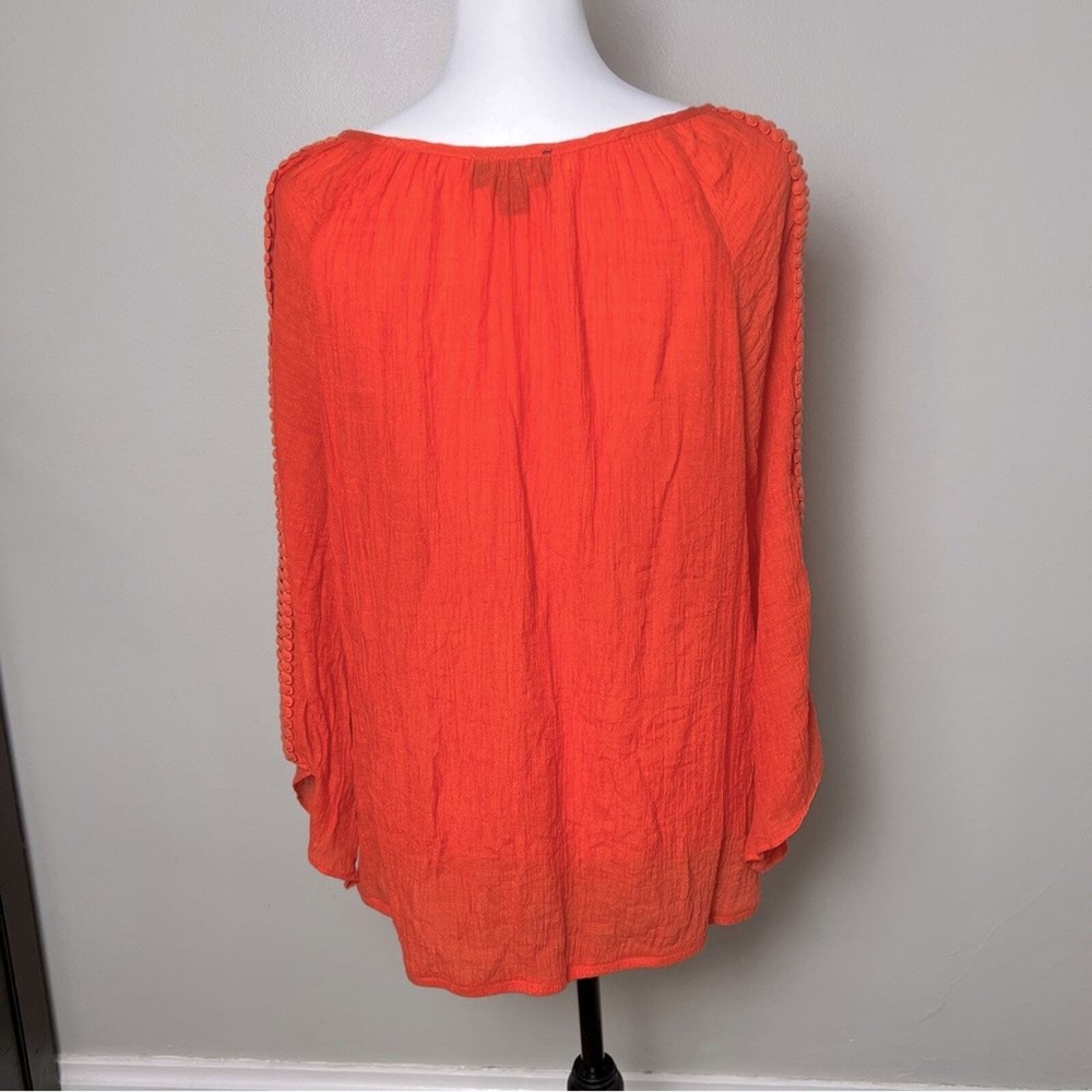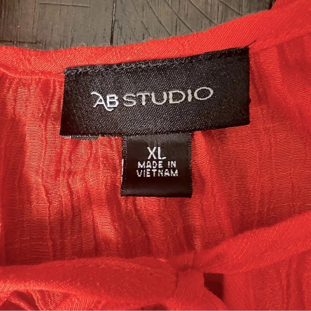 <![CDATA[<div>AB Studio long-sleeved gauze blouse, size XL. This gorgeous, orange blouse features a keyhole closure with ties at the front neckline finished with gold bead details. The 3/4 length sleeves are embellished with a lattice applique detail and the cuffs are bell shaped. Thie blouse is in excellent condition, free from any stains or markings. This light, flowy blouse is perfect for your next beach vacation, cruise or just for a casual summer's day. Bust: 21" Length: 24" (shoulder to hem) This blouse is 65% rayon, 35% polyester. Recommend hand wash, line drying. Smoke free home.