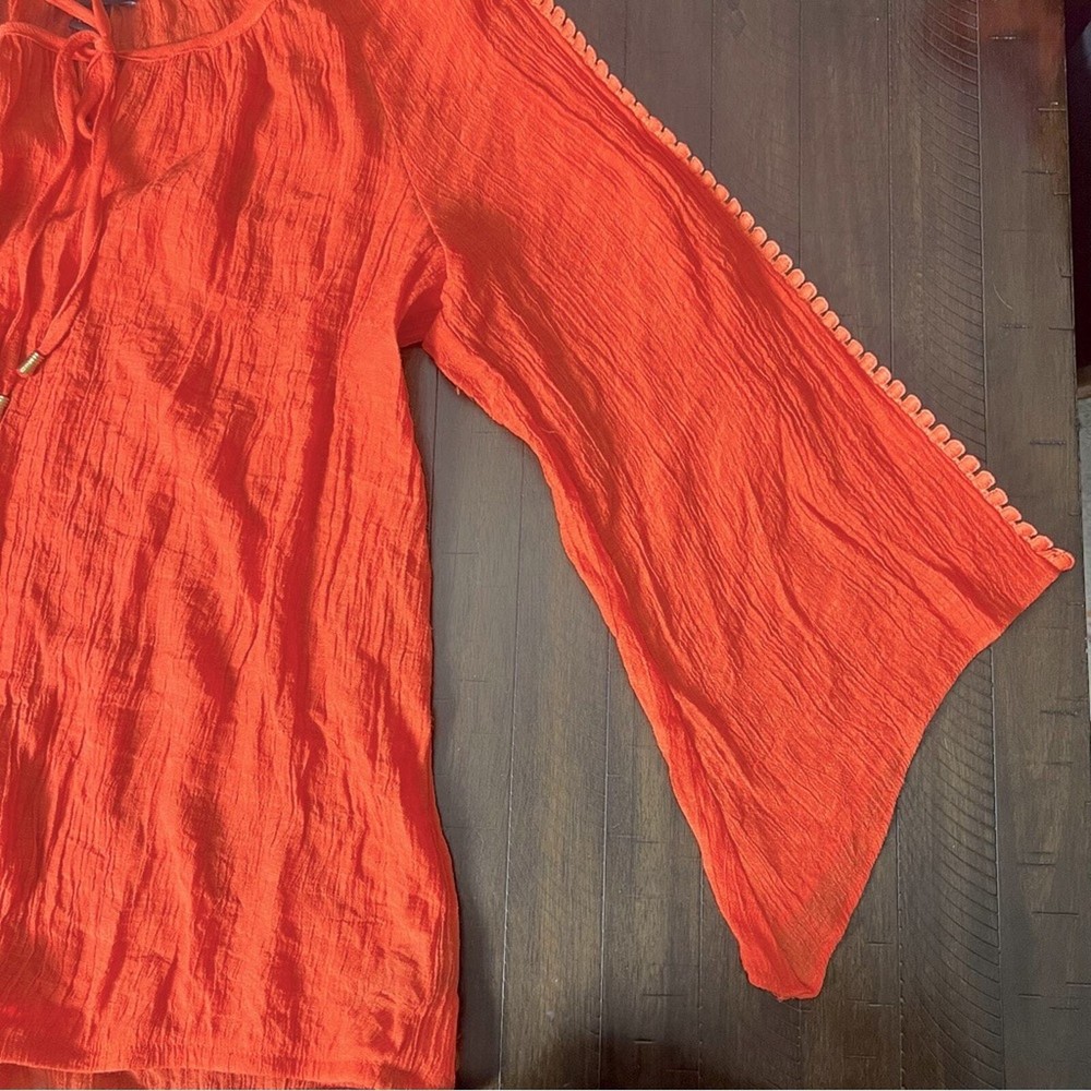 This blouse is absolutely stunning! The lightweight gauze fabric feels so soft and airy, perfect for warm days. The orange color is vibrant, and the gold bead details add a touch of elegance. Love the bell sleeves and lattice applique—such unique details! Fits comfortably in XL, and the flowy silhouette is so flattering. Great for vacations or casual outings. Highly recommend!