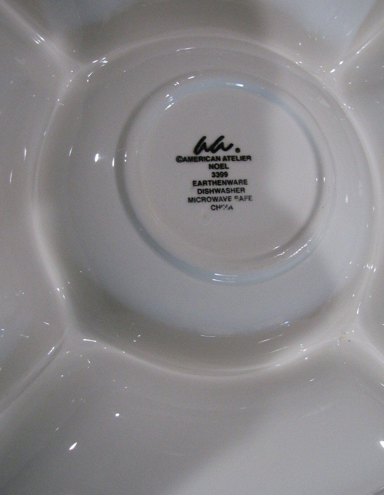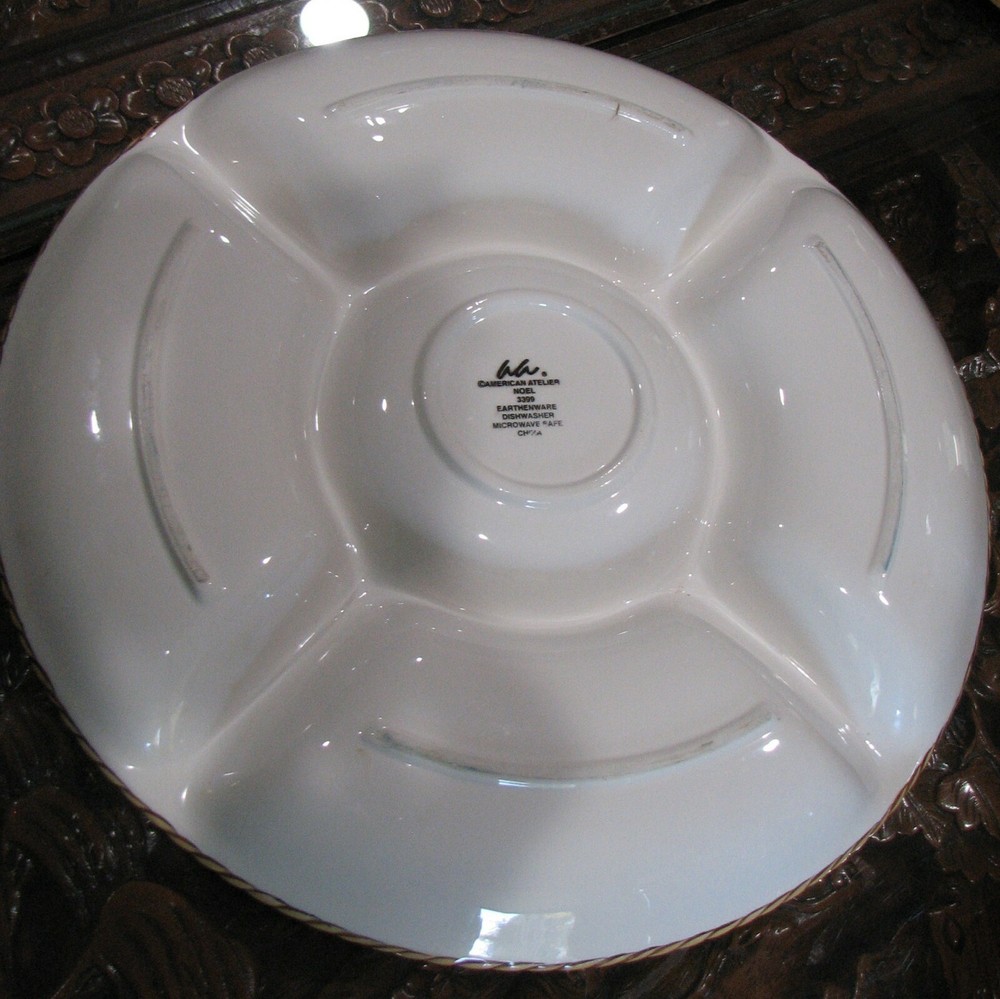 Shipping: Shipping is the actual shipping for USPS Priority Mail or Fed Ex Home Delivery to your location. I only charge actual shipping costs, no additions. If you win more than one auction, I will combine for cheapest shipping. I combine shipping for multiple auction wins! Payment due within 3 days of the end of the auction. American Atelier Noel 3399 Large Chip and Dip Server Condition: Excellent - Like New Condition, I don't even think it was ever used. I could not see any major scuffs or scratches. If there are any, they are very few and minor Description: Earthenware server with 5 sections measuring 14 3/4" diameter x 1 1/4" tall. Microwave and dishwasher safe. Please don't hesitate to ask questions before the end of bidding as all sales are final. No International buyers.