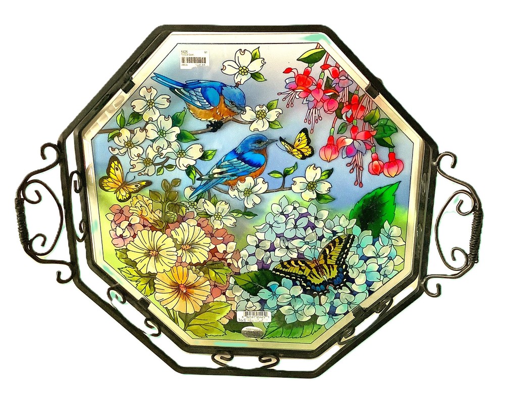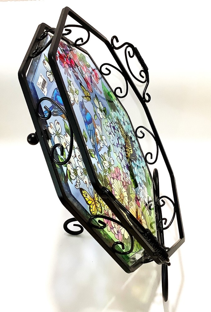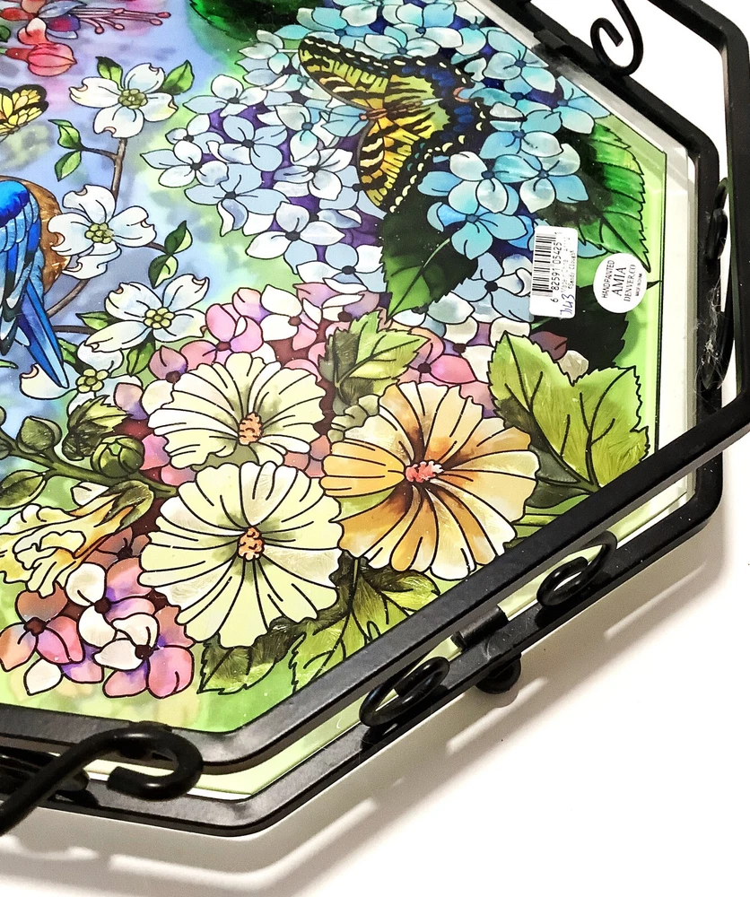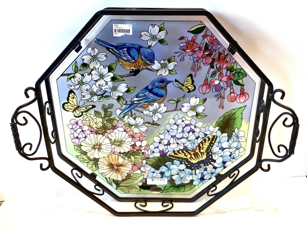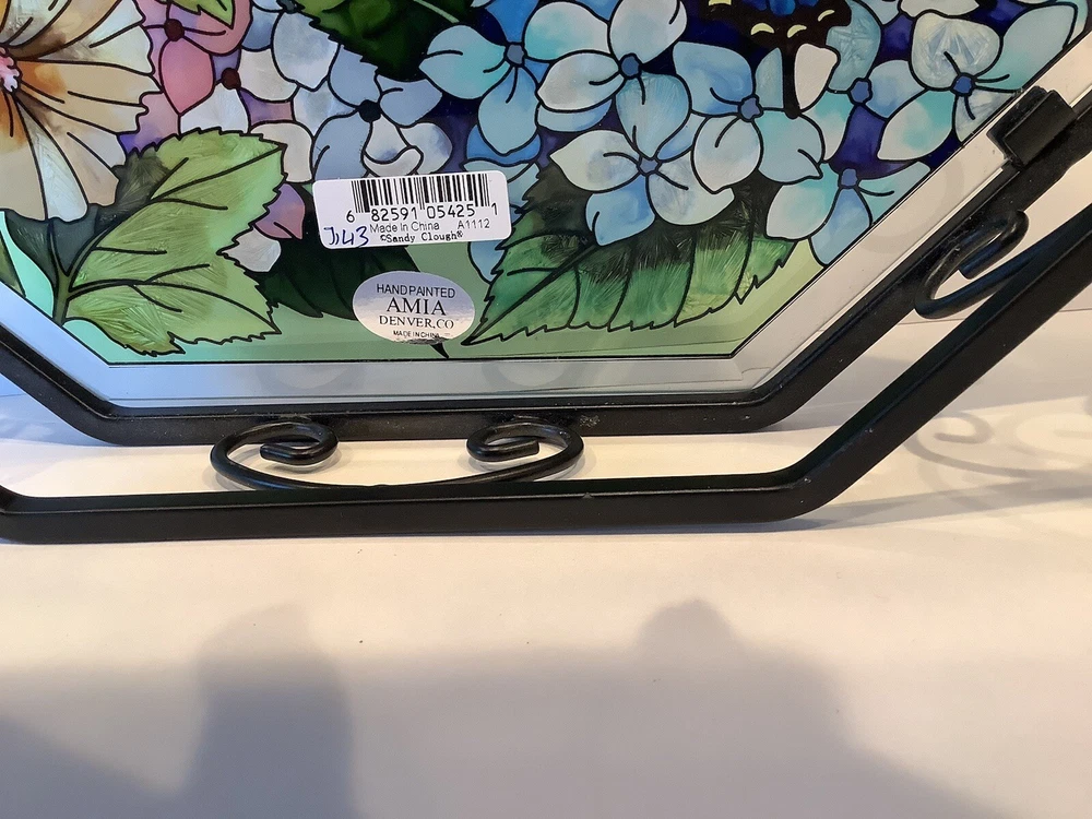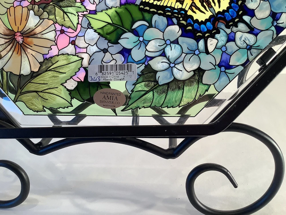 AMIA Stained Glass DISPLAY & WORKING TRAY "BLUE SKIES" with Wrought Iron Stand 15" Wide (w/ handles) x 13" Tall x 3" Deep + the stand which adds ~ 3" in height, so 16" tall in stand Weighs almost 5 pounds with the stand Item #5425 Artist - Sandy Clough The design of this tray is of bluebirds and butterflies among fuchsia,dogwood, petunia, and hydrangea flowers - beautifully captured in colorful cathedral-like glass - lots and lots of detail and gorgeous color! The glass is painted from the underside and the top surface is smooth, clear glass that is beveled around the 8 edges. (see photos)The glass is held securely in a sturdy wrought iron frame of handles, 2" sides, and 4 little round legs on the underside. There are little flourishes in the frame for aesthetics. In addition to the tray, there is a handcrafted wrought iron stand for display when not in use. This is a wonderful example of the careful attention to detail you will see in all of Amia's stained glass artwork. Its manufacture is a meticulous process of preparation of the surface, applying the world's finest colorful enamels, and firing in a kiln.. The colors are so vivid - they are separated by a process called 'TUBING' - the very thin outlines of black are slightly raised, keeping the individual colors perfectly contained. Some of the areas are clear, some translucent, some frosted, and some solid. Placed near a light or window, it will come to life and everyone is sure to comment about the details and colors in this piece. The surface of the glass is remarkable as you can see from the photos . You will see areas of dazzle, texture, sparkle.... it's gorgeous!!! Besides being a display tray, this is perfectly useful as a tray - perfect for a luncheon, tea, shower, garden party..... the glass is plenty thick and held very securely to the wrought iron frame. The original AMIA Seals are still on the tray. VERY UNIQUE ************* VERY EYE-CATCHING a Wonderful Mother's Day, Wedding Day, Housewarming Gift ... or something for YOU!!! Will be wrapped separately in lots of bubble wrap and padding and shipped in a very sturdy box. _____________ Please ask any questions BEFORE bid or purchase. We are a Non-Smoking home. We do have a cat. Unless stated, spots on photos are glare or reflections of light and/ or color of nearby objects while photographing. I sometimes show photos in different lighting, backgrounds, etc to show a detail or show how the item looks in different lighting, backgrounds, etc. Photos I have included are part of my description, as a photo can often truly describe better than what is written. SHIPPING I offer Combined Shipping . It is based on size (dimensions) of box or pouch etc, its total weight, and, where it's being sent. This seems fairer than 'formulas' I've seen that use total item quantity, using some decreasing %, etc ,and to me, this offers the BUYER the best total price. That said, some items cannot be combined, based on fragility of item(s) and safe arrival to your location, ie - no bowling balls-crystal stemware combinations. Both Ground Advantage and Priority (a bit more cost) Shipping are usually offered via USPS - it depends on how quickly you want the item. I also offer Media Mail, if appropriate. And if one of the Flat Rate Boxes/Envelopes work better, that's fine if something is heavy but small and comes in at a lower shipping cost. Because I live on the West Coast, and Shipping Costs vary so much with weight/distance, I offer shipping at Calculated Cost rather than Fixed Price. (unless it's rare exception just mentioned) I will always try to offer your item(s) at lowest cost to you - as long as the item is safe from damage - unless you specify a more expensive or different choice. I will ship same day or next-day from when order/payment is complete - it depends on time I receive Ebay's notice. I have indicated 1-day Service on EBAY's form. I do allow for 2 day ONLY if weather is a factor (I would write the buyer and explain if possible) -OR- I've need to leave for day and order came in very late night before. I will include in my listing, if an item is AVAILABLE FOR LOCAL PICKUP because of size, weight, fragility, value. Or, if it is more convenient for you, and you are nearby, I can meet you in a public place, once paid. Contact me if that works for you. I am in 98092. I offer returns, IF item is returned in the same condition as it was sent to you. PRICING I try to offer the Buyer a good deal, competitively priced (through research and/or checking other similar items listed, and Ebay's Price guide). If you really want item, or think i might take a lower offer (where OR BEST OFFER is available), feel free to offer, there are always counteroffers. If I have something unique or particularly valuable, I take that into consideration or may have gotten advice from a better authority than myself in pricing. Most items are comparable to what else is similar online. However, you will often find some items in my listings that are quite inexpensively priced -Things I know nothing about (and don't want to), things that could be considered nice for a garage sale or estate sale but would rather do on eBAY.... or because I would love to sell to someone who wants/ can use - and then I no longer have in storage or taking room in my house. WIN/WIN FOR EVERYONE!!!! *************************************************************************************************************************************************** Thanks so much, and HAPPY EBAYING!