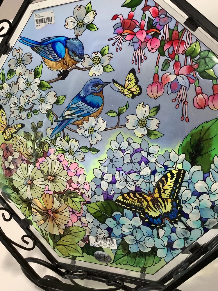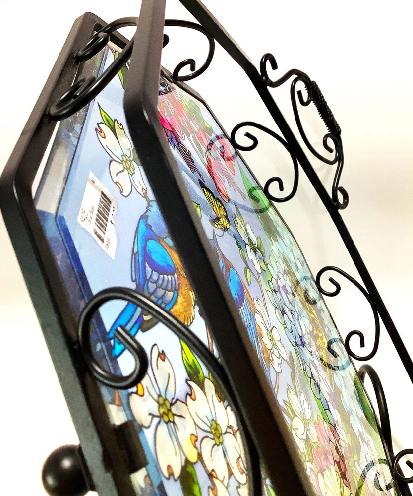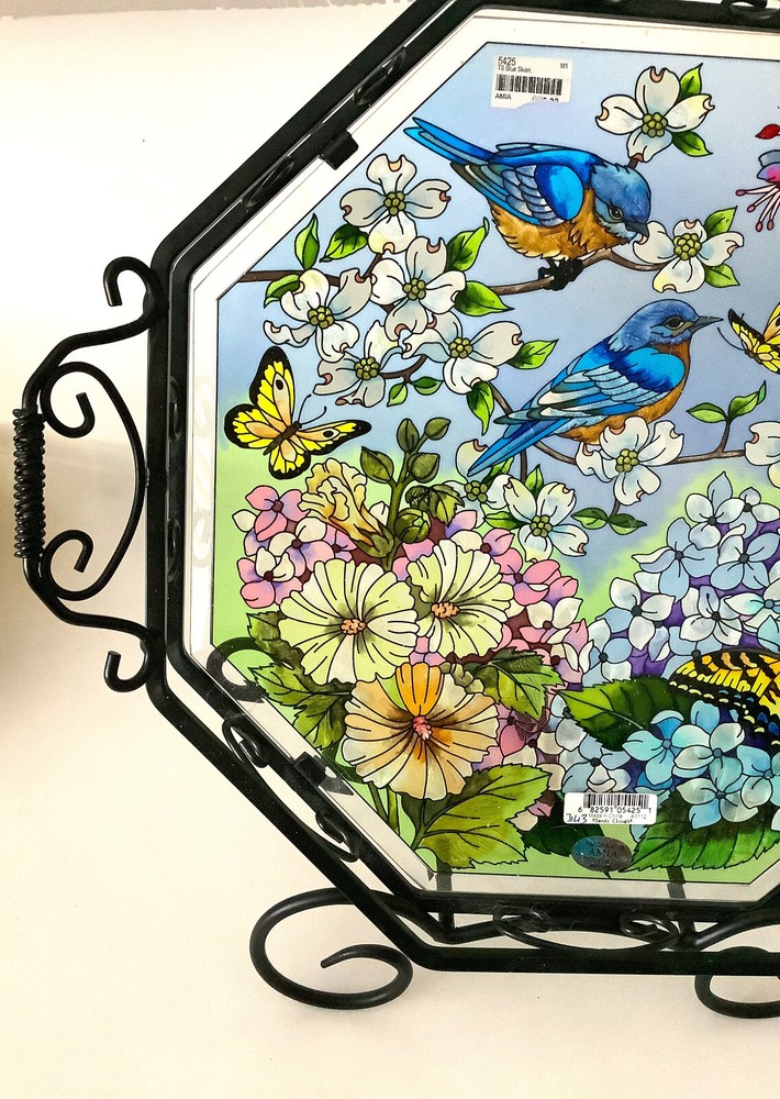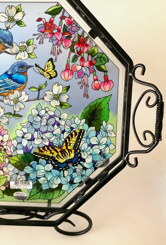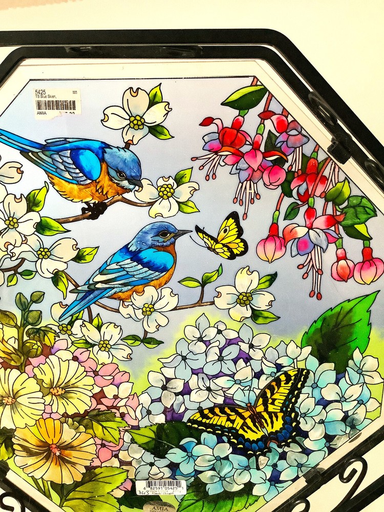 AMIA Stained Glass DISPLAY & WORKING TRAY "BLUE SKIES" with Wrought Iron Stand 15" Wide (w/ handles) x 13" Tall x 3" Deep + the stand which adds ~ 3" in height, so 16" tall in stand Weighs almost 5 pounds with the stand Item #5425 Artist - Sandy Clough The design of this tray is of bluebirds and butterflies among fuchsia,dogwood, petunia, and hydrangea flowers - beautifully captured in colorful cathedral-like glass - lots and lots of detail and gorgeous color! The glass is painted from the underside and the top surface is smooth, clear glass that is beveled around the 8 edges. (see photos)The glass is held securely in a sturdy wrought iron frame of handles, 2" sides, and 4 little round legs on the underside. There are little flourishes in the frame for aesthetics. In addition to the tray, there is a handcrafted wrought iron stand for display when not in use. This is a wonderful example of the careful attention to detail you will see in all of Amia's stained glass artwork. Its manufacture is a meticulous process of preparation of the surface, applying the world's finest colorful enamels, and firing in a kiln.. The colors are so vivid - they are separated by a process called 'TUBING' - the very thin outlines of black are slightly raised, keeping the individual colors perfectly contained. Some of the areas are clear, some translucent, some frosted, and some solid. Placed near a light or window, it will come to life and everyone is sure to comment about the details and colors in this piece. The surface of the glass is remarkable as you can see from the photos . You will see areas of dazzle, texture, sparkle.... it's gorgeous!!! Besides being a display tray, this is perfectly useful as a tray - perfect for a luncheon, tea, shower, garden party..... the glass is plenty thick and held very securely to the wrought iron frame. The original AMIA Seals are still on the tray. VERY UNIQUE ************* VERY EYE-CATCHING a Wonderful Mother's Day, Wedding Day, Housewarming Gift ... or something for YOU!!! Will be wrapped separately in lots of bubble wrap and padding and shipped in a very sturdy box. _____________ Please ask any questions BEFORE bid or purchase. We are a Non-Smoking home. We do have a cat. Unless stated, spots on photos are glare or reflections of light and/ or color of nearby objects while photographing. I sometimes show photos in different lighting, backgrounds, etc to show a detail or show how the item looks in different lighting, backgrounds, etc. Photos I have included are part of my description, as a photo can often truly describe better than what is written. SHIPPING I offer Combined Shipping . It is based on size (dimensions) of box or pouch etc, its total weight, and, where it's being sent. This seems fairer than 'formulas' I've seen that use total item quantity, using some decreasing %, etc ,and to me, this offers the BUYER the best total price. That said, some items cannot be combined, based on fragility of item(s) and safe arrival to your location, ie - no bowling balls-crystal stemware combinations. Both Ground Advantage and Priority (a bit more cost) Shipping are usually offered via USPS - it depends on how quickly you want the item. I also offer Media Mail, if appropriate. And if one of the Flat Rate Boxes/Envelopes work better, that's fine if something is heavy but small and comes in at a lower shipping cost. Because I live on the West Coast, and Shipping Costs vary so much with weight/distance, I offer shipping at Calculated Cost rather than Fixed Price. (unless it's rare exception just mentioned) I will always try to offer your item(s) at lowest cost to you - as long as the item is safe from damage - unless you specify a more expensive or different choice. I will ship same day or next-day from when order/payment is complete - it depends on time I receive Ebay's notice. I have indicated 1-day Service on EBAY's form. I do allow for 2 day ONLY if weather is a factor (I would write the buyer and explain if possible) -OR- I've need to leave for day and order came in very late night before. I will include in my listing, if an item is AVAILABLE FOR LOCAL PICKUP because of size, weight, fragility, value. Or, if it is more convenient for you, and you are nearby, I can meet you in a public place, once paid. Contact me if that works for you. I am in 98092. I offer returns, IF item is returned in the same condition as it was sent to you. PRICING I try to offer the Buyer a good deal, competitively priced (through research and/or checking other similar items listed, and Ebay's Price guide). If you really want item, or think i might take a lower offer (where OR BEST OFFER is available), feel free to offer, there are always counteroffers. If I have something unique or particularly valuable, I take that into consideration or may have gotten advice from a better authority than myself in pricing. Most items are comparable to what else is similar online. However, you will often find some items in my listings that are quite inexpensively priced -Things I know nothing about (and don't want to), things that could be considered nice for a garage sale or estate sale but would rather do on eBAY.... or because I would love to sell to someone who wants/ can use - and then I no longer have in storage or taking room in my house. WIN/WIN FOR EVERYONE!!!! *************************************************************************************************************************************************** Thanks so much, and HAPPY EBAYING!