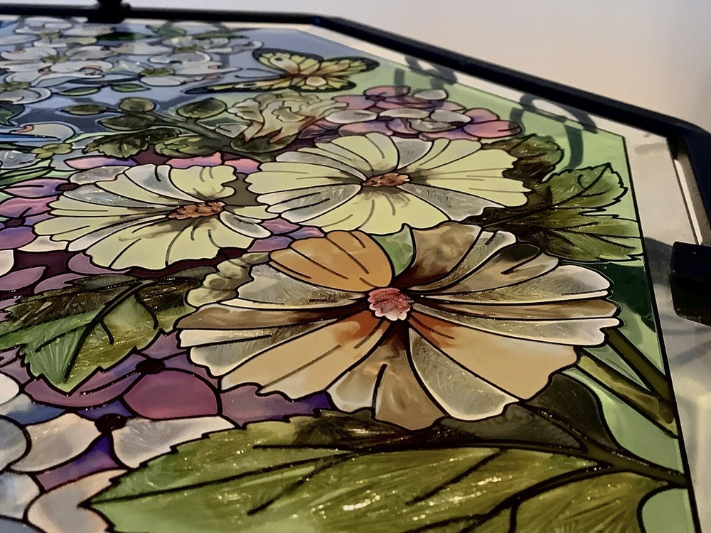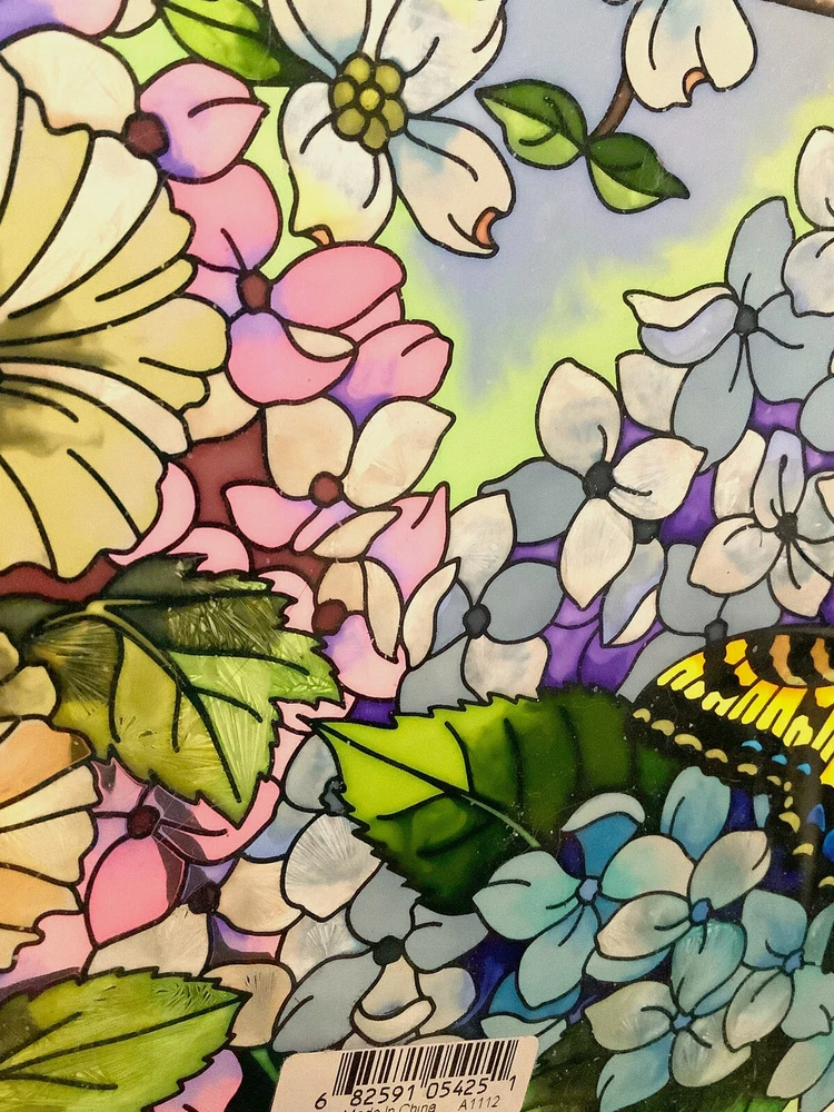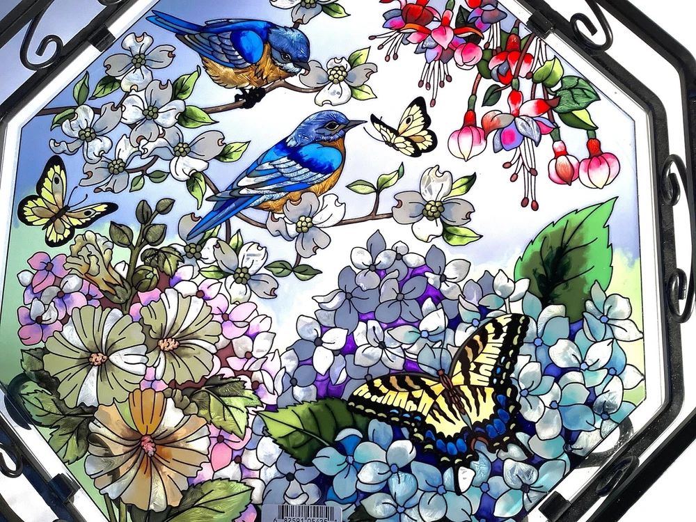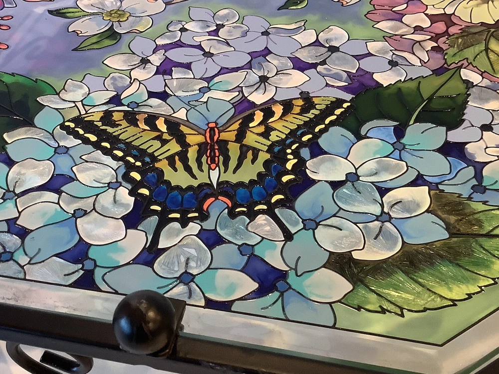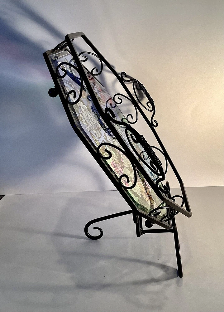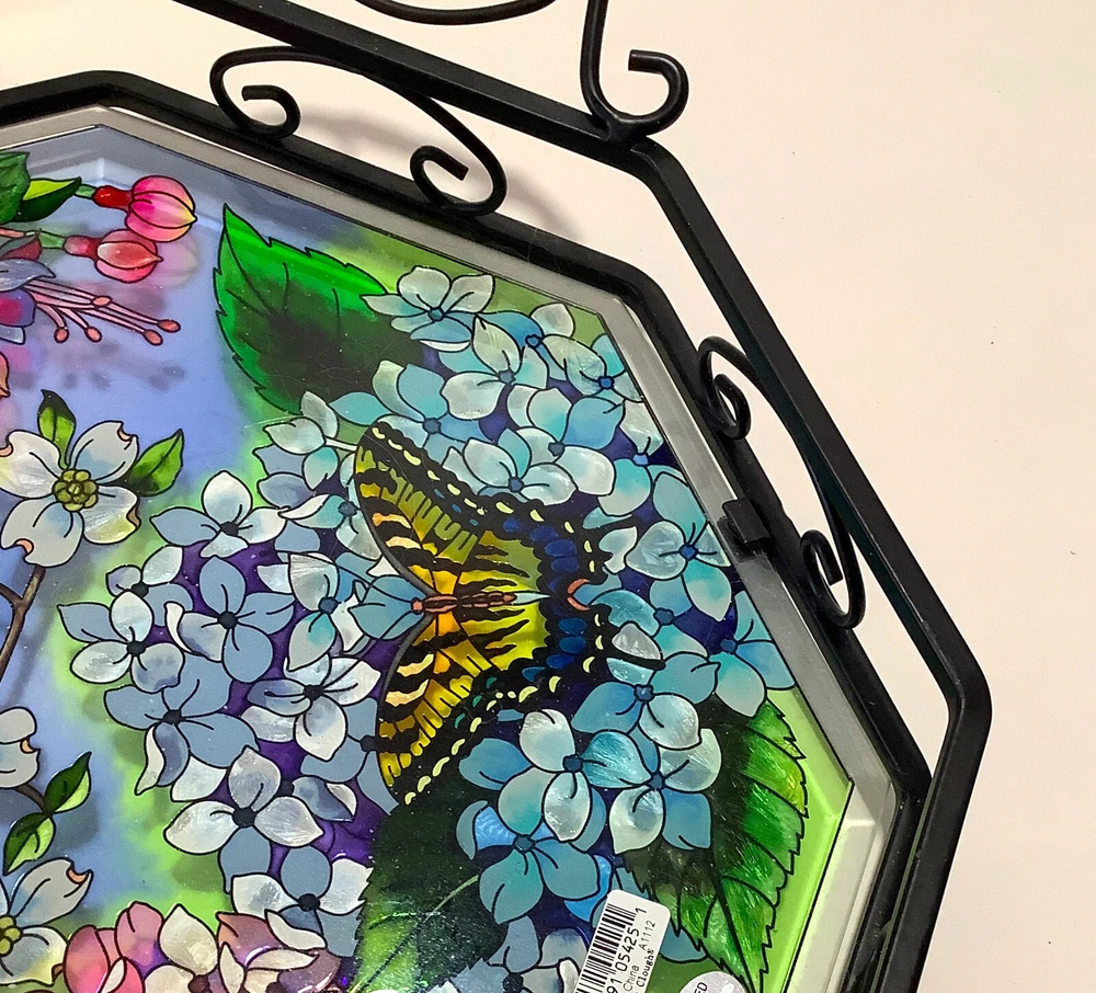 AMIA Stained Glass DISPLAY & WORKING TRAY "BLUE SKIES" with Wrought Iron Stand 15" Wide (w/ handles) x 13" Tall x 3" Deep + the stand which adds ~ 3" in height, so 16" tall in stand Weighs almost 5 pounds with the stand Item #5425 Artist - Sandy Clough The design of this tray is of bluebirds and butterflies among fuchsia,dogwood, petunia, and hydrangea flowers - beautifully captured in colorful cathedral-like glass - lots and lots of detail and gorgeous color! The glass is painted from the underside and the top surface is smooth, clear glass that is beveled around the 8 edges. (see photos)The glass is held securely in a sturdy wrought iron frame of handles, 2" sides, and 4 little round legs on the underside. There are little flourishes in the frame for aesthetics. In addition to the tray, there is a handcrafted wrought iron stand for display when not in use. This is a wonderful example of the careful attention to detail you will see in all of Amia's stained glass artwork. Its manufacture is a meticulous process of preparation of the surface, applying the world's finest colorful enamels, and firing in a kiln.. The colors are so vivid - they are separated by a process called 'TUBING' - the very thin outlines of black are slightly raised, keeping the individual colors perfectly contained. Some of the areas are clear, some translucent, some frosted, and some solid. Placed near a light or window, it will come to life and everyone is sure to comment about the details and colors in this piece. The surface of the glass is remarkable as you can see from the photos . You will see areas of dazzle, texture, sparkle.... it's gorgeous!!! Besides being a display tray, this is perfectly useful as a tray - perfect for a luncheon, tea, shower, garden party..... the glass is plenty thick and held very securely to the wrought iron frame. The original AMIA Seals are still on the tray. VERY UNIQUE ************* VERY EYE-CATCHING a Wonderful Mother's Day, Wedding Day, Housewarming Gift ... or something for YOU!!! Will be wrapped separately in lots of bubble wrap and padding and shipped in a very sturdy box. _____________ Please ask any questions BEFORE bid or purchase. We are a Non-Smoking home. We do have a cat. Unless stated, spots on photos are glare or reflections of light and/ or color of nearby objects while photographing. I sometimes show photos in different lighting, backgrounds, etc to show a detail or show how the item looks in different lighting, backgrounds, etc. Photos I have included are part of my description, as a photo can often truly describe better than what is written. SHIPPING I offer Combined Shipping . It is based on size (dimensions) of box or pouch etc, its total weight, and, where it's being sent. This seems fairer than 'formulas' I've seen that use total item quantity, using some decreasing %, etc ,and to me, this offers the BUYER the best total price. That said, some items cannot be combined, based on fragility of item(s) and safe arrival to your location, ie - no bowling balls-crystal stemware combinations. Both Ground Advantage and Priority (a bit more cost) Shipping are usually offered via USPS - it depends on how quickly you want the item. I also offer Media Mail, if appropriate. And if one of the Flat Rate Boxes/Envelopes work better, that's fine if something is heavy but small and comes in at a lower shipping cost. Because I live on the West Coast, and Shipping Costs vary so much with weight/distance, I offer shipping at Calculated Cost rather than Fixed Price. (unless it's rare exception just mentioned) I will always try to offer your item(s) at lowest cost to you - as long as the item is safe from damage - unless you specify a more expensive or different choice. I will ship same day or next-day from when order/payment is complete - it depends on time I receive Ebay's notice. I have indicated 1-day Service on EBAY's form. I do allow for 2 day ONLY if weather is a factor (I would write the buyer and explain if possible) -OR- I've need to leave for day and order came in very late night before. I will include in my listing, if an item is AVAILABLE FOR LOCAL PICKUP because of size, weight, fragility, value. Or, if it is more convenient for you, and you are nearby, I can meet you in a public place, once paid. Contact me if that works for you. I am in 98092. I offer returns, IF item is returned in the same condition as it was sent to you. PRICING I try to offer the Buyer a good deal, competitively priced (through research and/or checking other similar items listed, and Ebay's Price guide). If you really want item, or think i might take a lower offer (where OR BEST OFFER is available), feel free to offer, there are always counteroffers. If I have something unique or particularly valuable, I take that into consideration or may have gotten advice from a better authority than myself in pricing. Most items are comparable to what else is similar online. However, you will often find some items in my listings that are quite inexpensively priced -Things I know nothing about (and don't want to), things that could be considered nice for a garage sale or estate sale but would rather do on eBAY.... or because I would love to sell to someone who wants/ can use - and then I no longer have in storage or taking room in my house. WIN/WIN FOR EVERYONE!!!! *************************************************************************************************************************************************** Thanks so much, and HAPPY EBAYING!