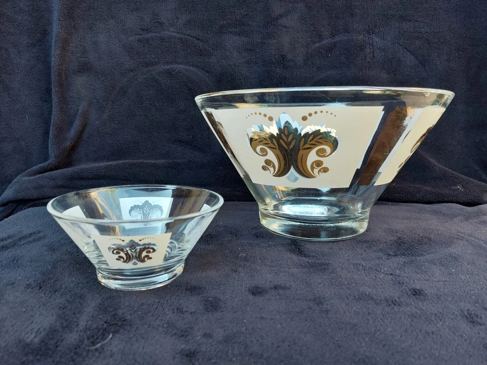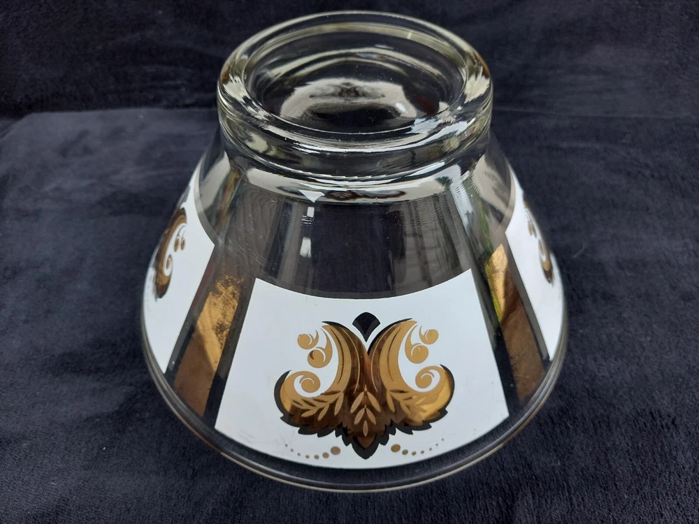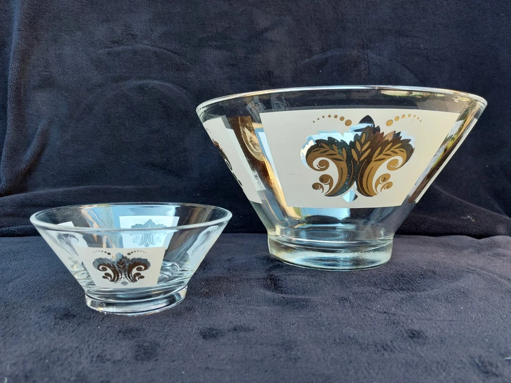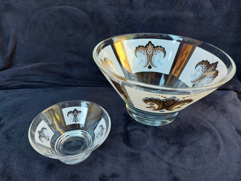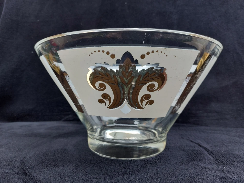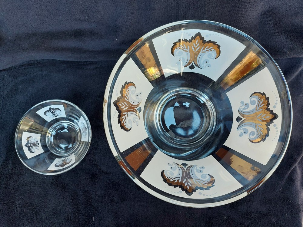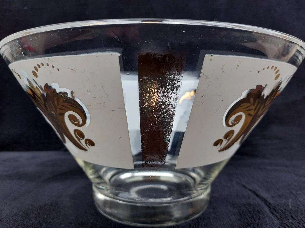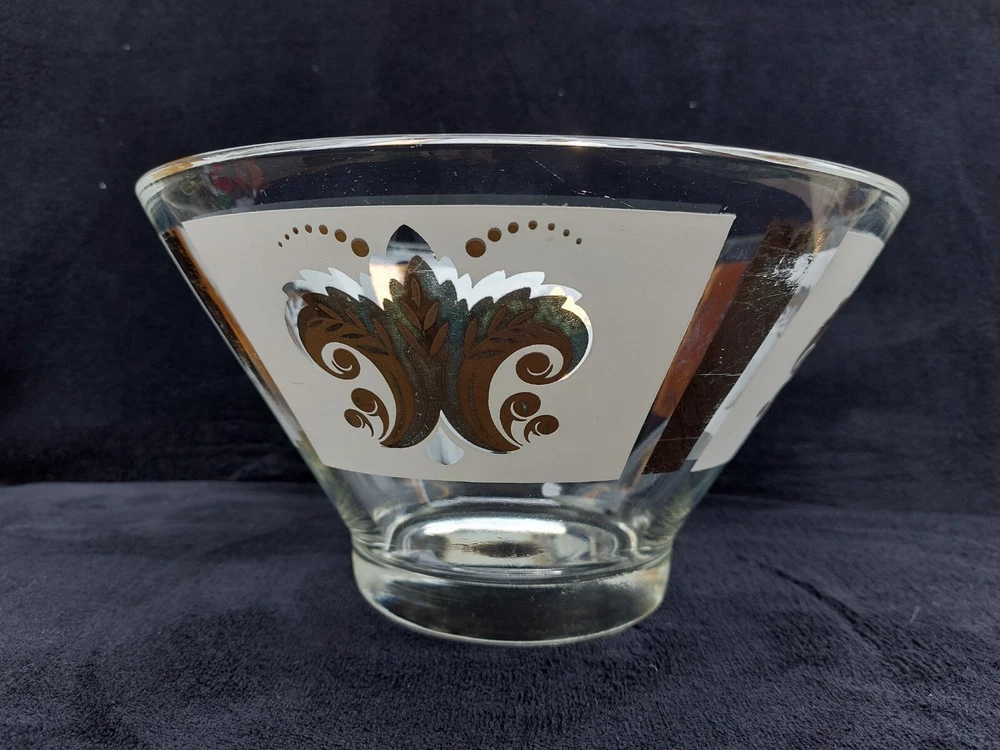 ANCHOR HOCKING FLEUR DE LIS LARGE SERVING CHIP & DIP BOWL. LARGE BOWL-VERY GOOD CONDITION, HOWEVER, SOME GOLD AND WHITE HAVE BEEN RUBBED OFF. THE LARGE BOWL MEASURES 10 1/4" ACROSS AND 6" TALL. THE SMALL BOWL IS IN VERY GOOD CONDITION. THE METAL BRACKET THAT HOLDS THE DIP BOWL IS NOT INCLUDED. (PLEASE DON'T WASH THIS IN A DISHWASHER, IT RUINS THE PAINTED PATTERN) Please see the pictures to see the condition. This is being sold as is with no returns, so please look at the pictures carefully for additional details and condition. Any questions or if you want more photos, please ask. I will ship to the continental US only. Payment required at the time of purchase, I will ship out promptly upon payment. Thank you