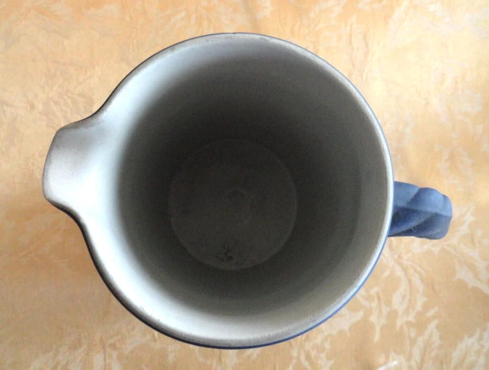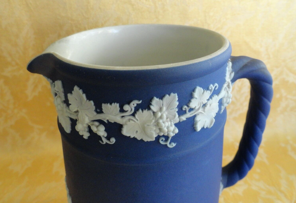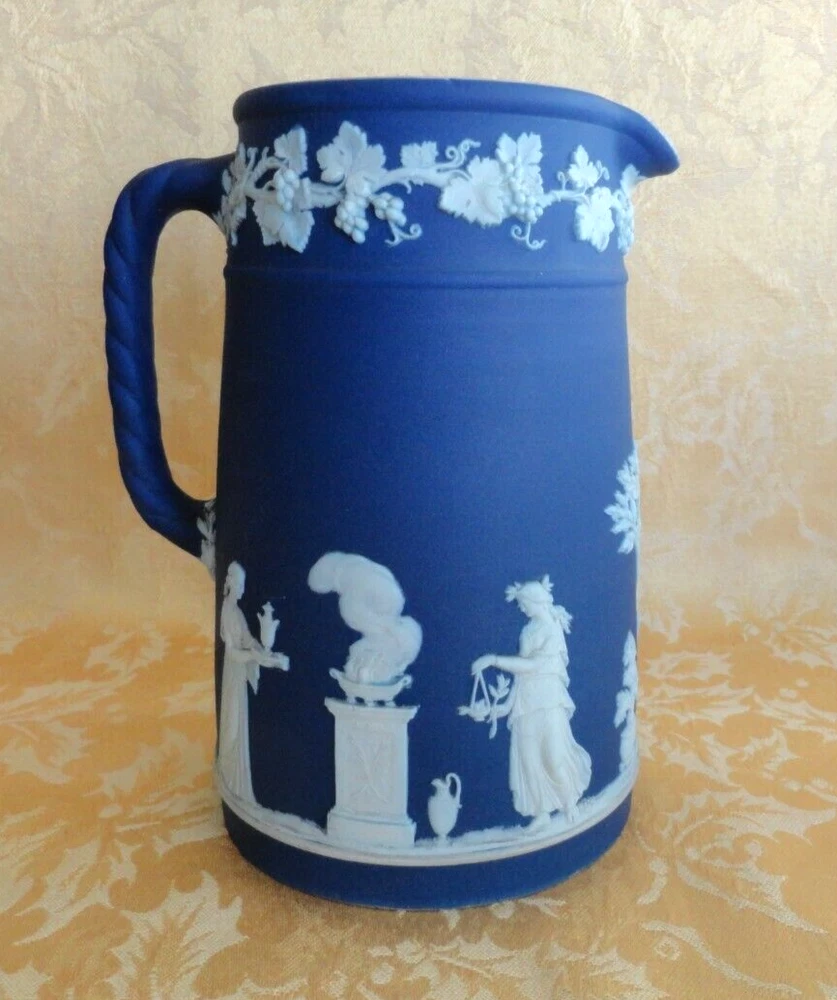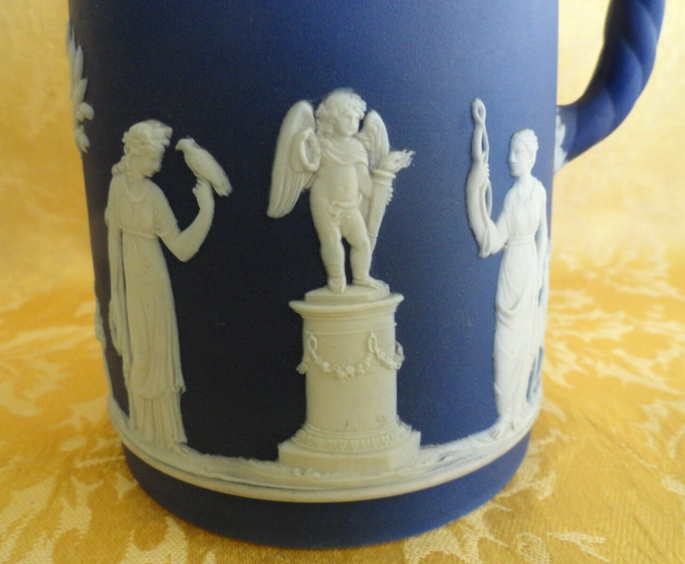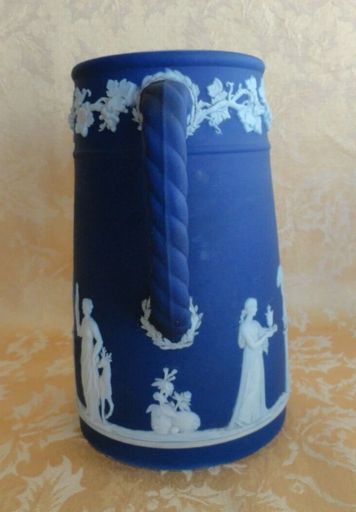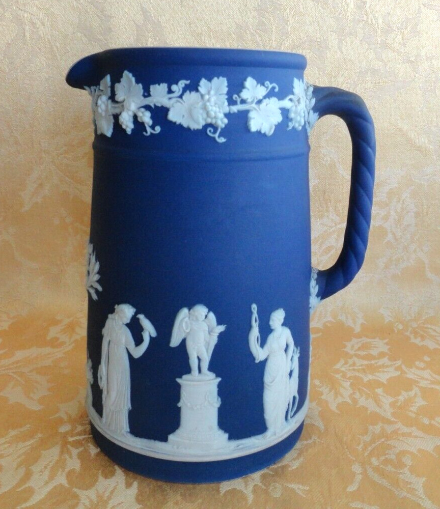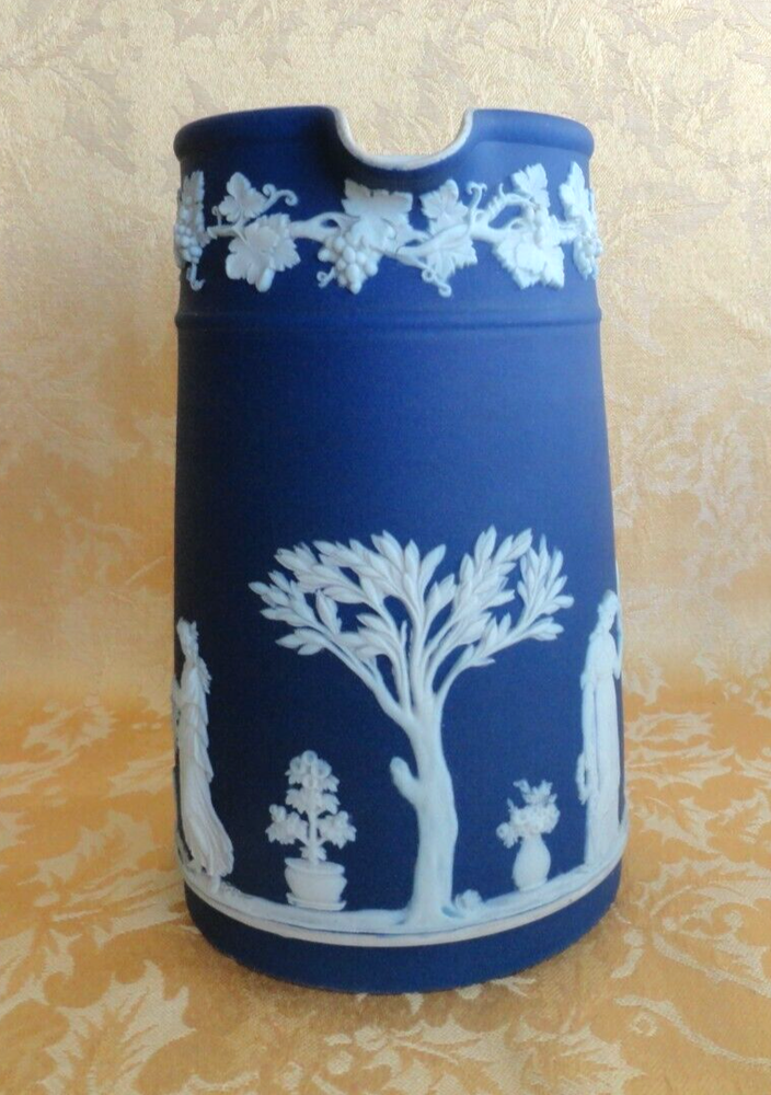 ANTIQUE WEDGWOOD "DIPPED" WHITE ON BLUE JASPERWARE PITCHER ENGLAND Ca. 1875 This early victorian wedgwood portland blue jasperware neoclassical cameo pitcher/Jar is decorated with Classic Greek Designs separated by trees in White Bas Relief. Marked sigle letter and "Wedgwood" date from 1860. Measures approx. 6 1/2" t all, 5 3/8" wide from handle to spout, 4" in diameter. In very good used condition, no chips or cracks or crazing . A few wears at rim. Please view all pictures as they serve as part of the description. If there acquisition is anything I can do to make this a great for you, please let me know. My goal is a happy customer which shows up by a 5 star feedback from you. If you feel you can not leave me positive feedback and a 5 star rating in all categories, please contact me for a happy resolution. I am very easy to work with. Returns are accepted within 30 days, buyer pays for return shipping unless I have made an error in the listing. CHECK OUT THE OTHER ITEMS I HAVE LISTED. WE WILL COMBINE SHIPPING IF POSSIBLE to save you money. If you purchase multiple items, please wait for an invoice to be sent out, as sometimes EBay does not calculate the cost accurately. Thank you and have fun bidding!
