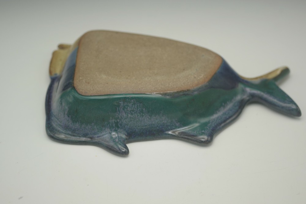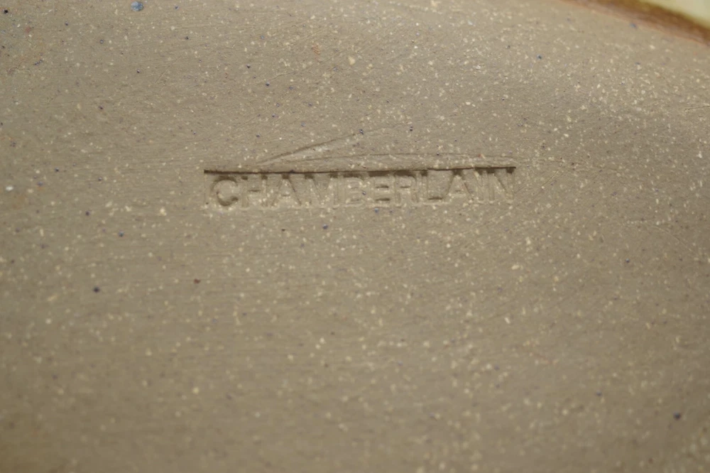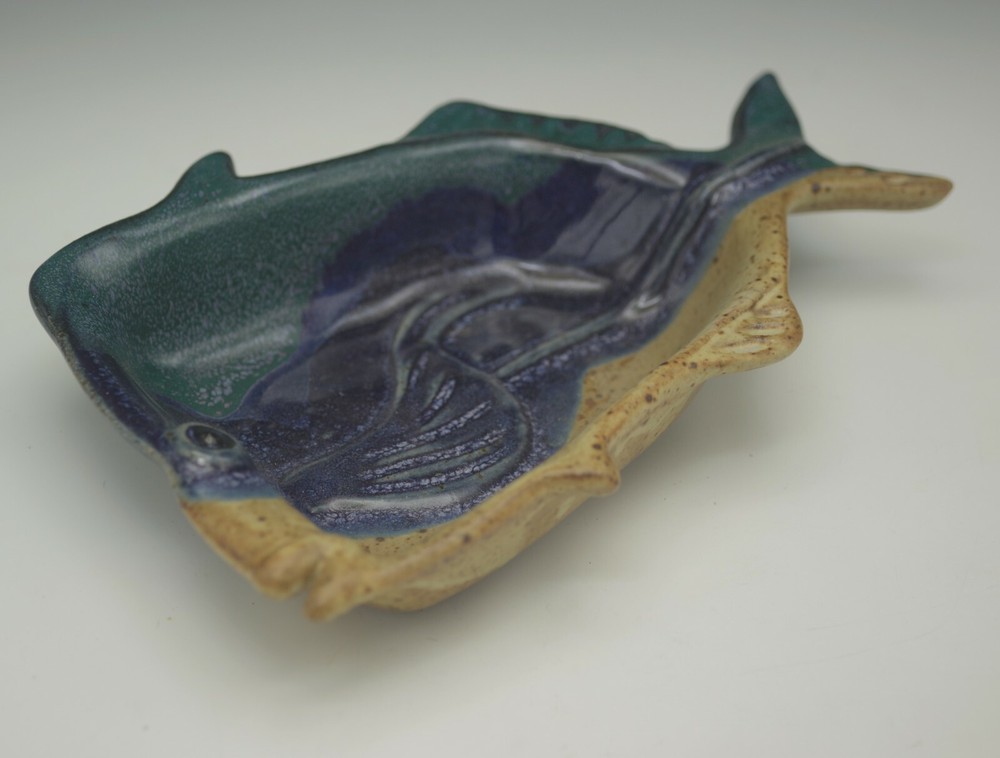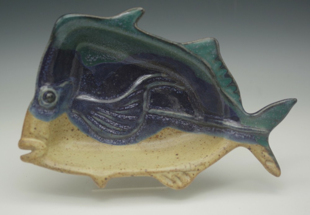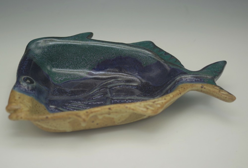 HELLO AND WELCOME TO MY STORE FOR SALE TOM CHAMBERLAIN, MARKED, STUDIO ART POTTERY FISH SHAPED BOWL MEASURES APPROX: 10" LONG BY 6.3/4" WIDE *AT THE WIDEST* IN VERY GOOD CONDITION THANK YOU FOR LOOKING OF.SHELF