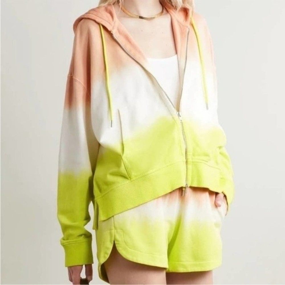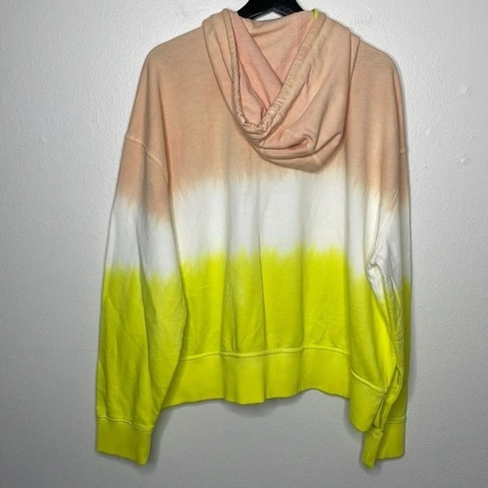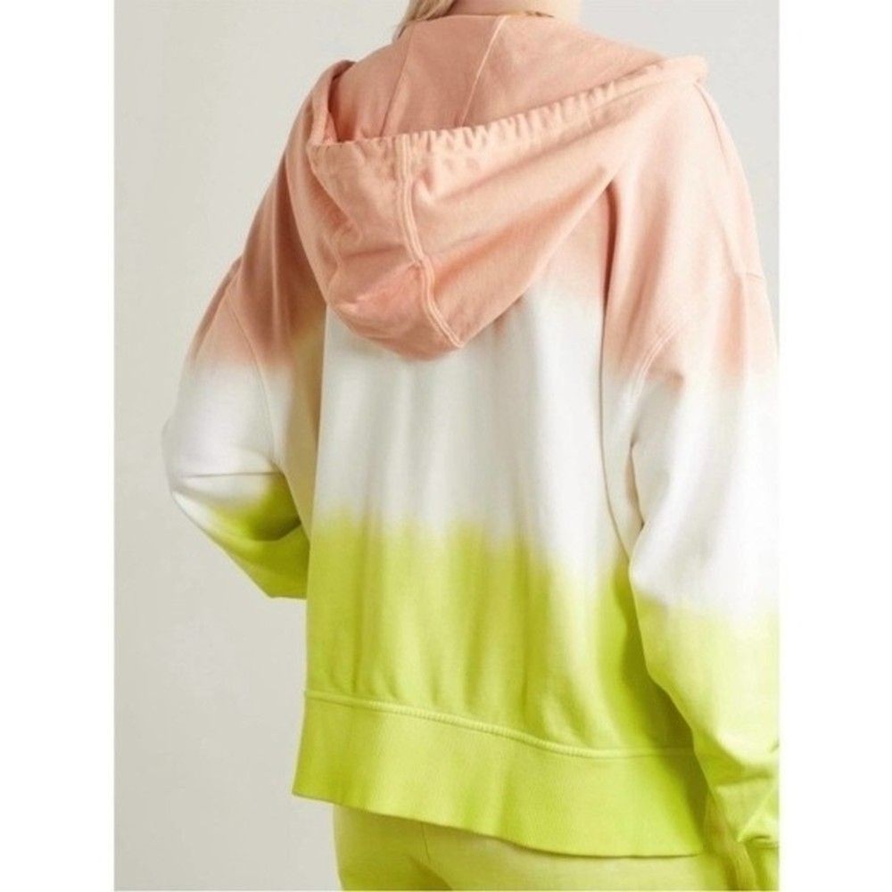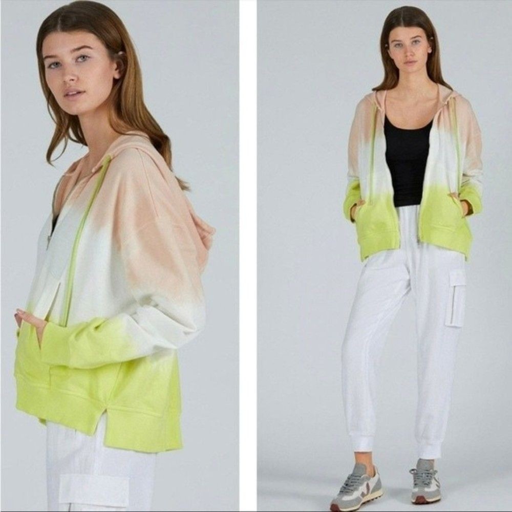 Like a sunrise you can wear, this dip-dyed French terry hoodie brings happy hues and cozy feelings to your day. 22" length (size Medium/Large) Front zip closure Drawstring hood Split kangaroo pocket 100% cotton Hand wash, dry flat Made in Peru True to size. XS/S=0-4, M/L=6-10. Approx measurements laying flat: Pit to Pit: 28.5” Pit to Hem: 13” Shoulder to Hem: 23.5” E 0988
