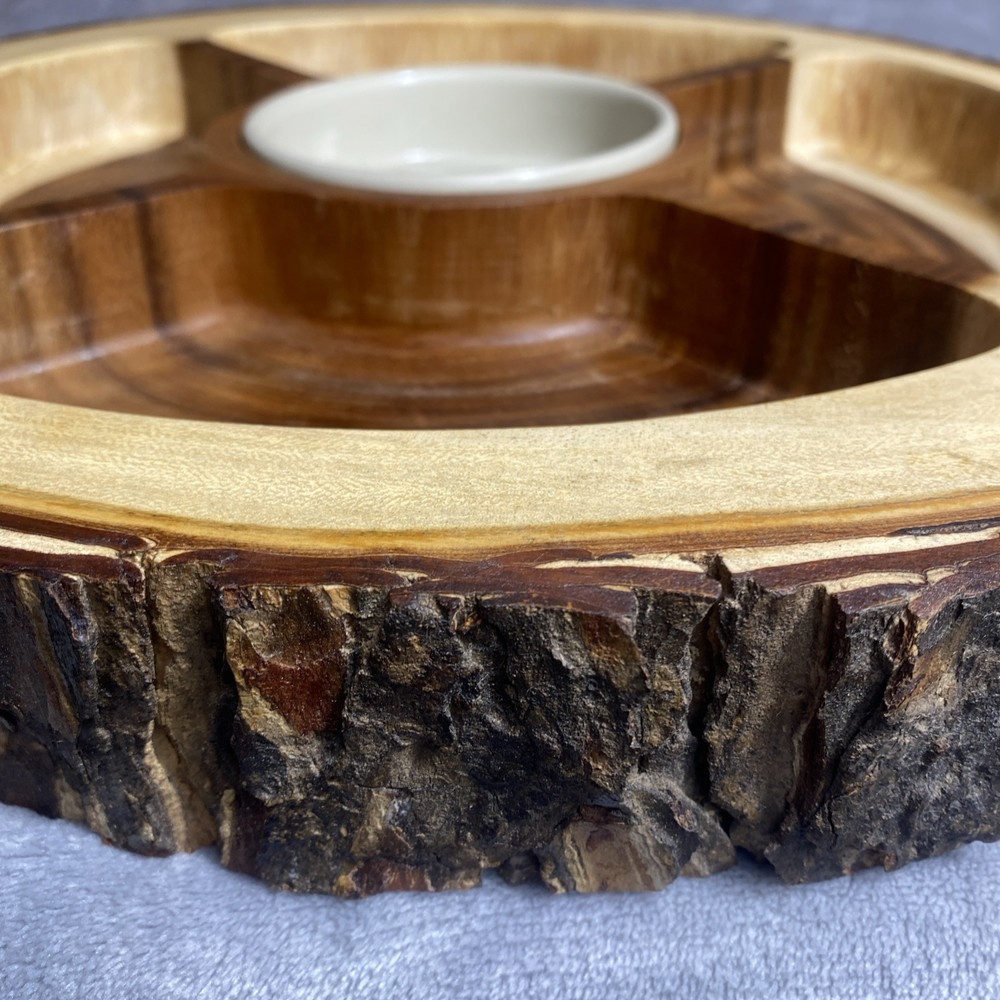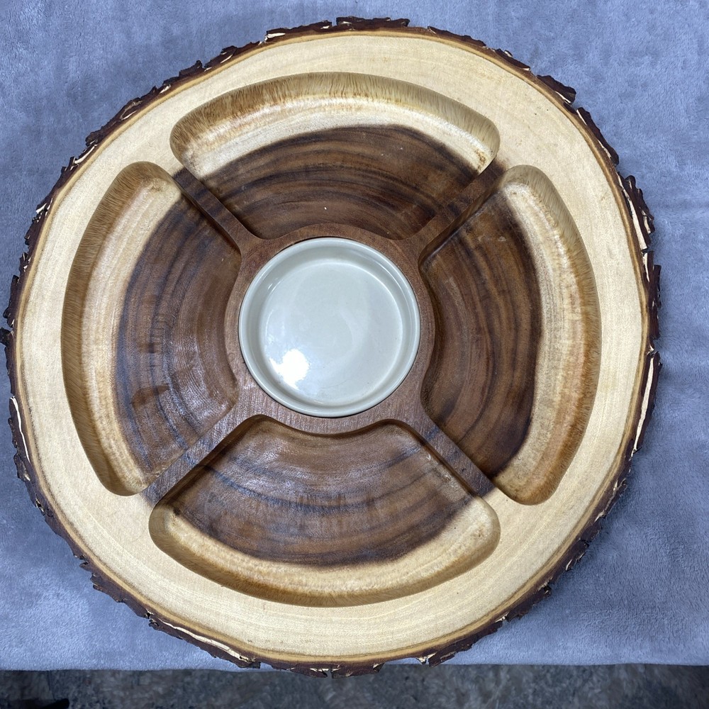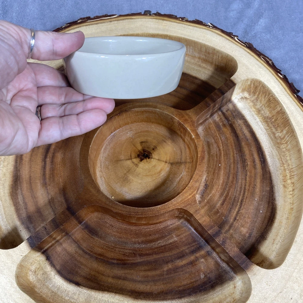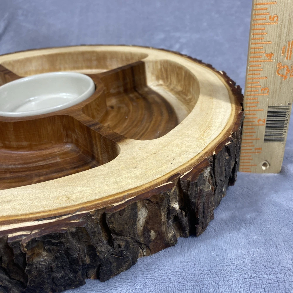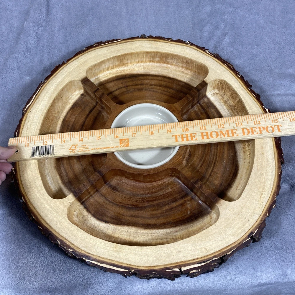 This Acacia Bark Raw Edge Dipping Platter is a large, round-ish serving dish made from medium brown wood with a farmhouse style. Use it for serving dips, appetizers, or any other snacks in a stylish a...