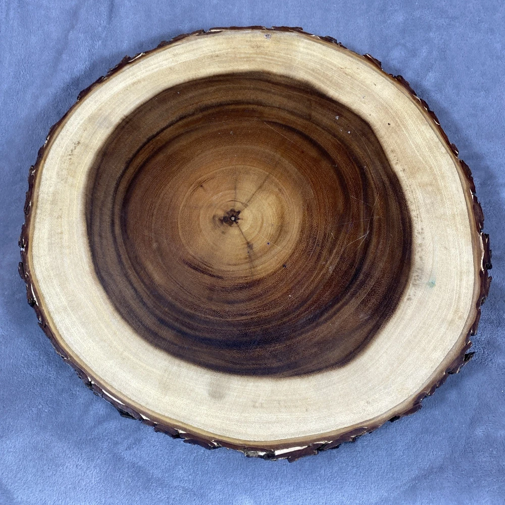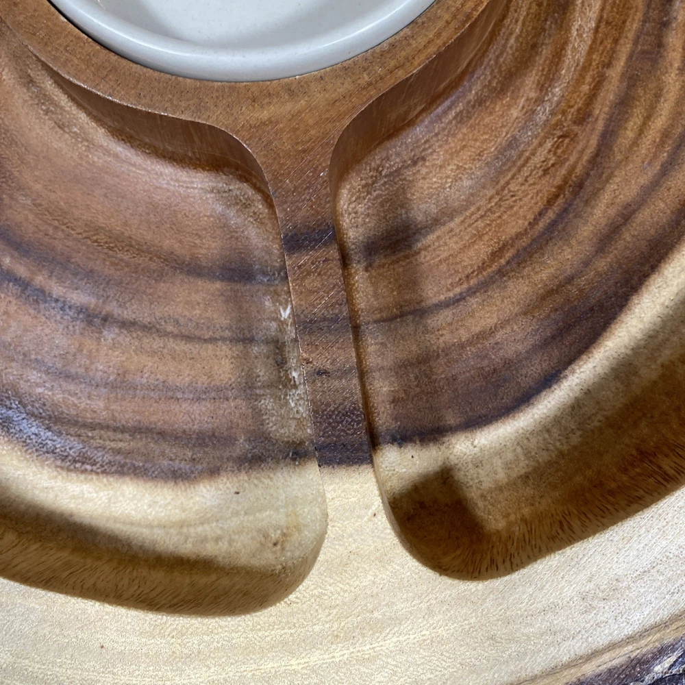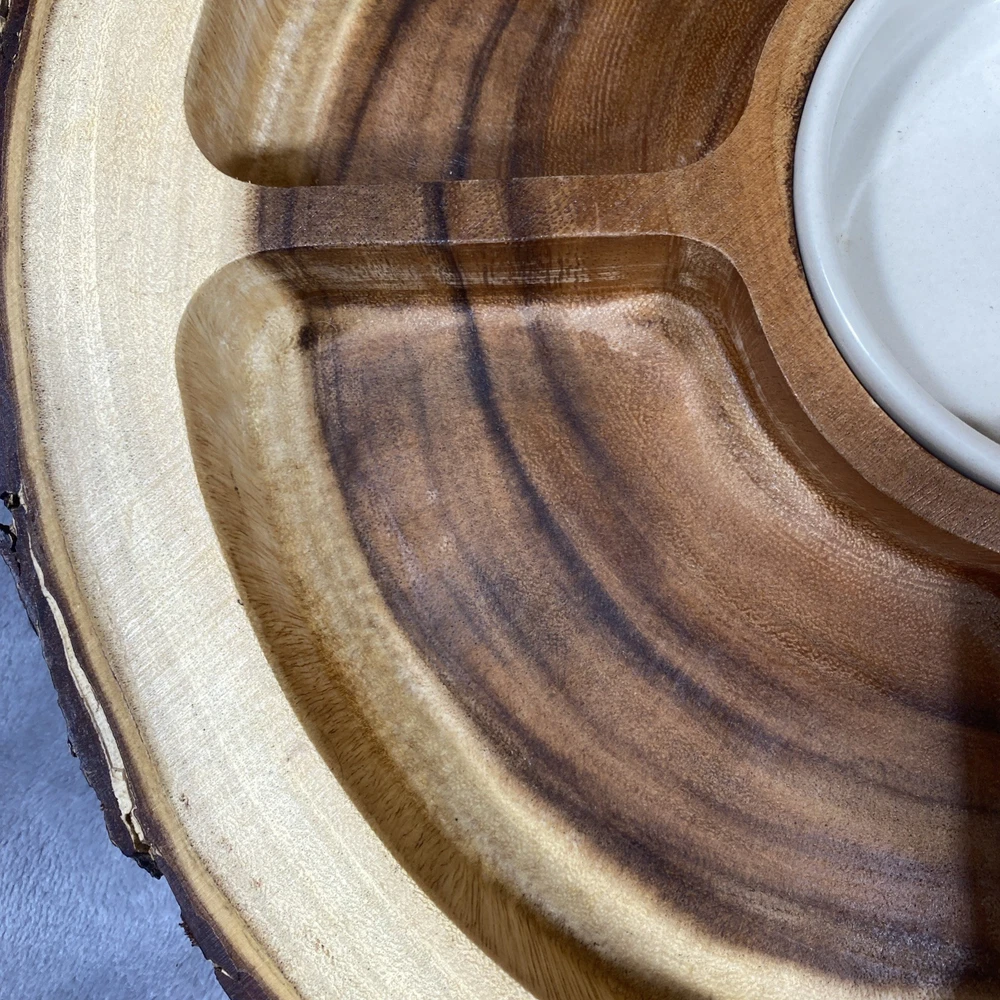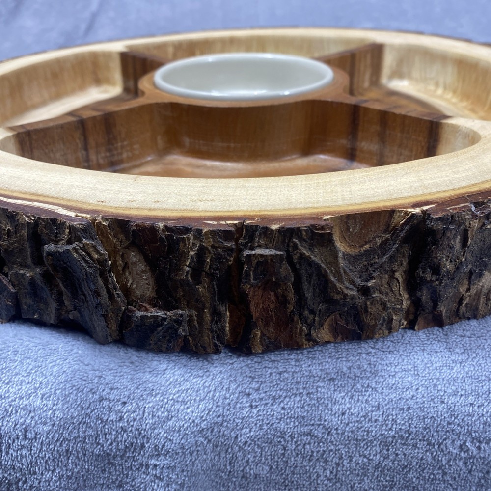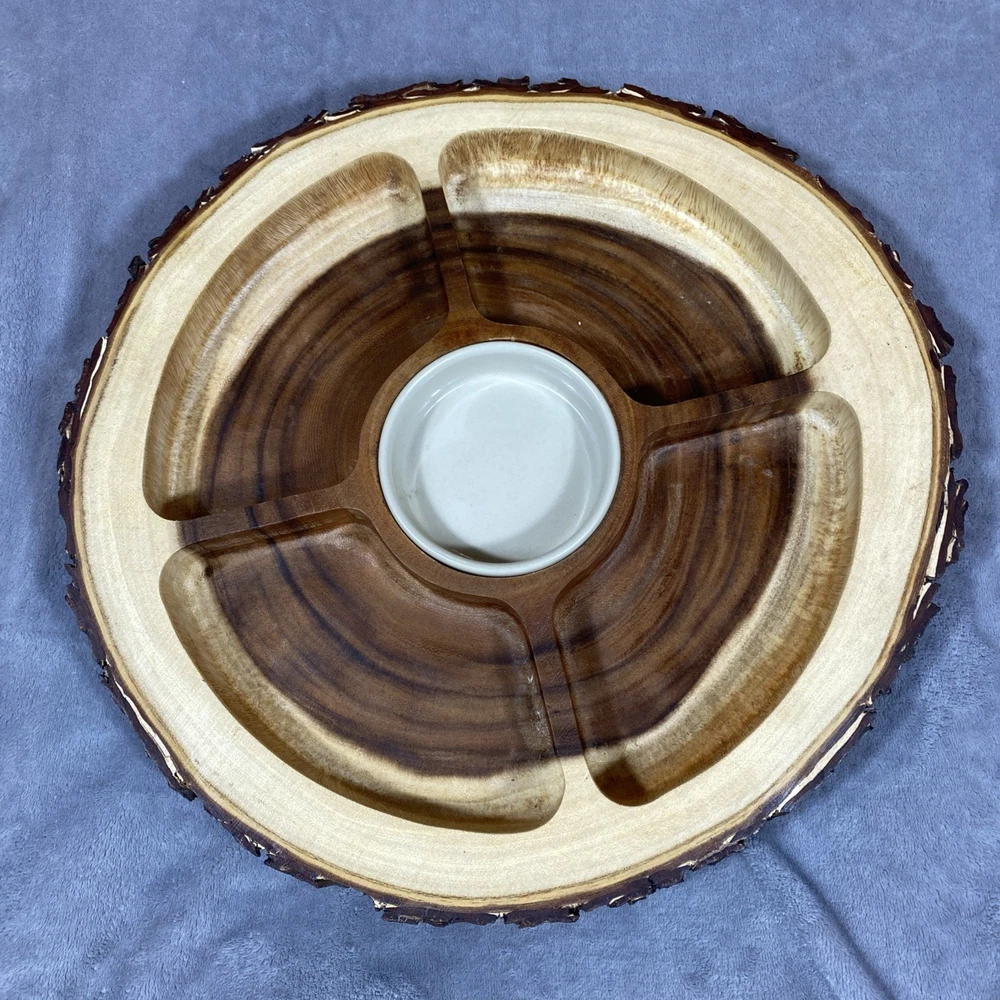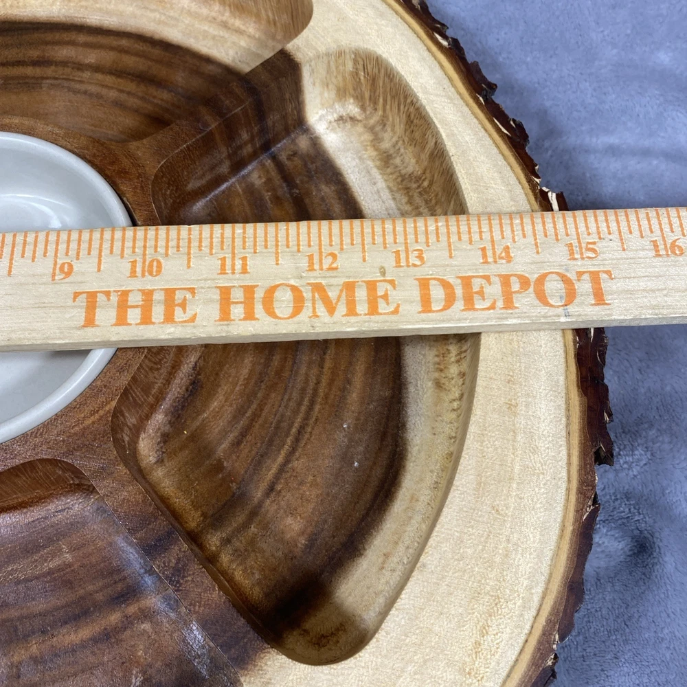 This Acacia Bark Raw Edge Dipping Platter is a large, round-ish serving dish made from medium brown wood with a farmhouse style. Use it for serving dips, appetizers, or any other snacks in a stylish a...