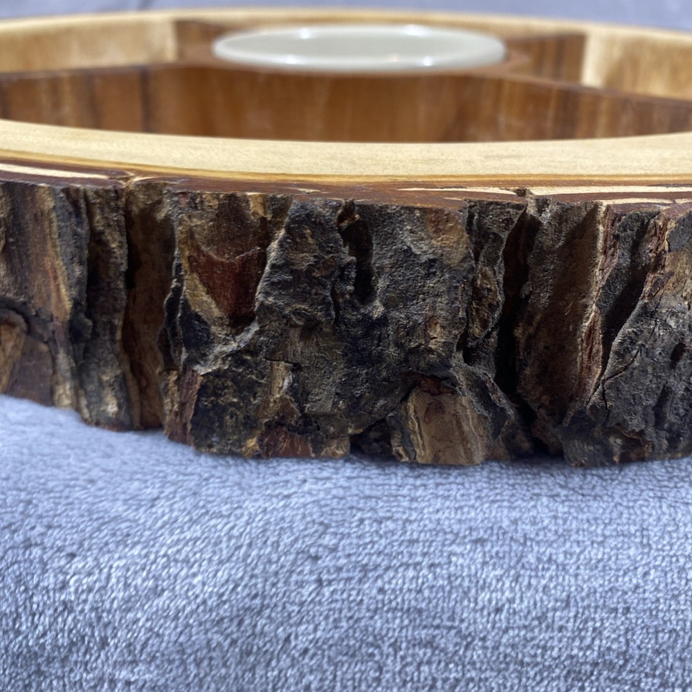 This Acacia Bark Raw Edge Dipping Platter is a large, round-ish serving dish made from medium brown wood with a farmhouse style. Use it for serving dips, appetizers, or any other snacks in a stylish and rustic way.