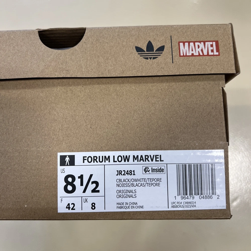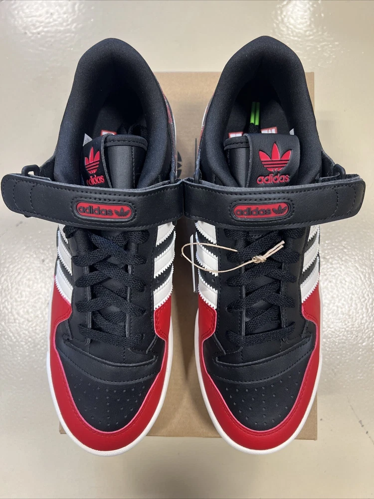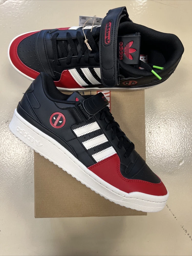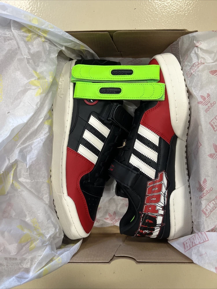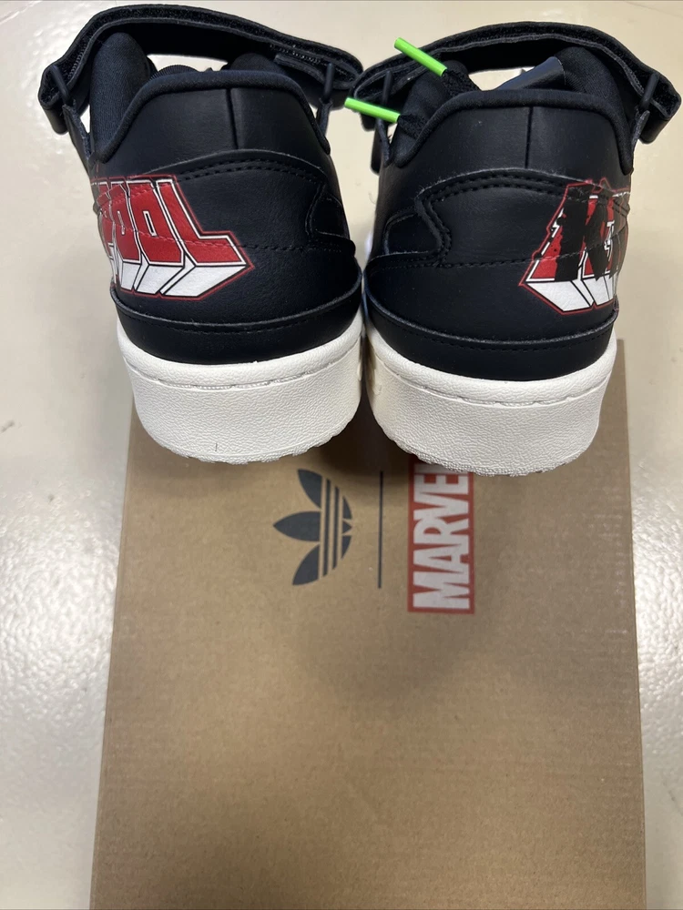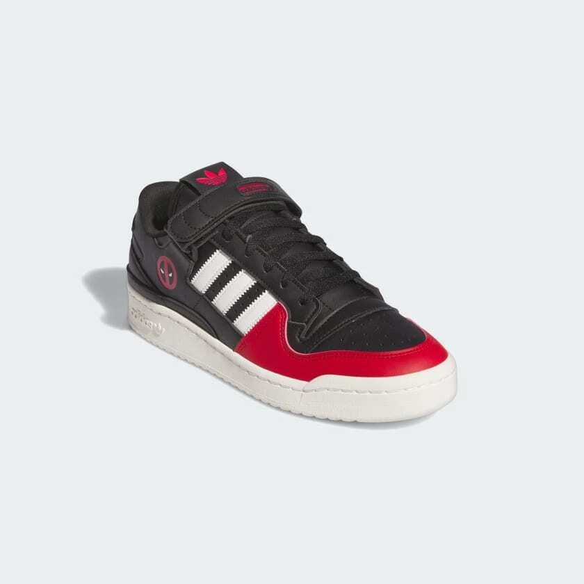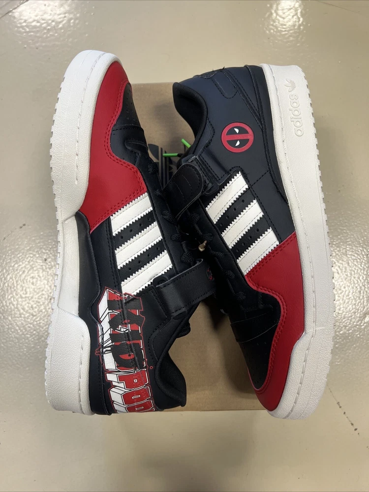 Retro hoops low-tops featuring bold Marvel superhero identity. Step into these Forum Low sneakers, a design collaboration between adidas and Disney's Marvel. Colors and details are inspired by comic book anti-hero Deadpool, including the character's circular logo on one side and a large "Kidpool" graphic on the other. The synthetic, textile-lined upper has laces and hook-and-loop straps for a customizable fit. The rubber outsole provides traction so you can move with the agility of your favorite character from the Marvel universe. SPECIFICATIONS Regular fit Lace closure with hook-and-loop strap Synthetic upper Textile lining Rubber outsole Imported Product color: Core Black / Off White / Team Power Red 2 Product code: JR2481