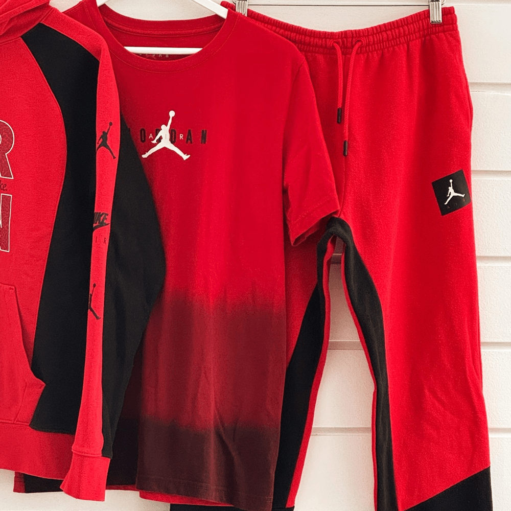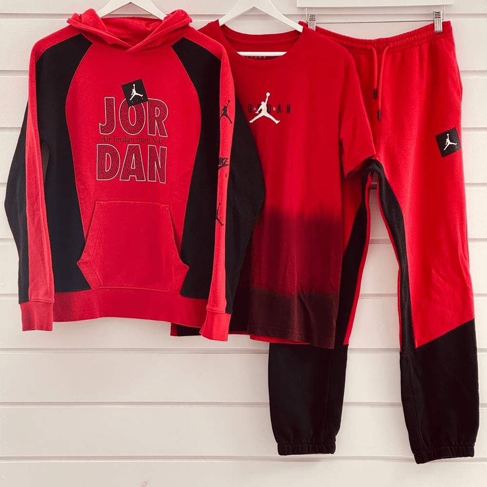 Air Jordan Boys Remastered Fleece Sweatshirt/Joggers Set & Dip-Dye Tee In Red Size Boys XL 13-15 years Good condition - no stains or tears. Has some wash wear and minor pilling. Tee is in very good condition Air Jordan Boy's Dip-Dye T-Shirt In Gym Red Signature graphic print on the upper front with a crew neckline and short-sleeve detailing. Regular fit. Pullover style. Straight hemline. 100% cotton. Air Jordan Remastered Fleece Pants Standard fit for a relaxed, easy feel. 60% Cotton, 40% Polyester Machine Wash Imported Fire Red Air Jordan Remastered Fleece Sweatshirt Hoodie Kangaroo pocket holds your small essentials. Soft fleece feels cozy and comfy. Standard fit for a relaxed, easy feel. 60% Cotton, 40% Polyester Machine Wash Imported Approximate measurements: (double when appropriate) Pit to pit 19.5" Top to hem 25"