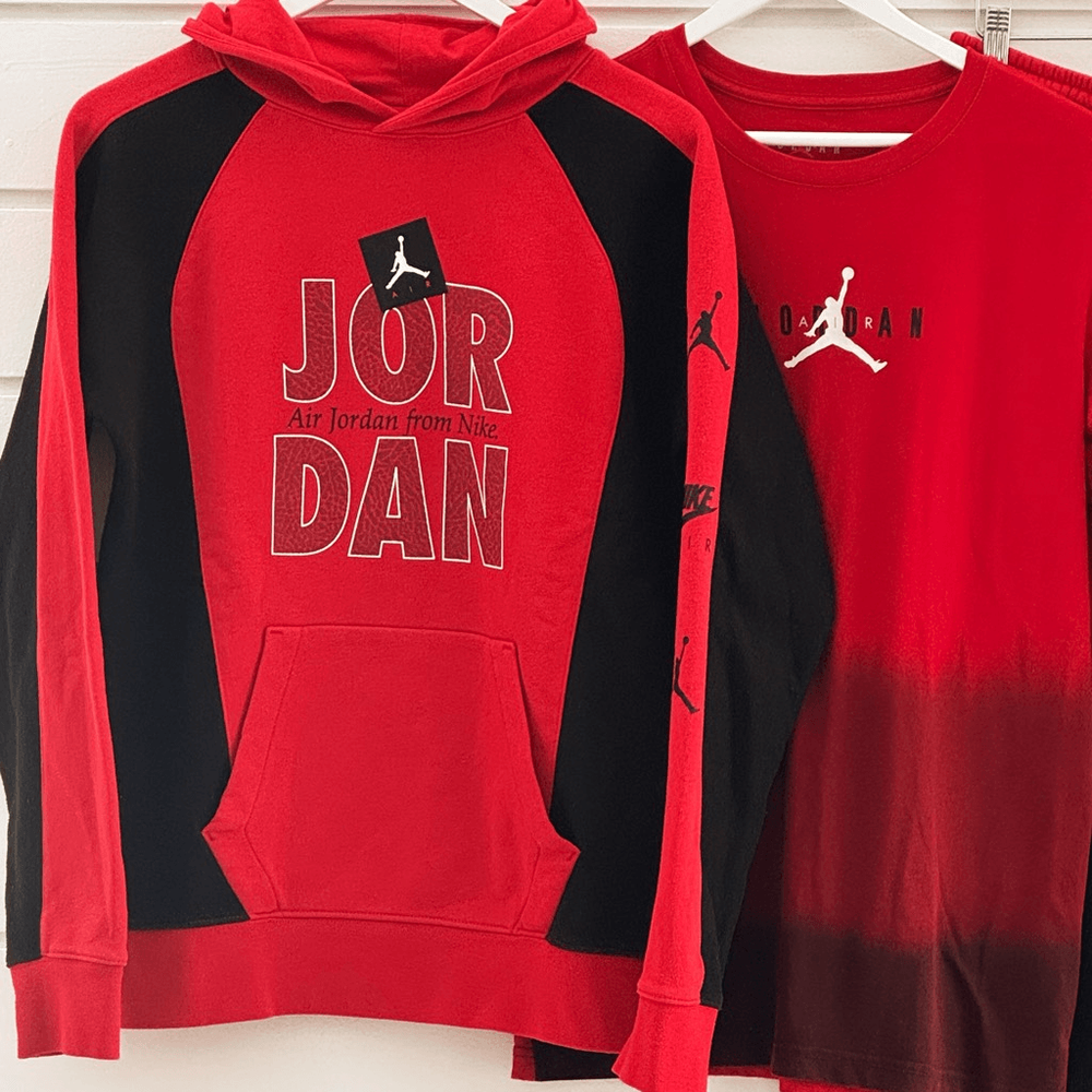 This Air Jordan set is a steal! The fleece sweatshirt and joggers are super comfy with just minor wear, while the dip-dye tee looks fresh with its bold graphic. Perfect for active boys who want style and comfort—great condition for the price!