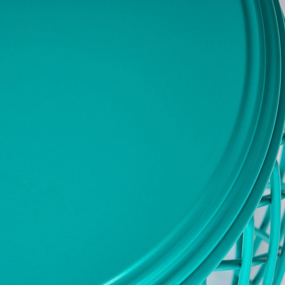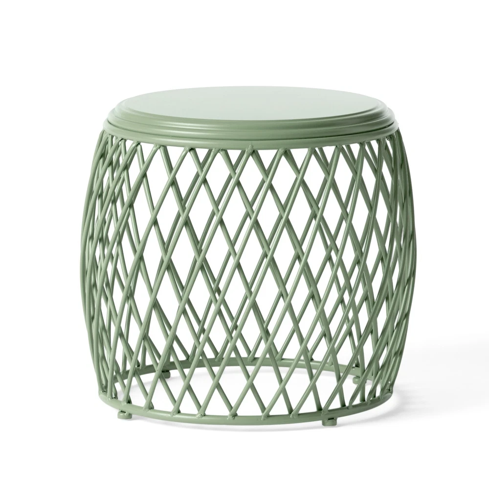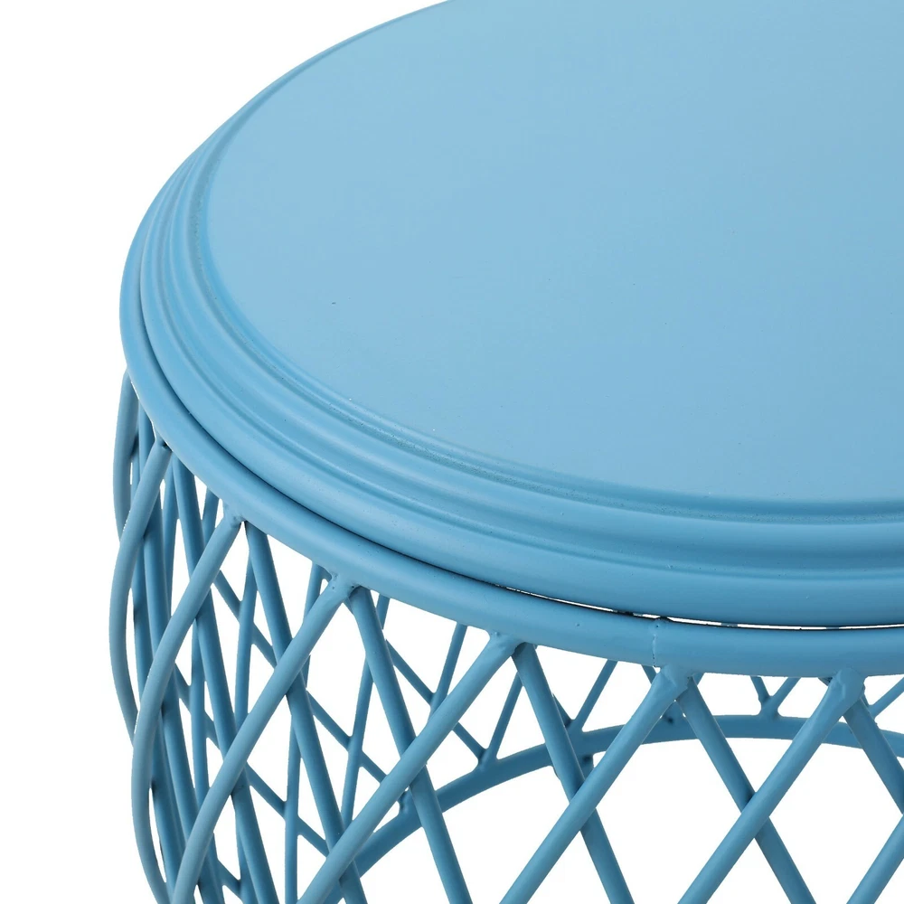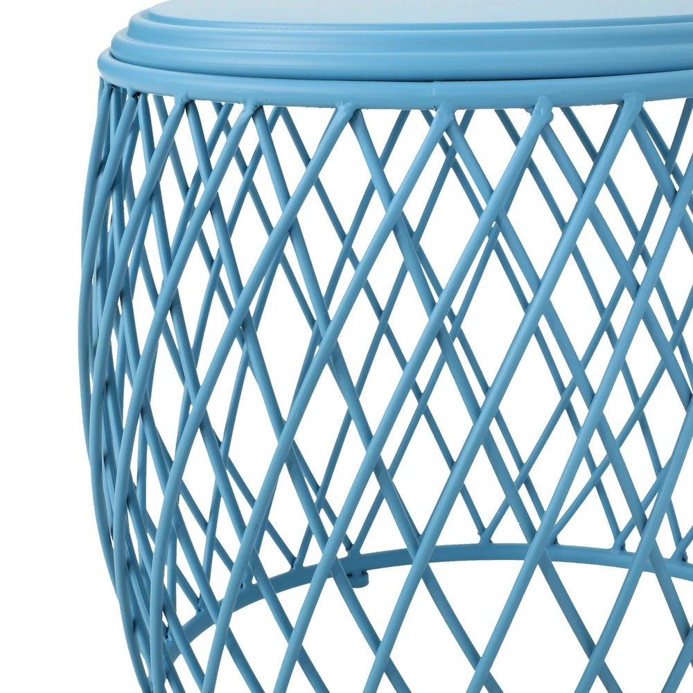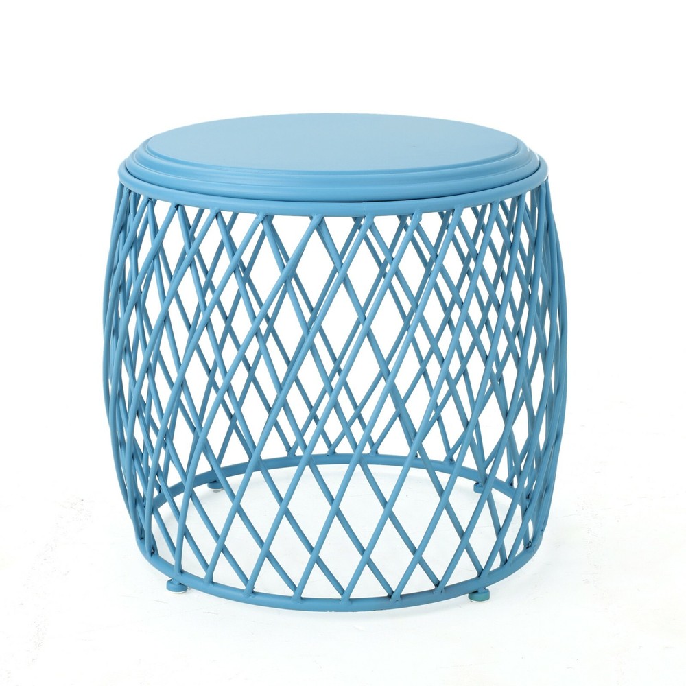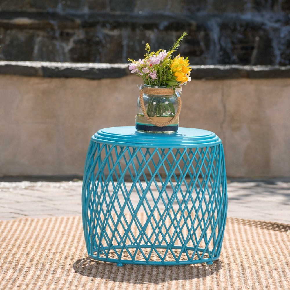 This side table is a wonderful way to add some color to your patio. Featuring a lattice design, this iron table is both light weight and stylish. Move it around as much as you want when hosting and always have a place for your drinks and snacks. Includes: One (1) Table Material: Iron Tubing Finish: Matte Blue, Matte Yellow, Matte Green, or Matte Teal No Assembly Required Hand Crafted Details Dimensions: 19.75 inches deep x 19.75 inches wide x 17.75 inches high