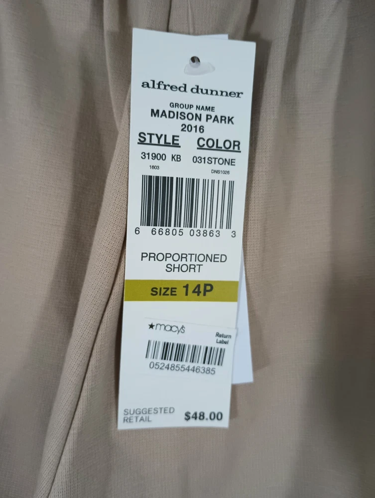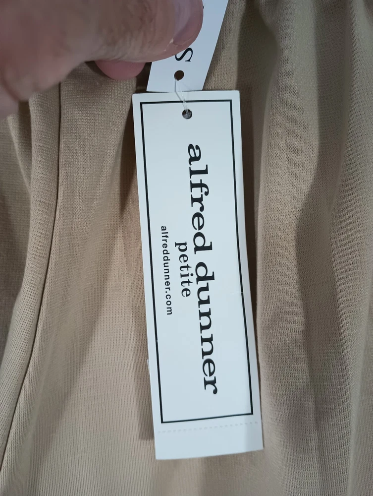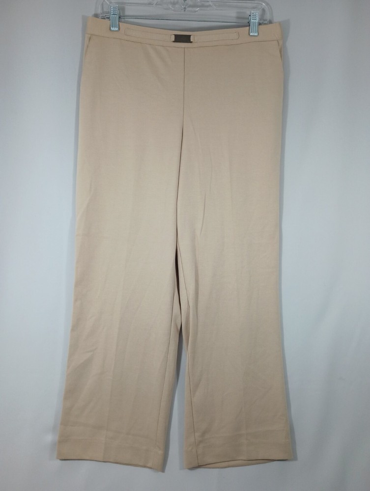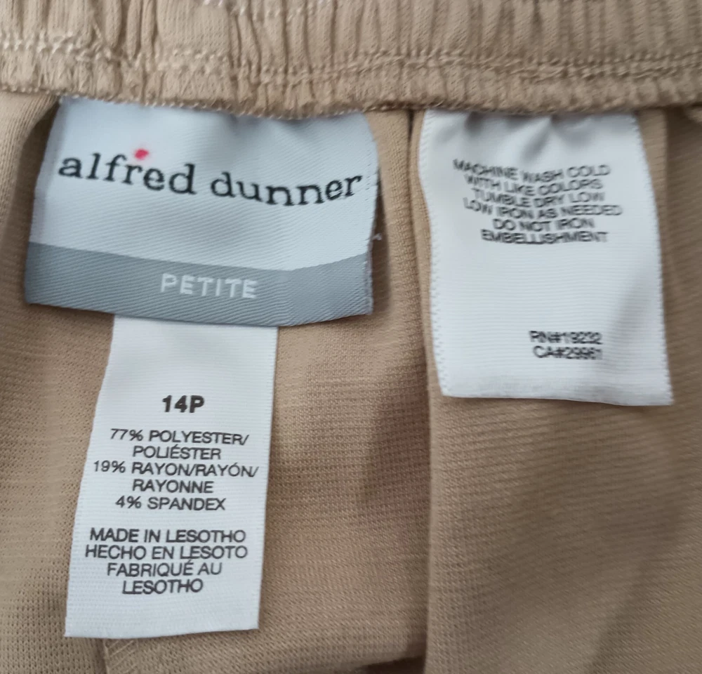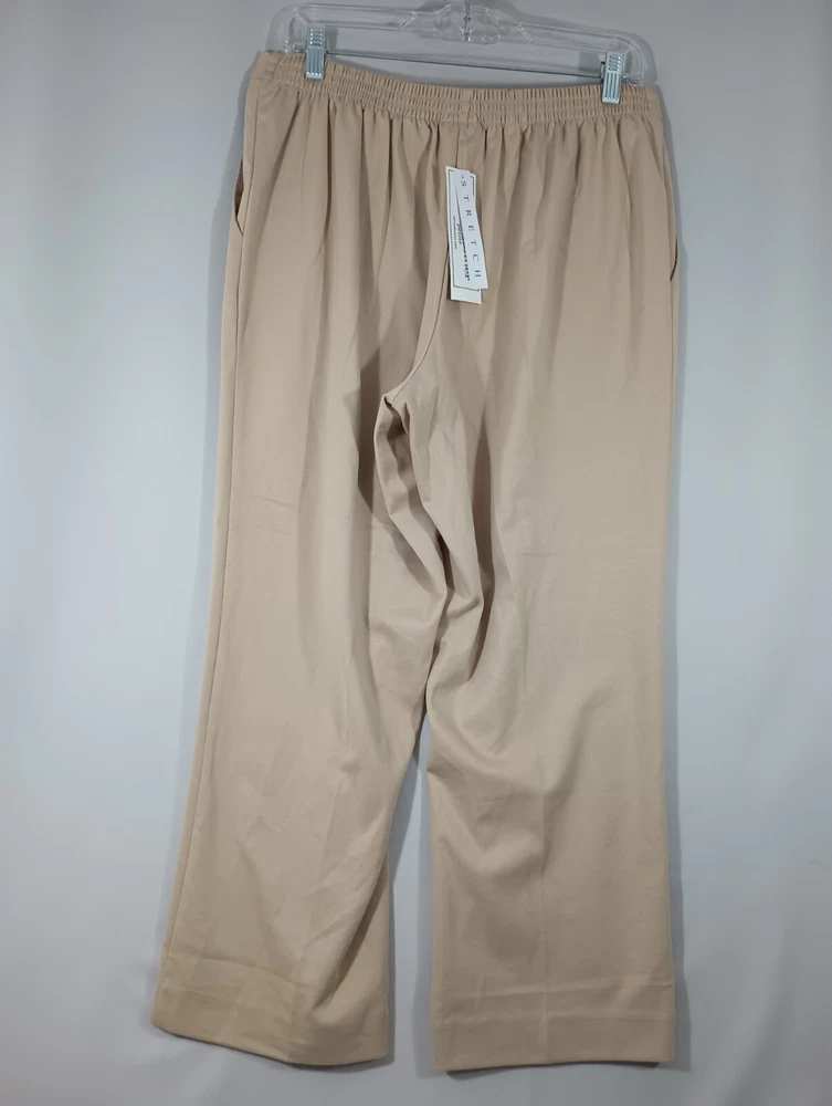 These pants have been carefully examined for quality and are in brand new condition with tags attached. See photos and measurements in the photos for specific details. Thank you for shopping with us at Tender Threads. Elevate your wardrobe with these stunning dress pants from Alfred Dunner. These pants are perfect for any occasion, whether it's for travel or just a casual day out. The high-rise, straight-leg style is flattering for all body types, and the pull-on closure makes them easy to wear. Crafted from a comfortable, easy-care polyester fabric, these pants are machine washable for your convenience. They come in a beautiful stone beige color and feature pockets for added functionality. These pants are perfect for all seasons, including winter, summer, fall, and spring. Add these classic pants to your wardrobe today!