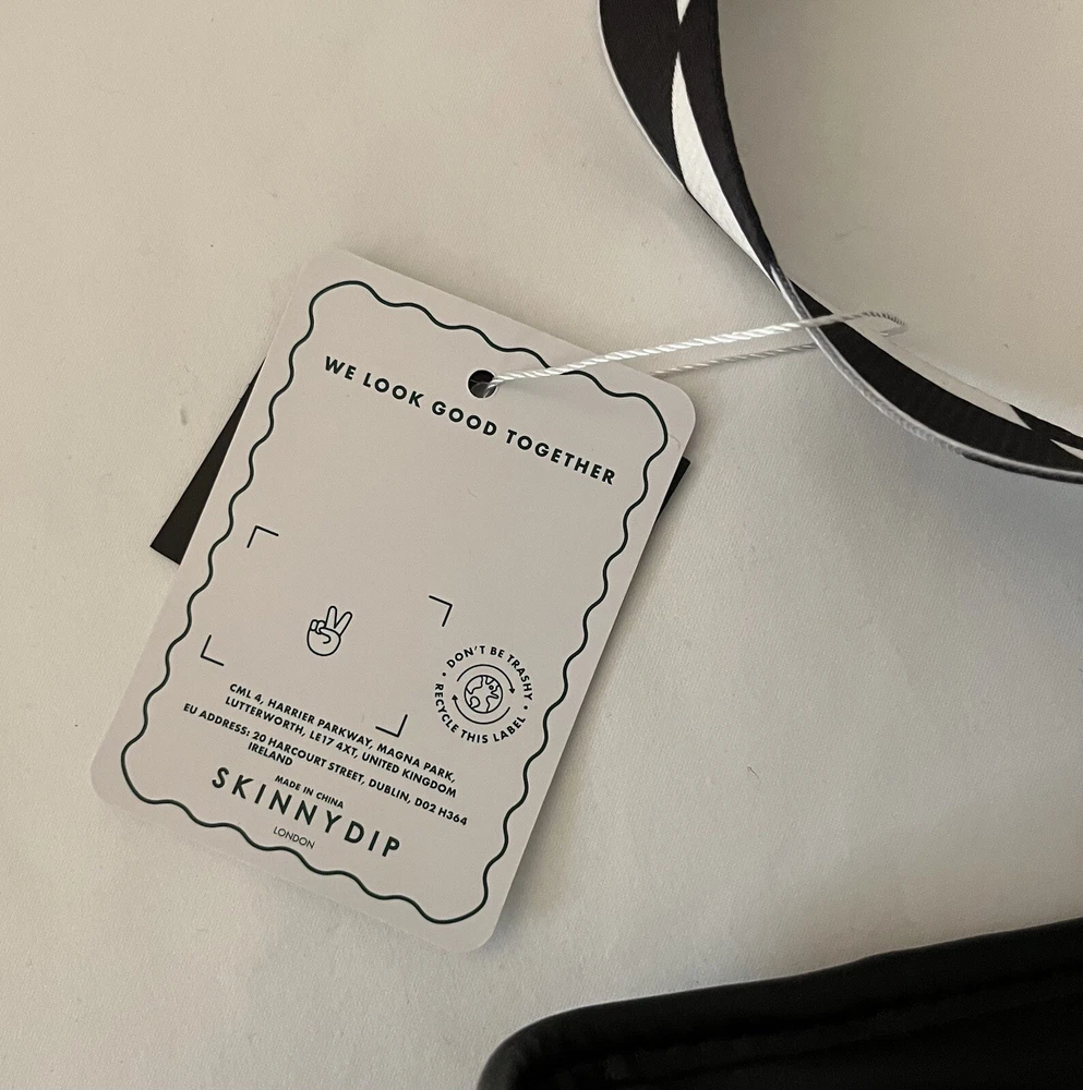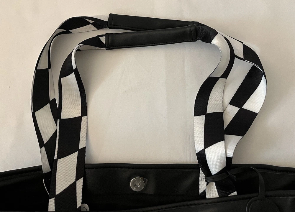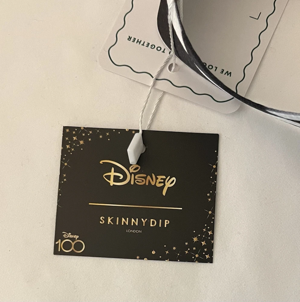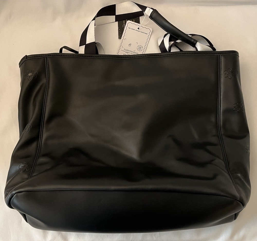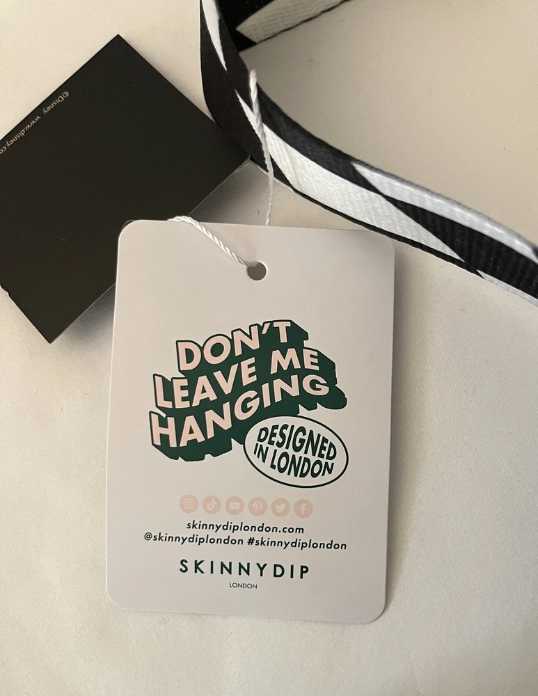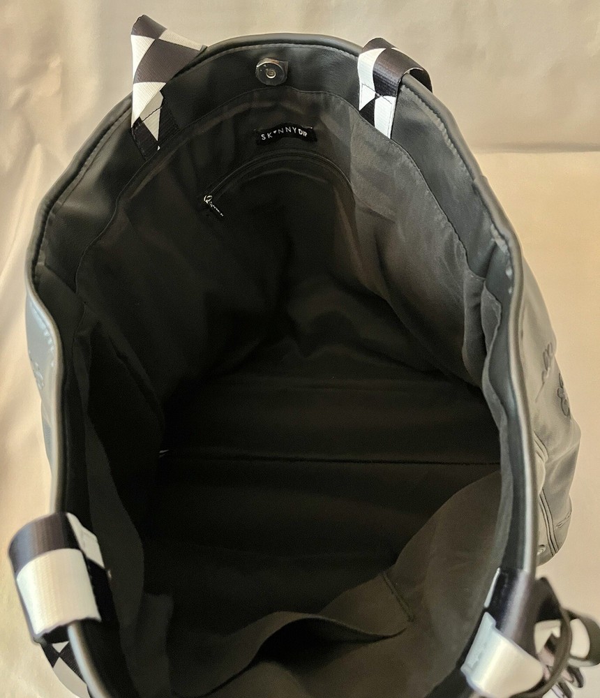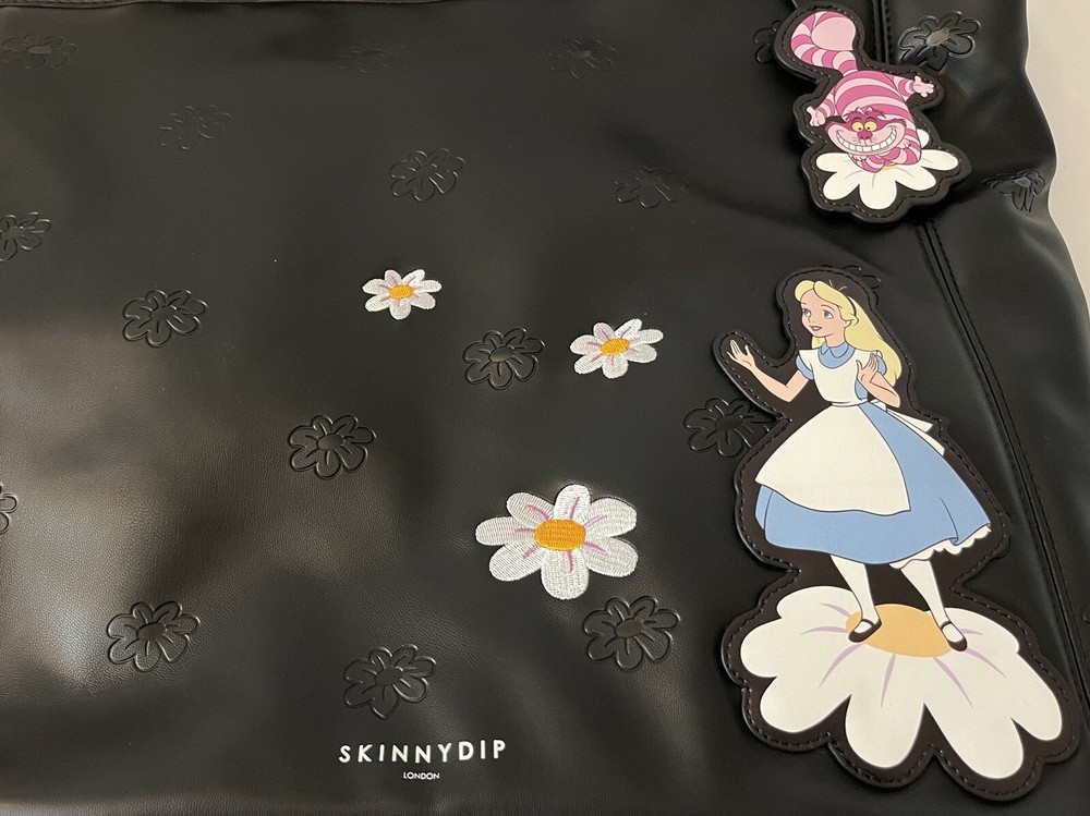 Get ready to make a statement with this Alice in Wonderland-themed Tote Bag from Skinny Dip London's Disney 100 collection. The bag features a black and white design with a kiss lock closure and double handles. It's made of eco-friendly and water-resistant faux leather and canvas materials, perfect for your everyday use. This large-sized tote bag has a cotton lining and inner pockets, making it both stylish and practical. It comes with a key chain accessory and has silver hardware accents. The bag's unique design is inspired by the enchanting world of Alice in Wonderland and the city of London, making it a limited edition piece. Condition is Brand New. Comes from a Smoke Free Home. PayPal Only. Shipped in United States Only Via USPS, FedEx or UPS (whichever is more cost effective).