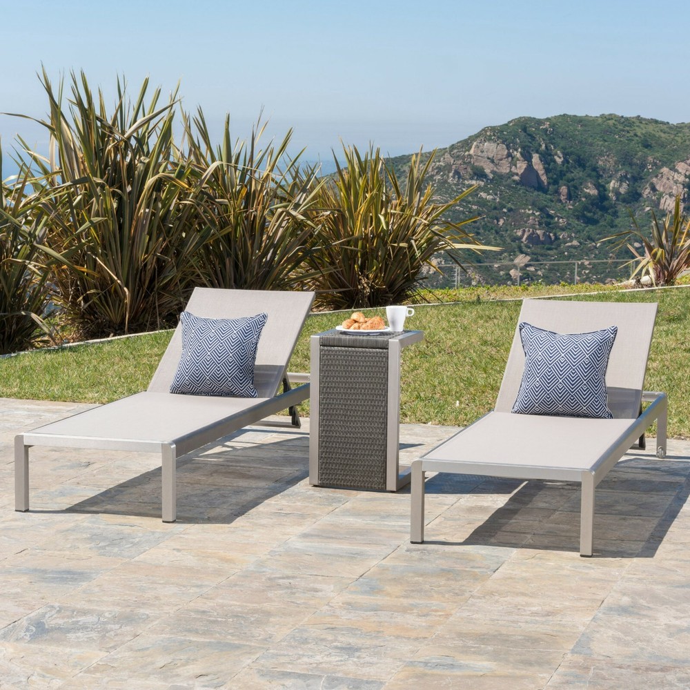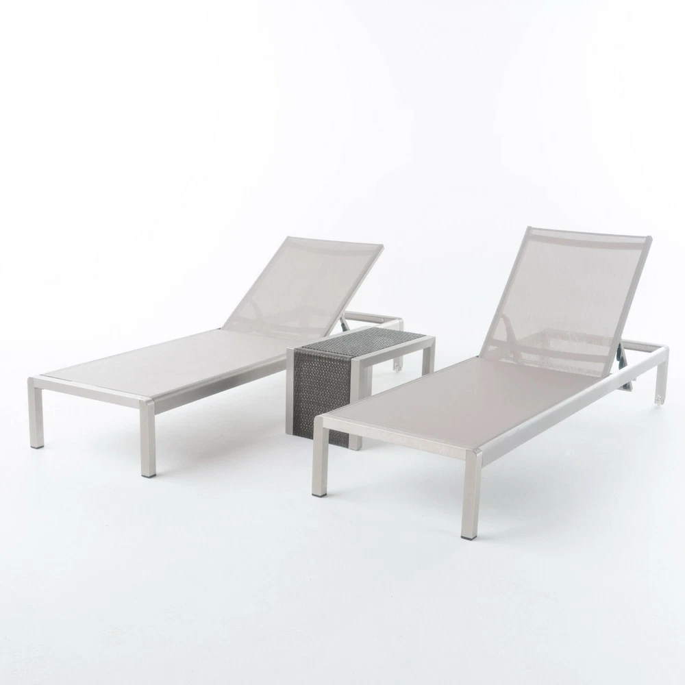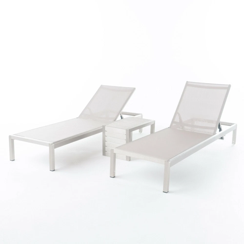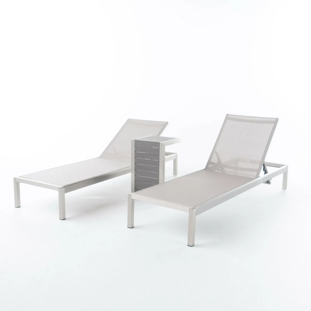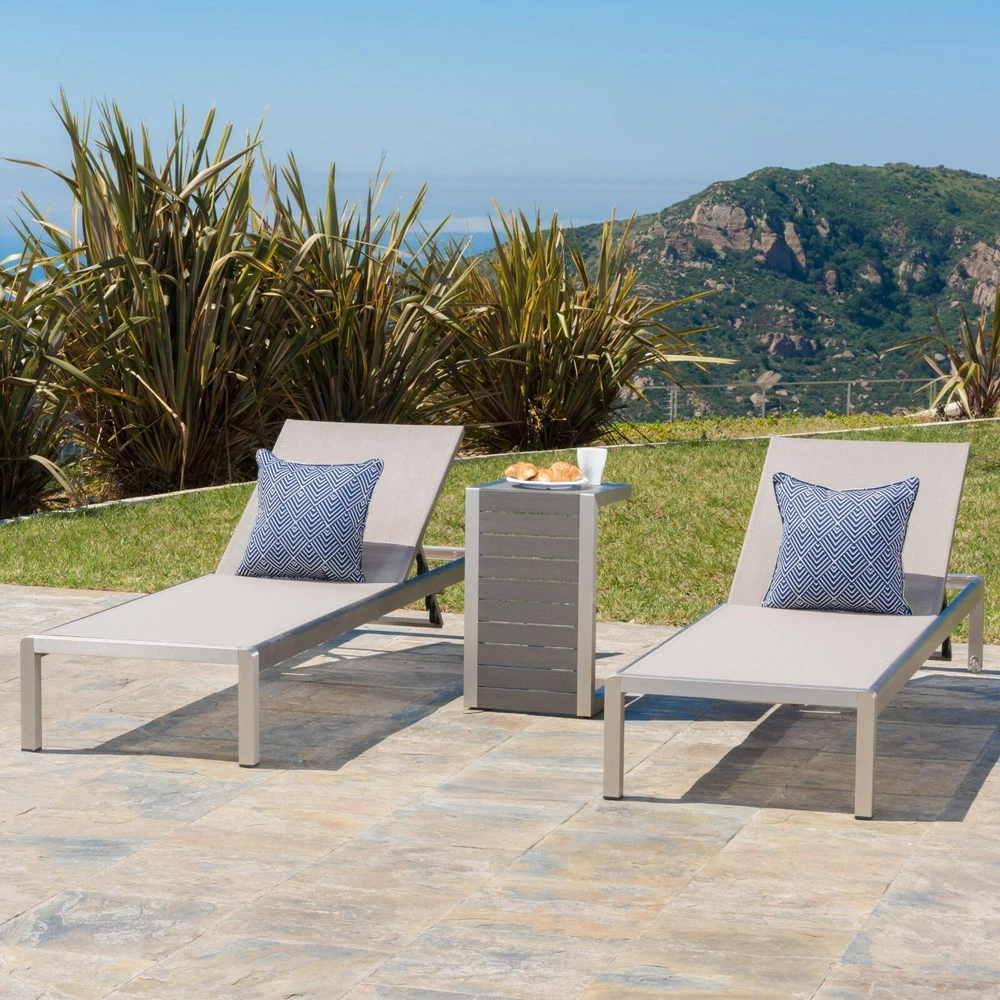 Enjoy the summer lounging in your backyard with your significant other with mimosas on the perfectly shaped table between you. This set comes complete with two lounges and a side table, allowing you to enjoy both the weather and your drinks! You can even have your cake and eat it too with this set. Take back your backyard this summer with this lounge and table set. Features: Includes: One (1) C-Shaped Table and Two (2) Chaise Lounges Table Material: Aluminum Lounge Material: Outdoor Mesh Assembly Required Dimensions: Table: 14.50"D x 15.00"W x 24.00"H Lounge: 77.56"D x 25.20"W x 11.80"H Note: throw pillows and blankets not included