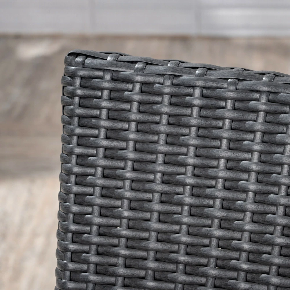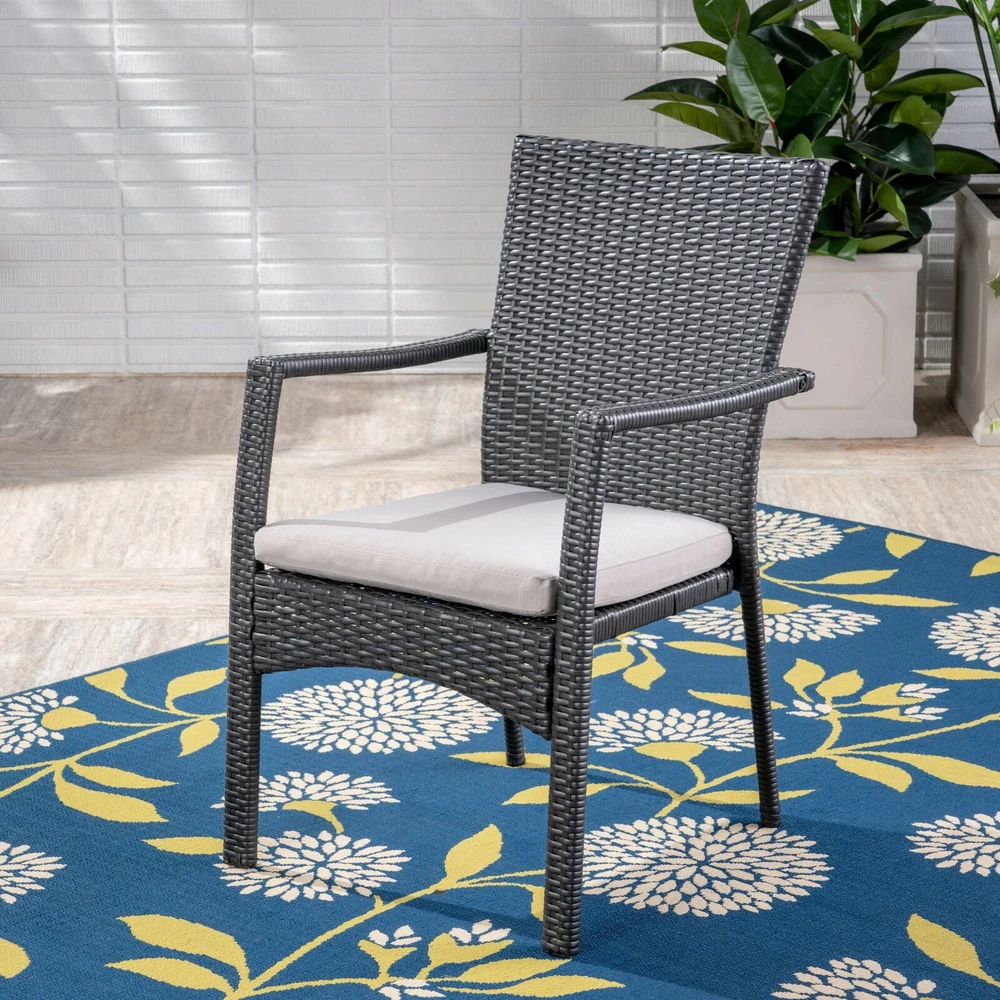 The beautiful blend of wood and wicker comes to life with this dining set. Complete with four wicker dining chairs and one wooden table, you can enjoy eating in your backyard whenever you want. The wooden table is treated to withstand even the harshest of seasons, ensuring your set looks great all year long. This set also comes with the added benefit of cushions for your seats, giving you the perfect color contrast, as well as the comfort that everyone wants when sitting outside for extended periods of time. The square table ensures that there is enough space for both food and people, meaning no one leaves the table hungry. Features: Includes: One (1) Table and Four (4) Chairs Table Material: Acacia Wood Chair Material: Polyethylene Wicker Chair Frame Material: Iron Chair Cushion Material: Water Resistant Fabric Composition: 100% Polyester Table Finish: Gray Wicker Finish: Gray Cushion Color: Gray Some Assembly Required Hand Crafted Details Dimensions: Table Dimensions: 31.50 inches deep x 31.50 inches wide x 30.00 inches high Chair Dimensions: 25.00 inches deep x 22.25 inches wide x 35.00 inches high Seat Dimensions: 18.00 inches deep x 18.50 inches wide x 16.00 inches high