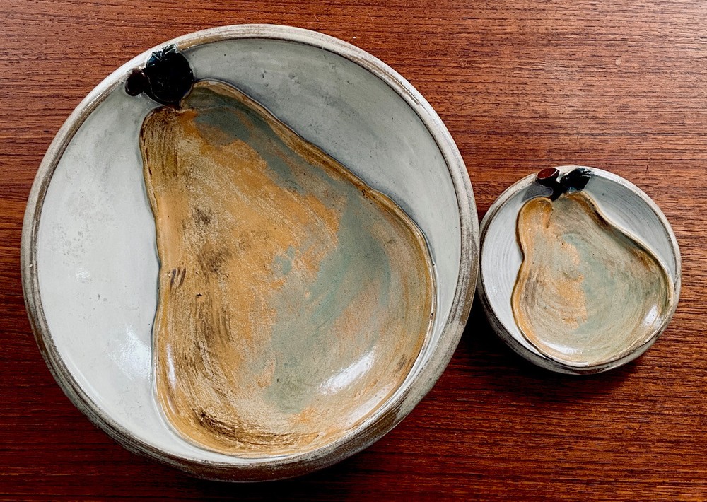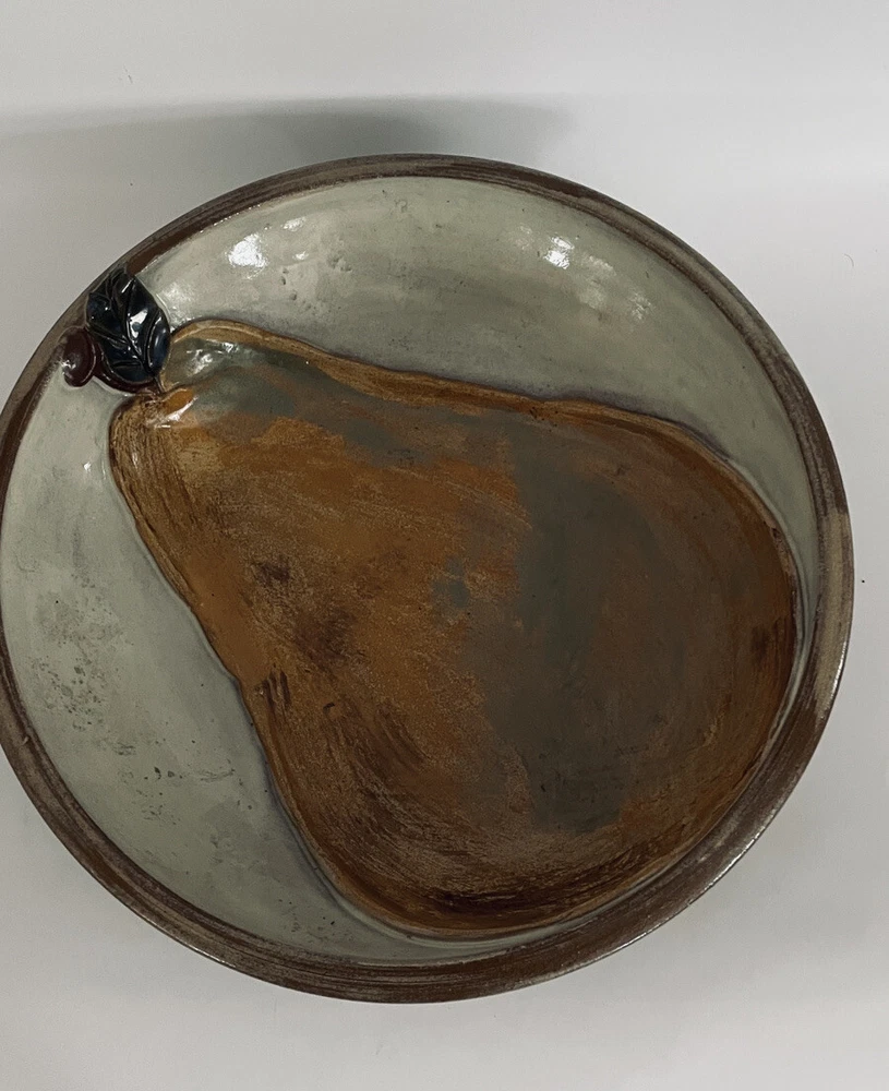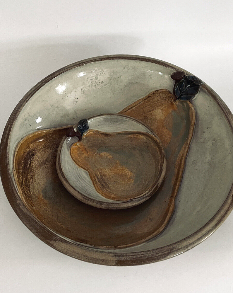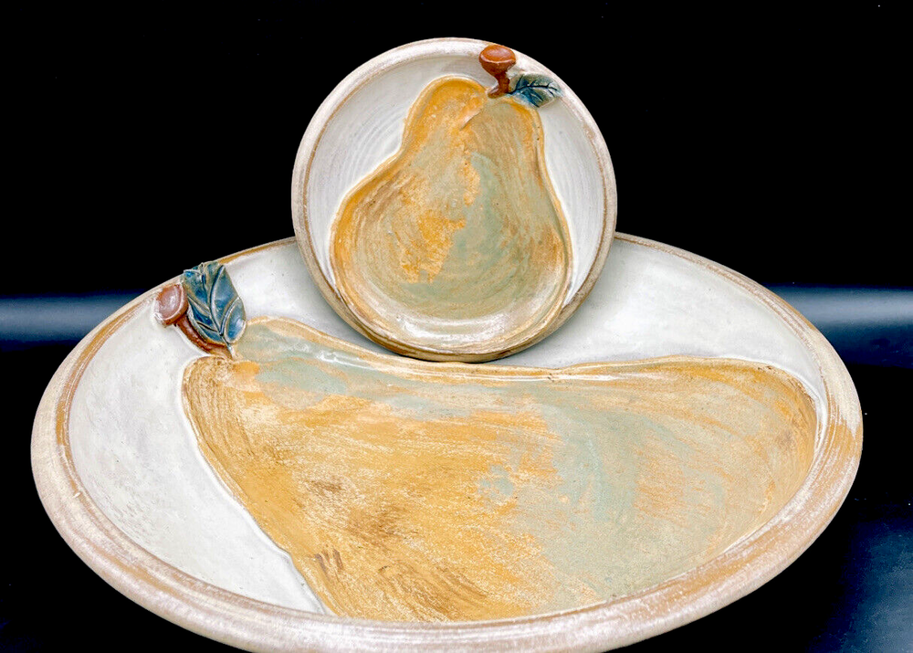 This is unique and beautiful hand made pieces of studio pottery set. The large bowl is 10 1/2" diameter and 2 3/4'' high. The plate 5 1/4" diameter. They are both signed by artist. They are glazed and have raise 3 D pears with stem and leaf. Total weight ot the 2 is 3lb 7.9 oz