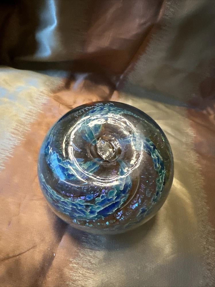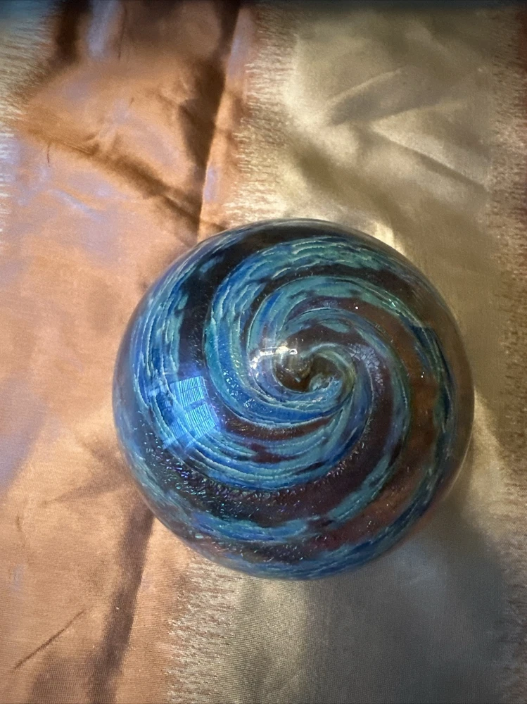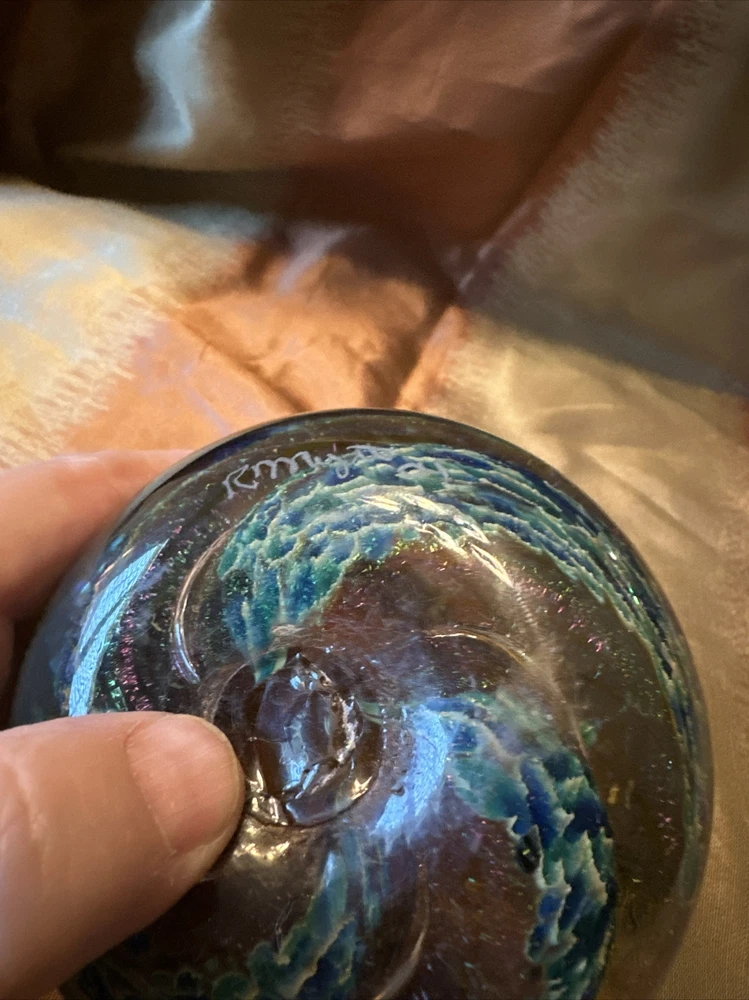This unique paperweight by R Mynatt is a beautiful addition to any collection. The hand-blown glass is artfully crafted with an iridescent shell shape and a round swirl design. The multicolored pattern is stunning and adds a touch of mid-century modern style to any decor. The paperweight measures 3.5 inches and has a glossy finish. It was produced in the United States in 2004 using an incised backstamp. The product line is studio glass and it is an original, handmade piece. This paperweight is perfect for collectors of unique and beautiful items. See pictures for details. They are part of the description. Email your questions prior to purchase check out my eBay store for any additional items. Thanks for looking and have a great day.