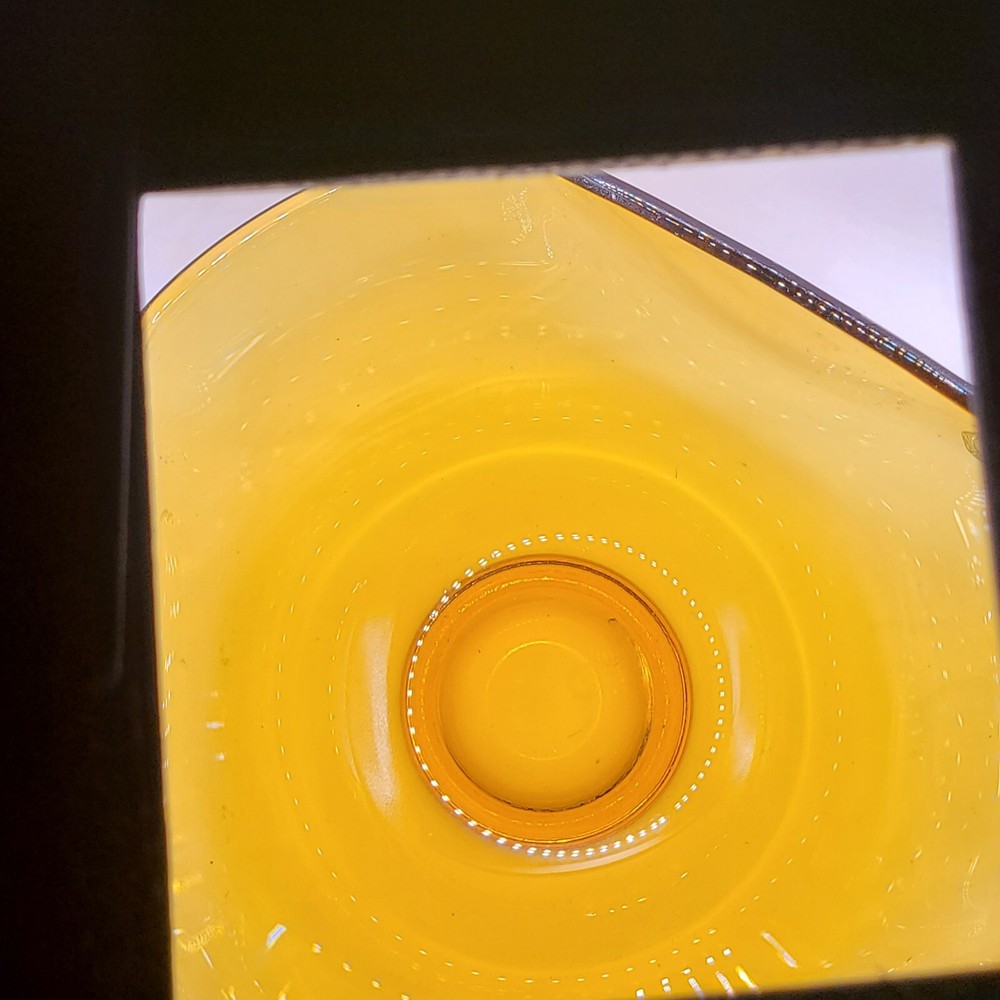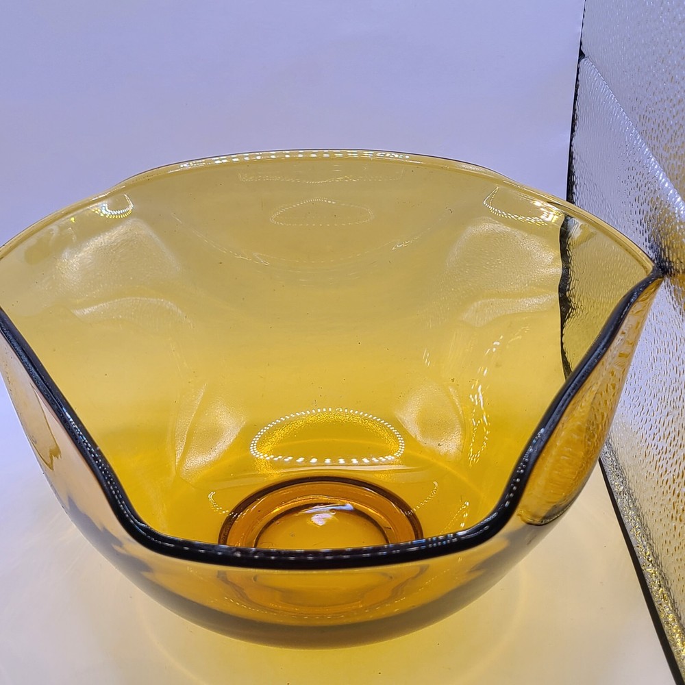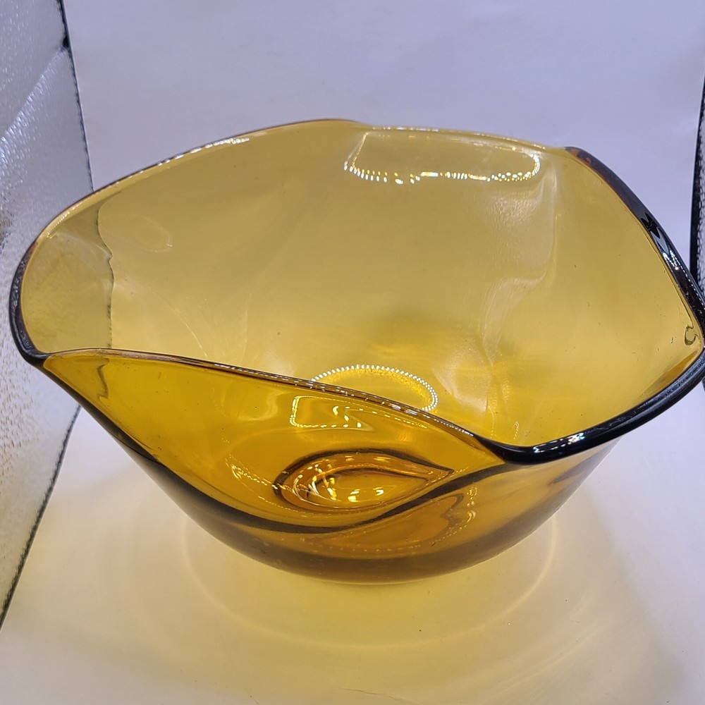 This beautiful vintage amber bowl from Anchor Hocking or Indiana Glass is the perfect addition to your fall decor. The folded design adds a touch of elegance, while the glossy glass finish shines beautifully in the light. It's great for all occasions and can be used to serve anything from salads to snacks. The bowl has a round shape and measures [insert measurements here]. It's an original piece and not a licensed reproduction, making it a unique find for any collector. Made of high-quality glass, it's durable and sure to last for years to come. Add this stunning bowl to your collection today! Measures 9.25 x 9.25 x 5 25 in. No chips or cracks. Welcome to my eBay store. I specialize in vintage and collectibles. My store is JW's Thrifty Vintage Finds and More. I sell home and kitchen decor, wall art, barware, costume jewelry, toys and purses. View my other listings at the bottom of the page. Click VISIT SELLERS STORE to bundle for lower shipping. ((I also have weekly sales on various items)). Thank you for viewing my other listings at the bottom of the page.#128A
