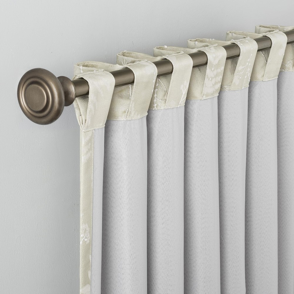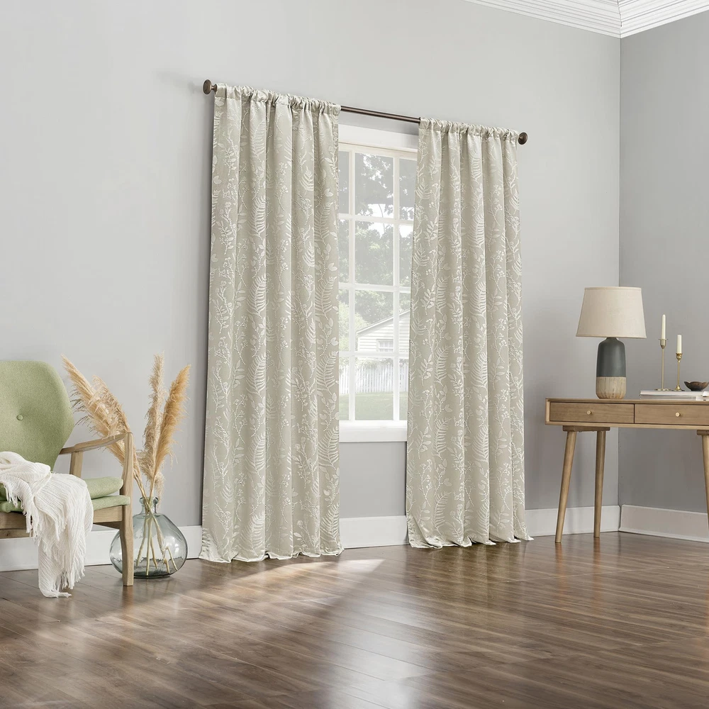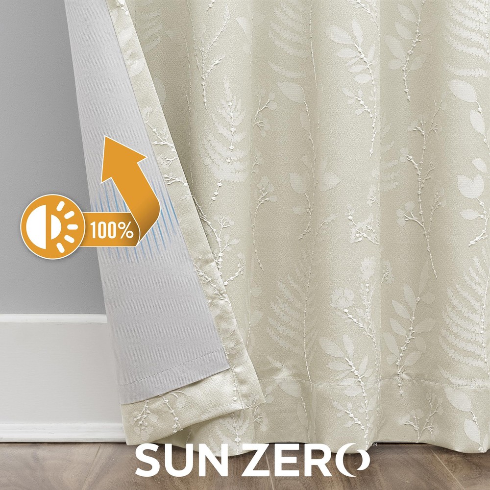 Featuring an intricately embroidered leaf pattern, Ambridge Embroidered Botanical Leaf Pleated Look 100% Blackout Back Tab Curtain Panel Pairs breathe life into any living space. Equipped with built-in metal grommets for easy hanging on standard curtain rods up to 1.5" in diameter. Extreme Blackout™ Thermal Lining is laboratory tested to block out 100% of light, reduce outside noise by up to 40%, and decrease energy lost through your windows by up to 40%. Comfort is optimized with thermal properties that help keep summer heat and winter chill out of your home. back tabs allow for easy slide-through installation on curtain rods up to 1.5" in diameter. Hang in your entertainment room to eliminate screen glare and reduce distracting outside noise, or in your bedroom for enhanced privacy and a sounder, more uninterrupted sleep. Pair includes 2 cream panels, each measuring 50" width by 96" length. Measure carefully before selecting your desired size and quantity. Rod not included. Machine wash cold on gentle cycle. Use non-chlorine bleach when needed. Tumble dry on low heat, using a cool iron as needed. Intricately embroidered leaf pattern adds botanical detail Extreme Thermal Blackout technology blocks out 100% of outside light Thermal properties help keep summer heat and winter chill out of your home Noise reduction up to 40% helps you get a sounder, more uninterrupted sleep back tabs fit curtain rods up to 1.5" in diameter Pair includes (2) panels. Measure carefully prior to purchase.