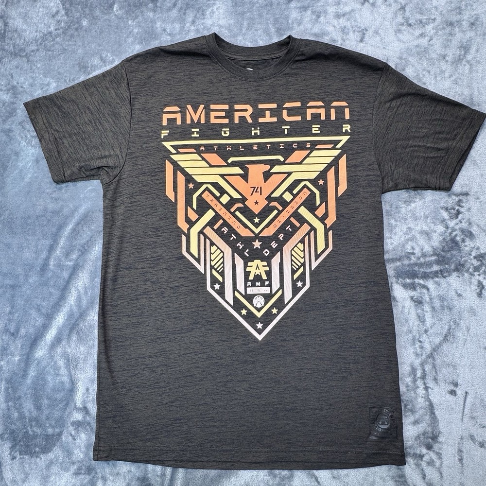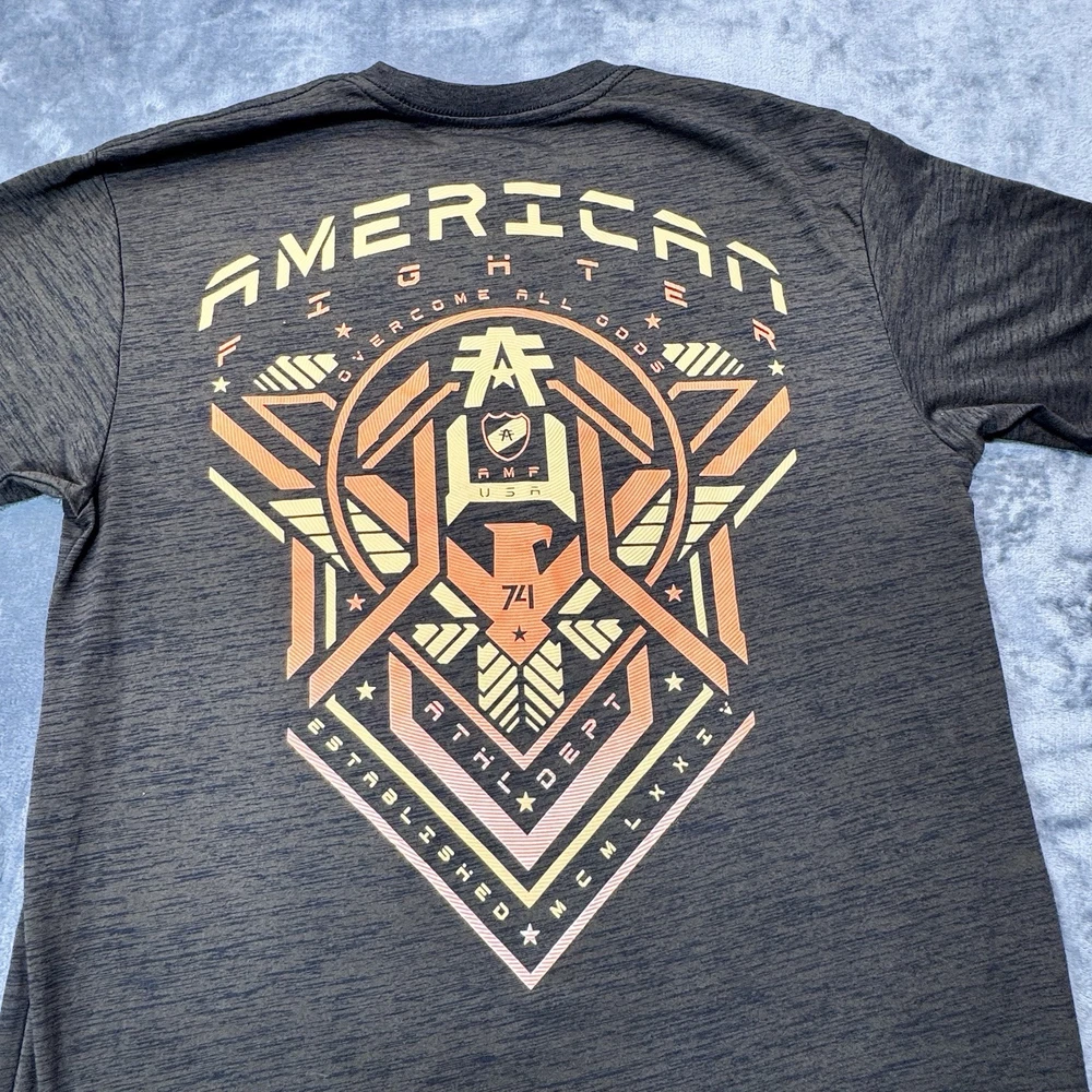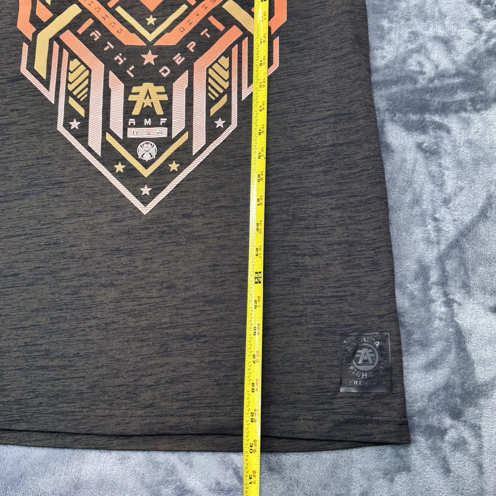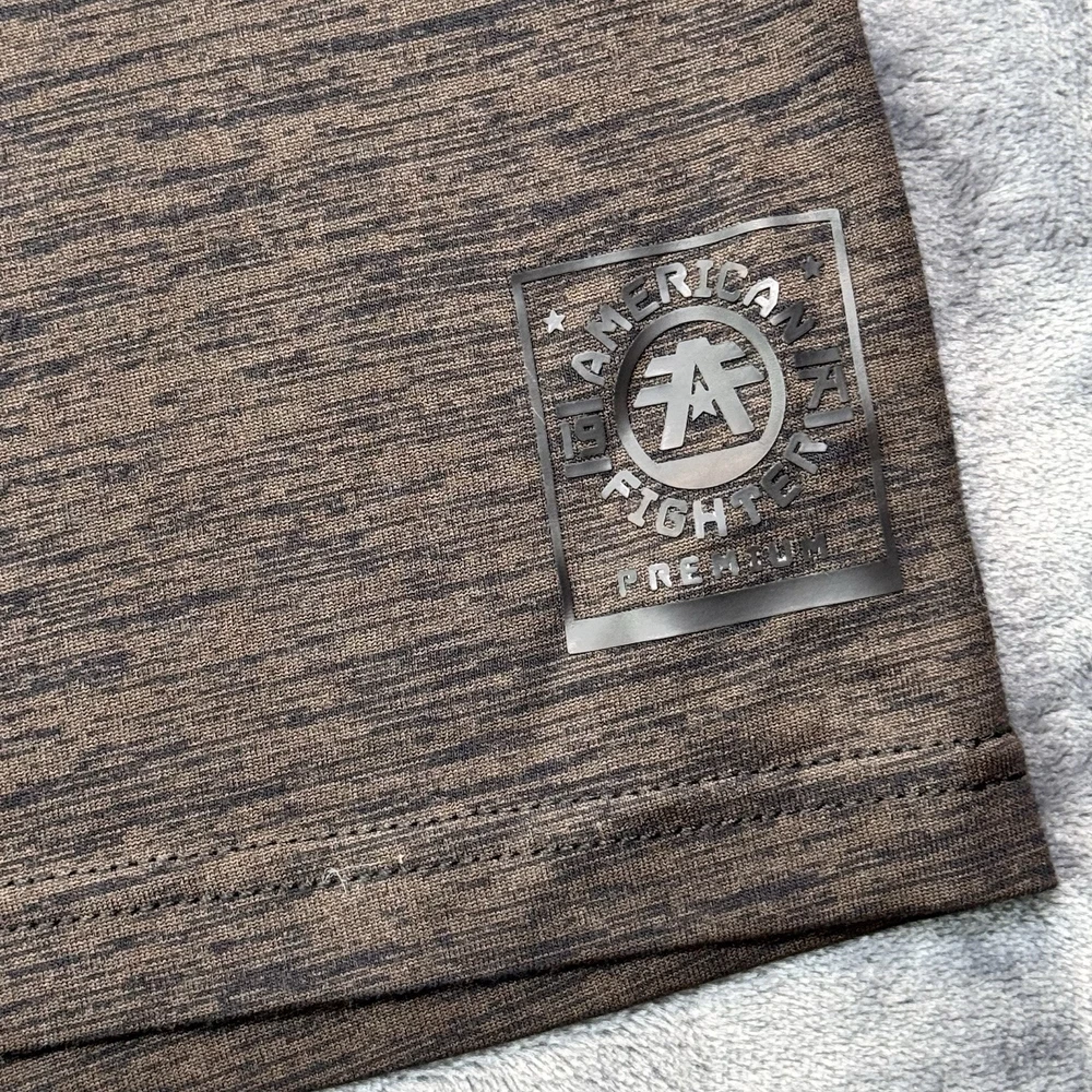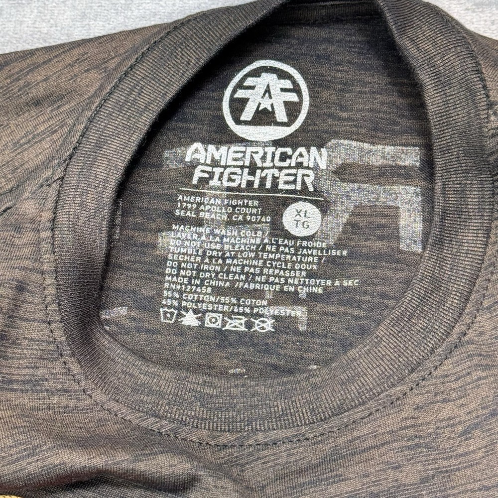 Elevate your casual style with this American Fighter Men's T-Shirt in dark brown dip dye with a city view design. This shirt features a crew neck and short sleeves, made of a cotton blend fabric that is easy to care for and breathable. It is a limited edition shirt that is perfect for all seasons, with accents of the brand's logo and a graphic print pattern. This T-shirt is preshrunk and tagless, with a moisture-wicking feature that makes it quick to dry. It is a regular fit shirt, with a size of XL, and is suitable for gym, outdoor, sports, and biker themes. This shirt is perfect for those who love to show their USA pride, with its mixed martial arts and metal themes.
