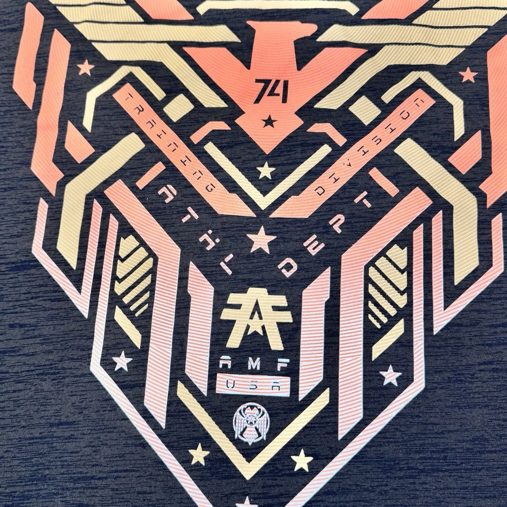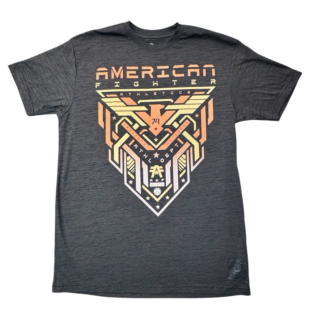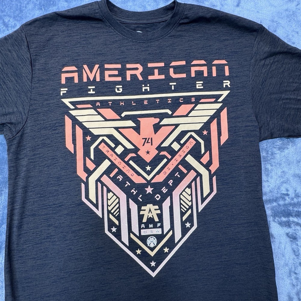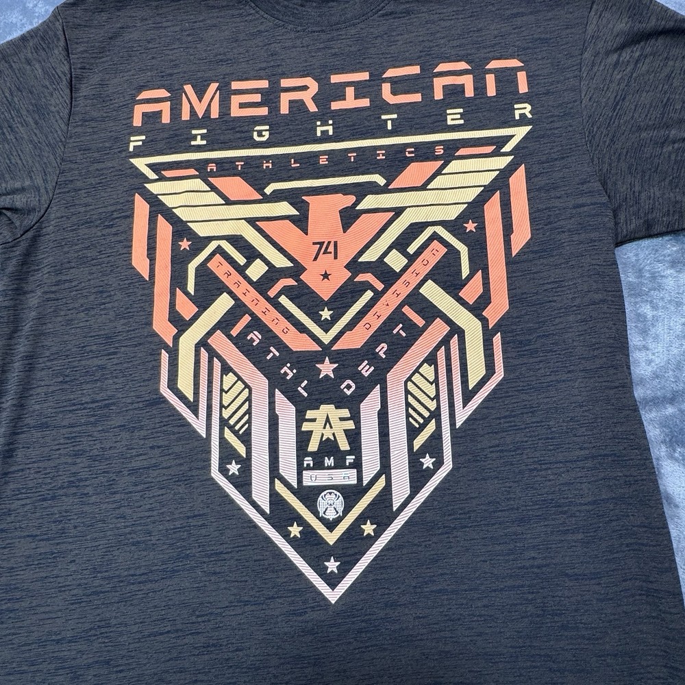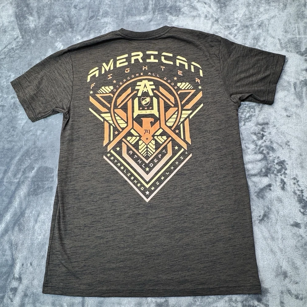 Elevate your casual style with this American Fighter Men's T-Shirt in dark brown dip dye with a city view design. This shirt features a crew neck and short sleeves, made of a cotton blend fabric that is easy to care for and breathable. It is a limited edition shirt that is perfect for all seasons, with accents of the brand's logo and a graphic print pattern. This T-shirt is preshrunk and tagless, with a moisture-wicking feature that makes it quick to dry. It is a regular fit shirt, with a size of XL, and is suitable for gym, outdoor, sports, and biker themes. This shirt is perfect for those who love to show their USA pride, with its mixed martial arts and metal themes.