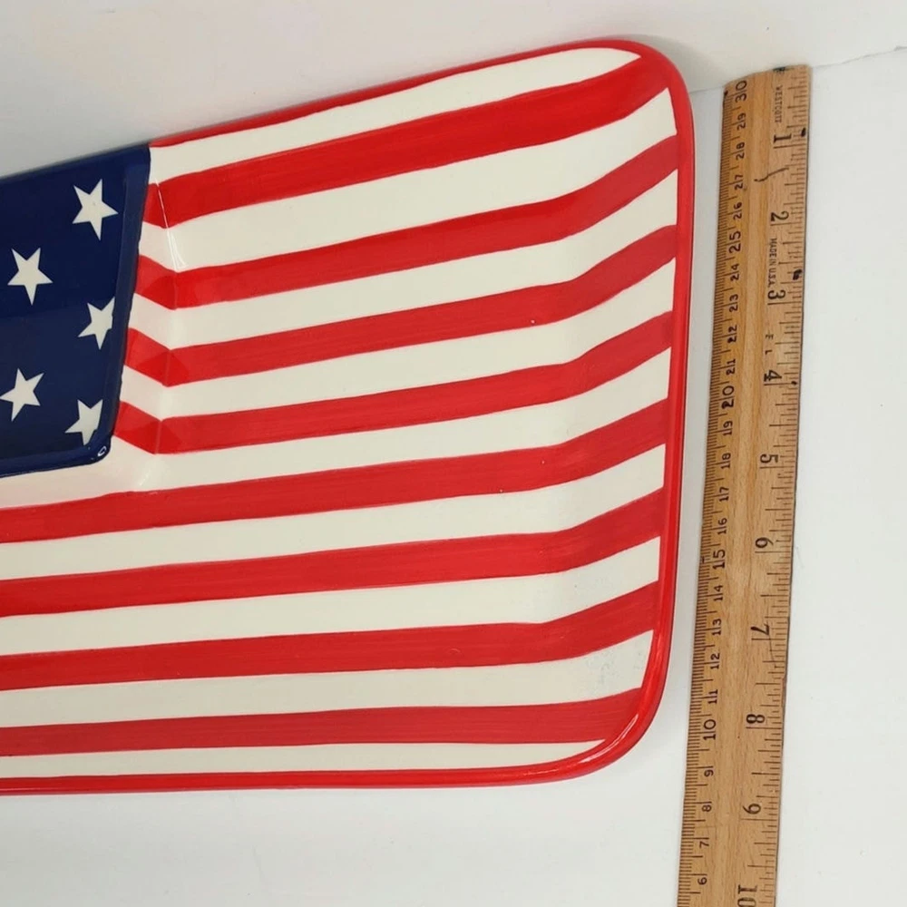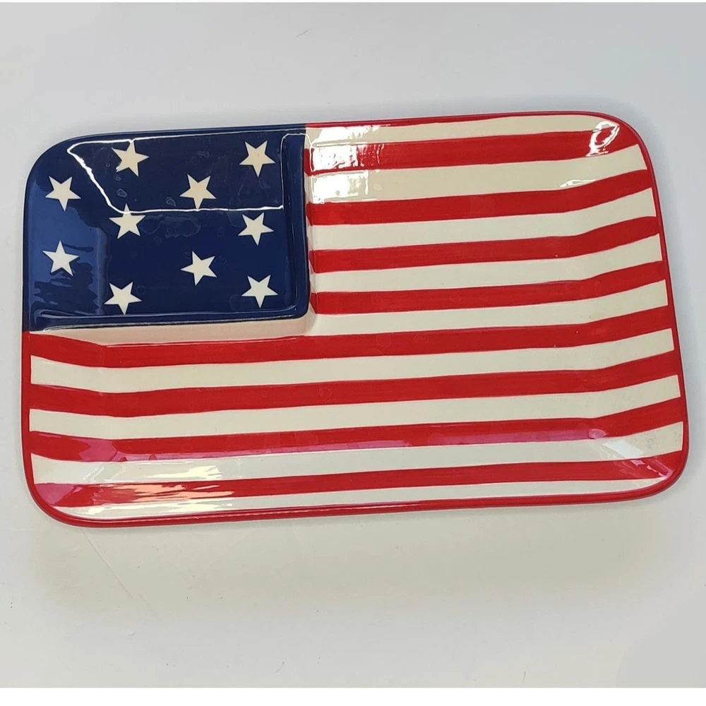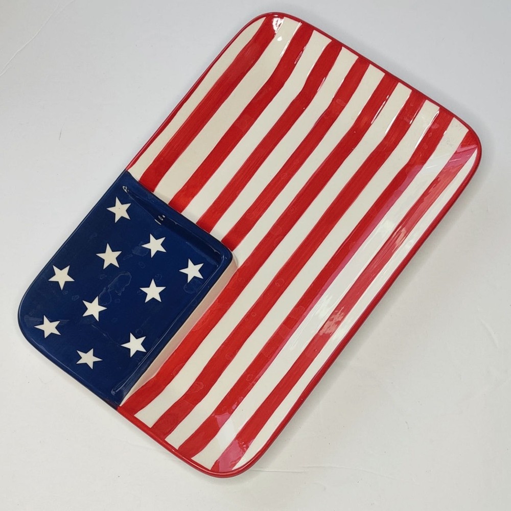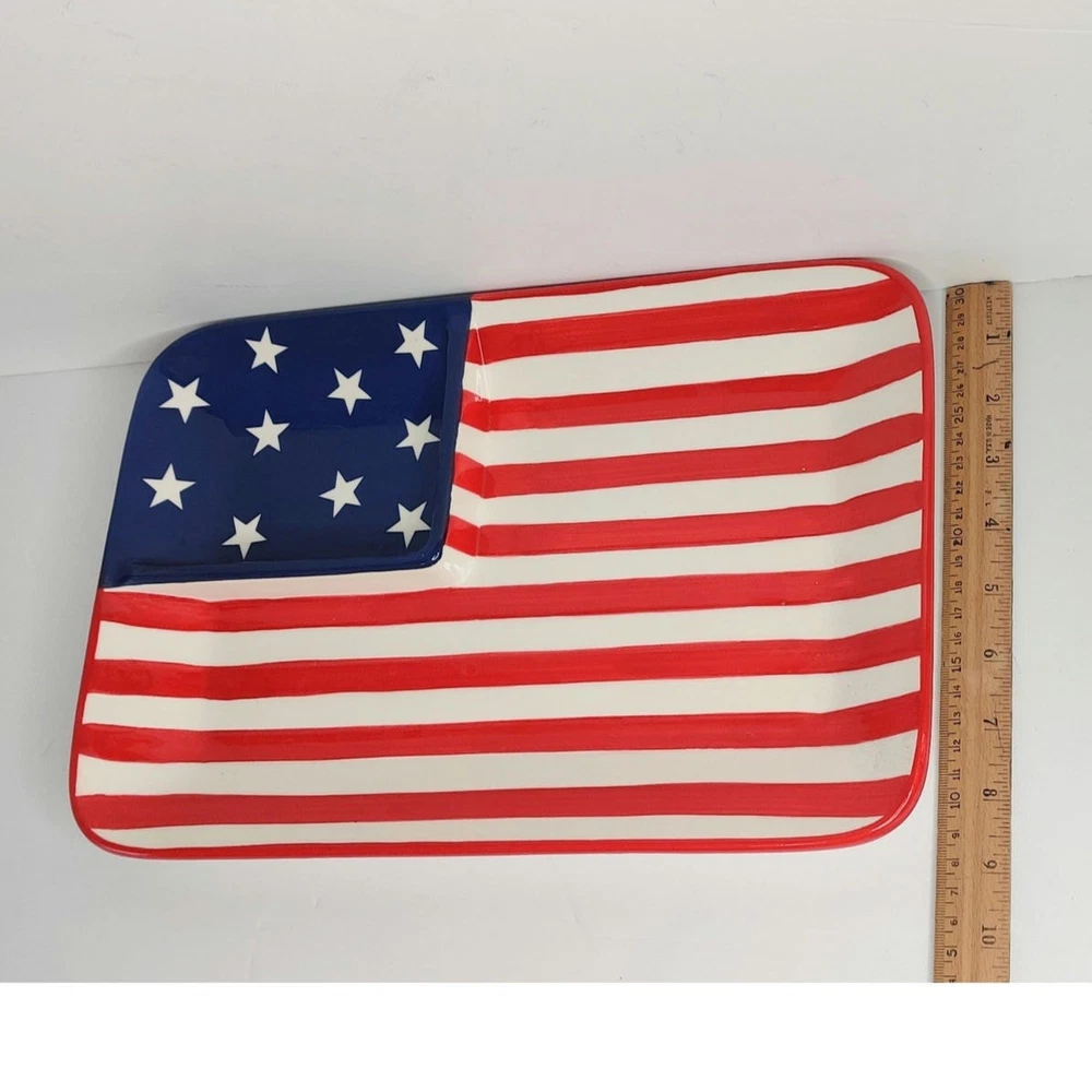 American Flag Shaped Patriotic Ceramic Veggie/ Chip and Dip Party Platter Tray Made of Ceramic Red White and Blue in color Gently Used Condition. No chips, no cracks or no crazing. Measures Approx: 14" L x 9" H Weight: 3 lbs wrapped and boxed Are you Patriotic, love America, our flag , all things stars and stripes, the firework displays on Independence Day 4th of July? Then you have come to the right place. Check out my seasonal decor from Uncle Sam with his Red White and Blue Tophat to Lady Liberty. Lots of items with phrases such as God Bless America, Let Freedom Ring, Home Sweet Home, Home of the Brave, And Old Glory. Choose from modern day styles to folkart and primitive! Pair with my other home decor, bundle and save!