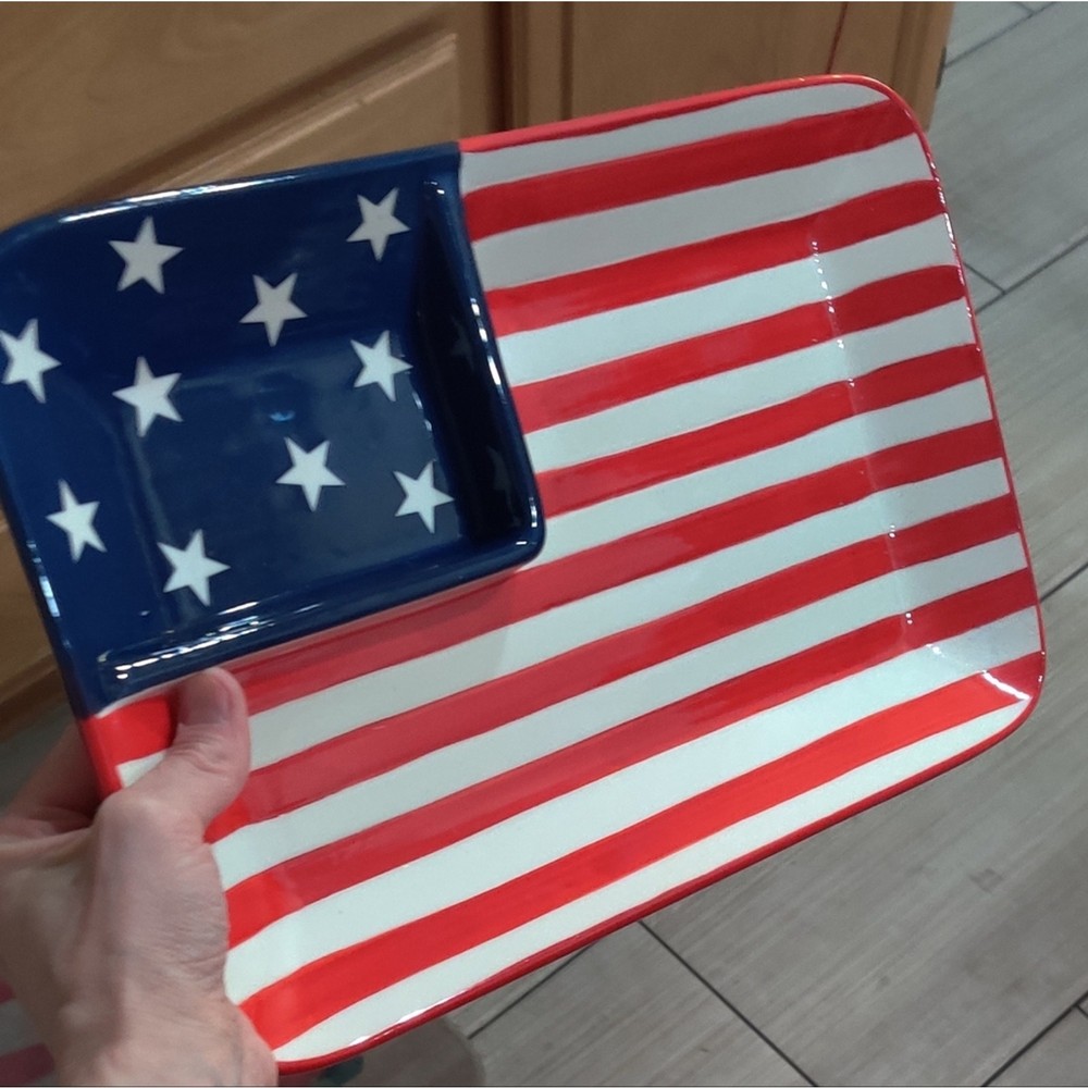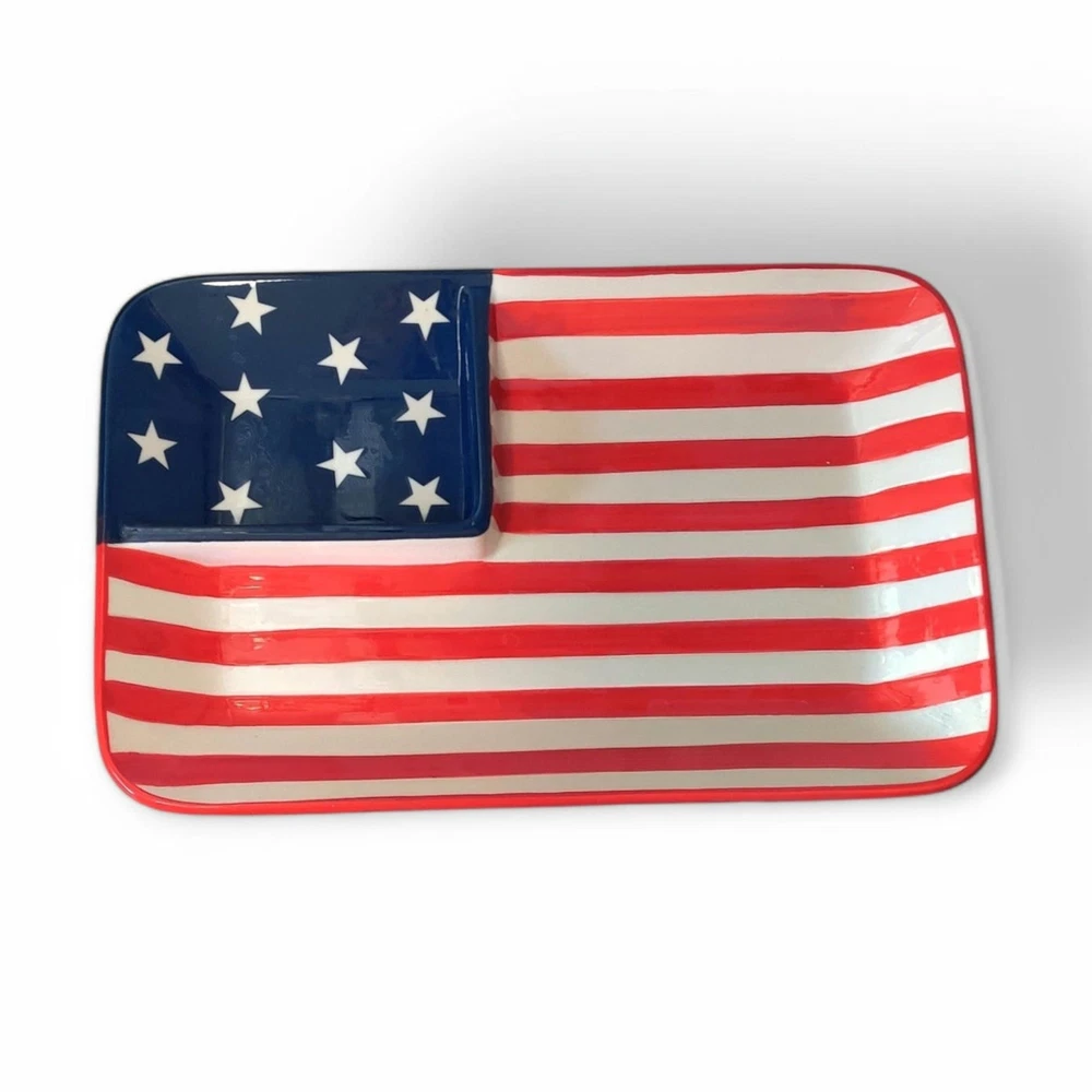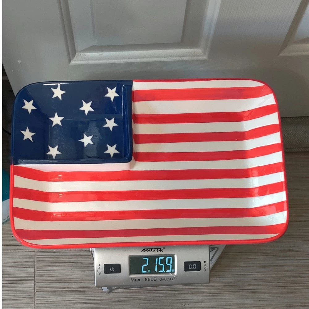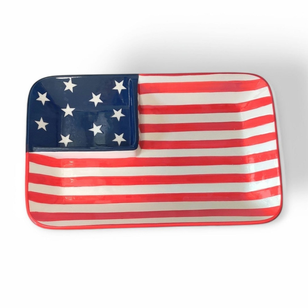 American Flag Shaped Patriotic Ceramic Veggie/ Chip and Dip Party Platter Tray Made of Ceramic Red White and Blue in color Gently Used Condition. No chips, no cracks or no crazing. Measures Approx: 14" L x 9" H Weight: 3 lbs wrapped and boxed Are you Patriotic, love America, our flag , all things stars and stripes, the firework displays on Independence Day 4th of July? Then you have come to the right place. Check out my seasonal decor from Uncle Sam with his Red White and Blue Tophat to Lady Liberty. Lots of items with phrases such as God Bless America, Let Freedom Ring, Home Sweet Home, Home of the Brave, And Old Glory. Choose from modern day styles to folkart and primitive! Pair with my other home decor, bundle and save!