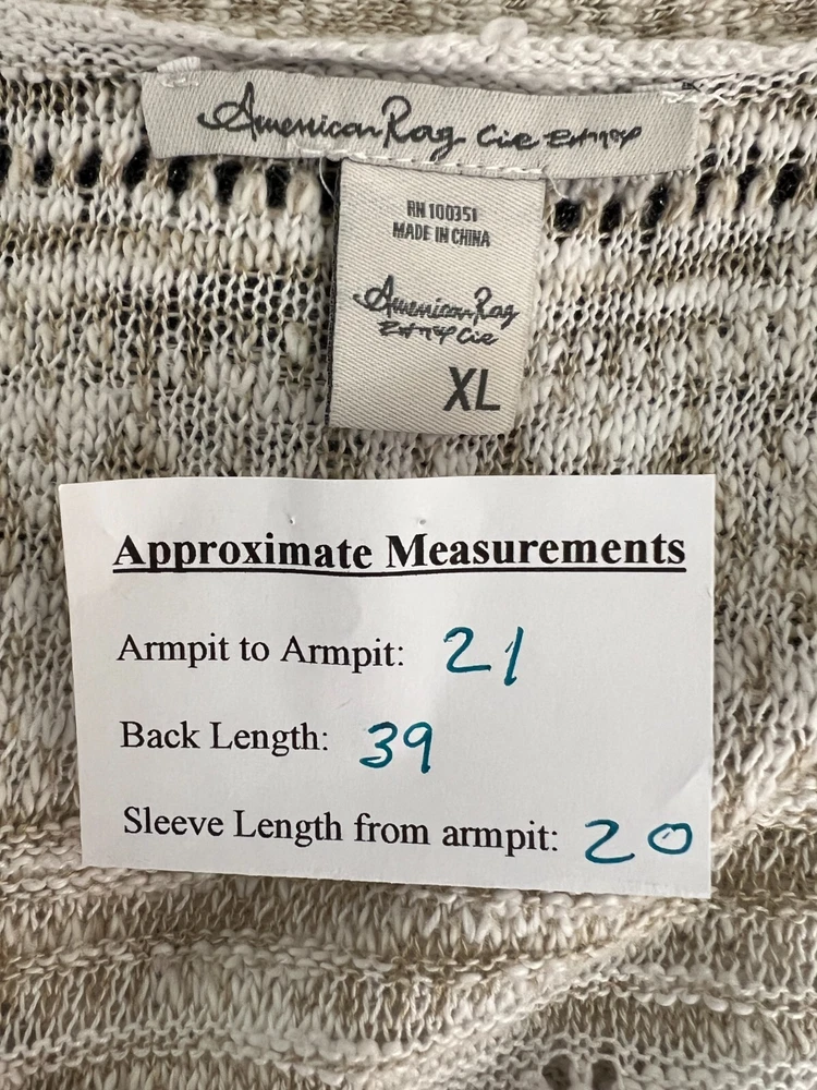 Welcome! ______________________________________________________ *** I do my best to list every inconsistency of item, if there are any, but it is the buyer's responsibility to look at all pictures, read description carefully, check measurements , and ask questions before bidding or buying. Thank You! *** If you are super picky about item condition, please do NOT bid on or buy my items. ______________________________________________________ Up for sale is an adorable American Rag Cie cardigan in excellent condition. **Please compare measurements to your favorite fitting garment to ensure accurate fit.** SEE LAST PHOTO FOR APPROXIMATE MEASUREMENTS _______________________________________________________________________ DISCLAIMER: Payment must be received within 4 days of auction end date and time. Purchase will automatically be cancelled after 4 days of non-payment, NO EXCEPTIONS. This will result in a mark against you on your account – per eBay. Buyer will also be permanently blocked from all of my sites. Please let me know if you need to cancel a sale before the 4-day period. _______________________________________________________________________ ****ALL DEFECTS MAY NOT BE LISTED . PLEASE use the zoom feature over photos to ensure you know what you are purchasing! I will not be held responsible if you try and use a not as described reason for return purposes because you failed to view the photos. A case will be opened against you and you will be reported if you try to falsify a return. _______________________________________________________________________ Please contact me with any questions or concerns. Thanks for looking!