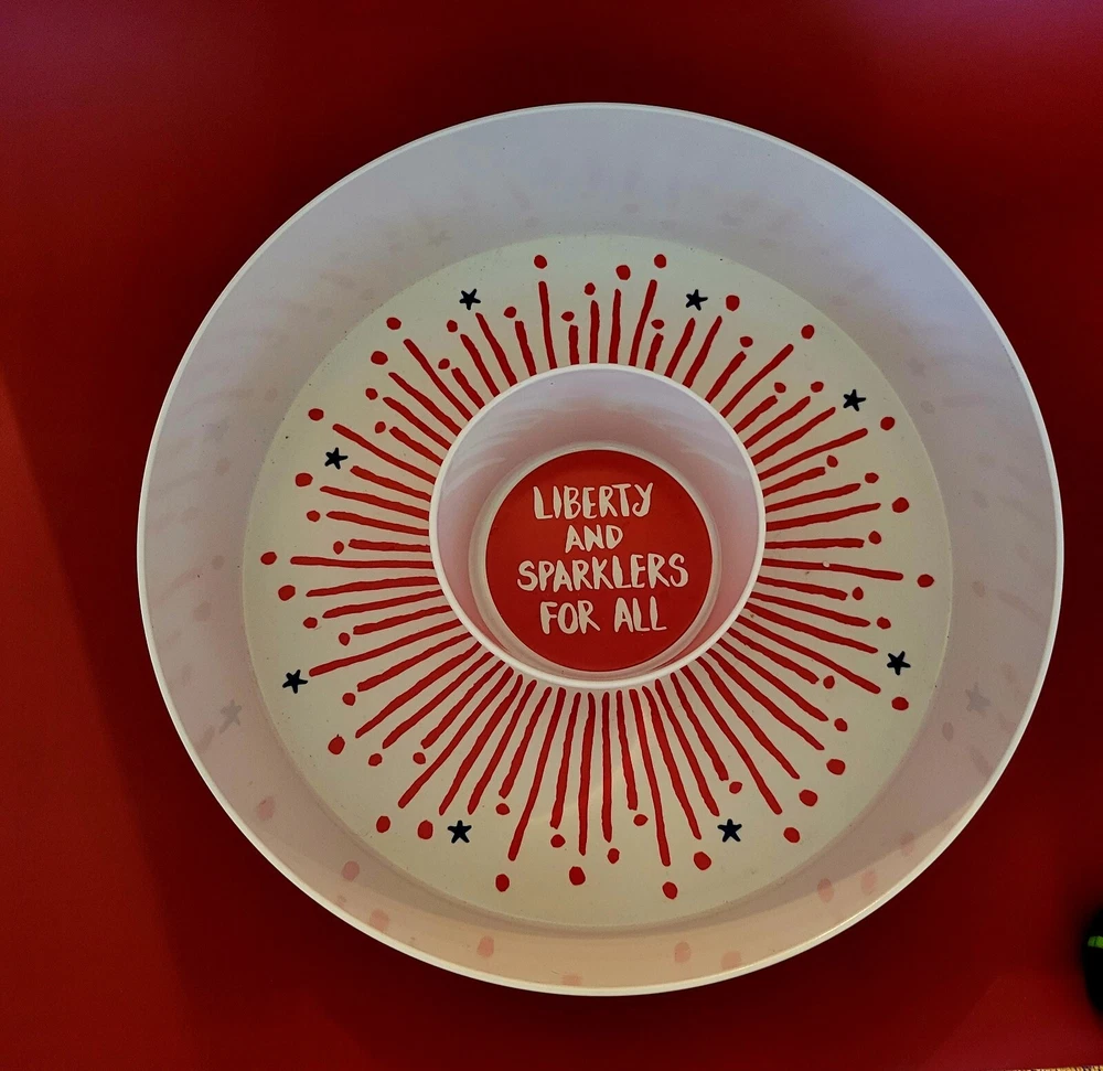 Showcase your patriotic spirit with this Americana themed serving tray. The round, large-sized tray comes in a striking red, white, and blue color combination, making it a perfect addition to your Fourth of July celebrations. The tray is made of high-quality melamine material, making it safe for use on patios or around the pool. This serving tray set comes with two pieces, featuring a convenient chip and dip feature. The matte finish of the tray gives it a classy look, perfect for any occasion. With Kohl's as the brand, you can be assured of the product's quality. Get your hands on this amazing Americana themed chip and dip tray set and serve your guests in style.