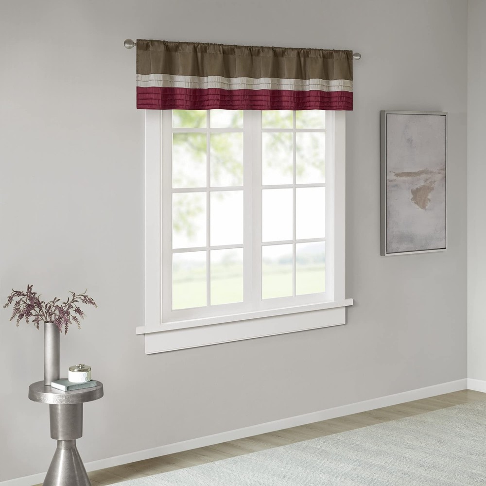 NEW & TRENDY - Give your home a decorator’s touch with the Amherst window curtain valance. Made from a faux silk fabric, this elegant window valance features multi color blocks with pintuck details. The luxurious sheen provides a touch of sophistication to your decor. For added sophistication, it comes with back tab rod pocket to fit curtain rods up to 1.25 inch in diameter. Complete the collection with coordinating window curtains and bedding set, each sold separately. PRIVACY - The living room curtain valances come with back lining for added privacy and better drapability. It also increases its ability to dim outside light coming in creating more cozy ambiance BACK TAB POCKET - This elegant small kitchen window curtain features a back tab rod pocket to conceal/cover the curtain rod creating a more professional tailor look; the rod pocket can fit rods up to 1.25 inch in diameter MEASUREMENT - 1 Window Valance: 50"W x 18"L CARE - Machine wash cold on gentle cycle, tumble dry on low heat, wash alone, do not bleach