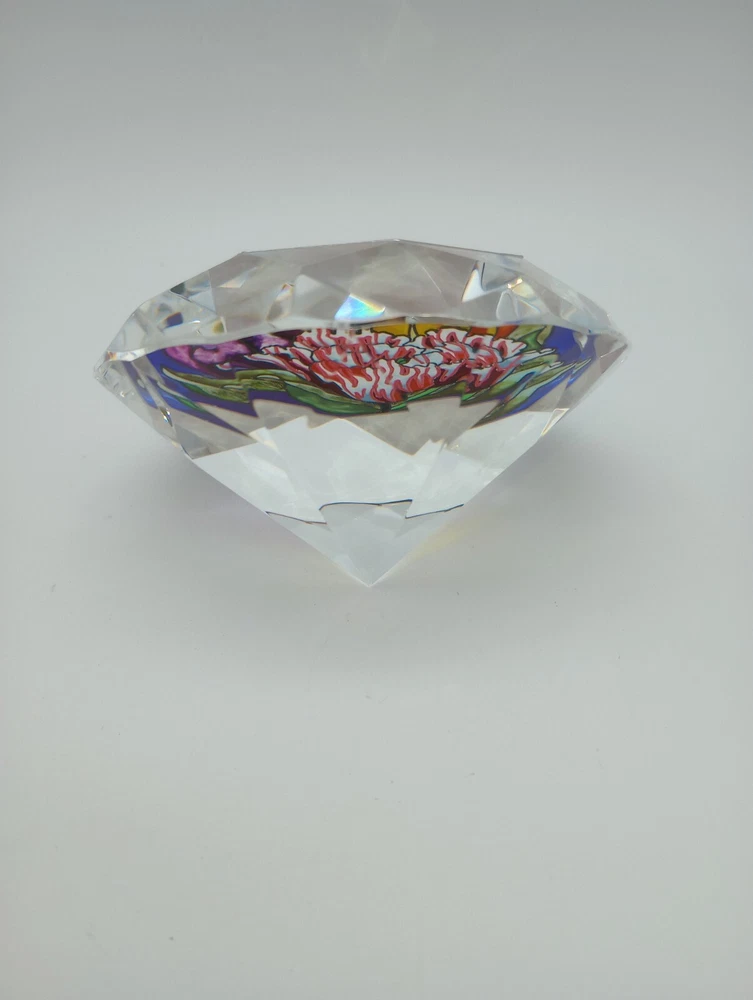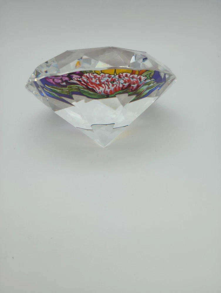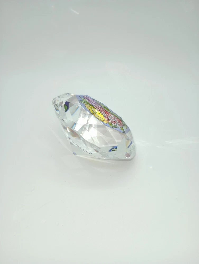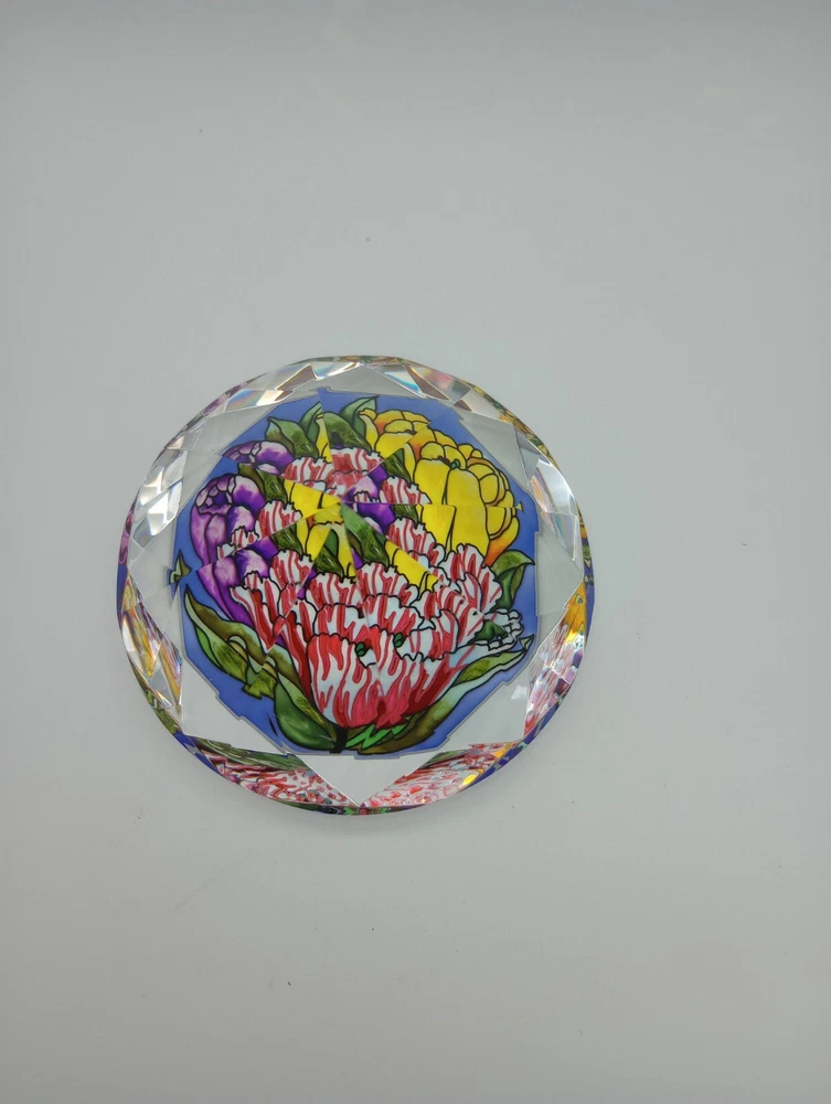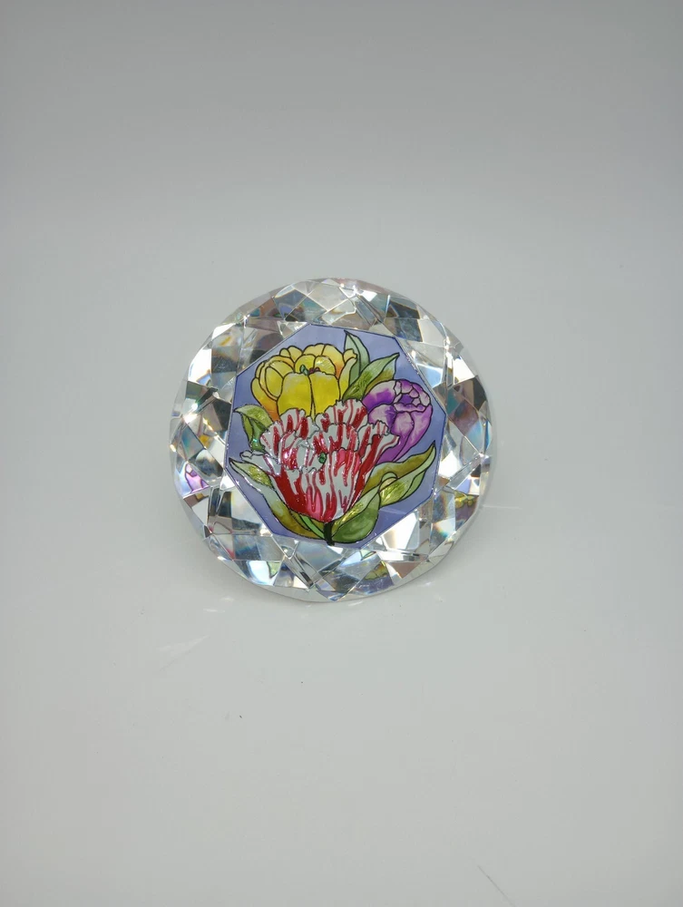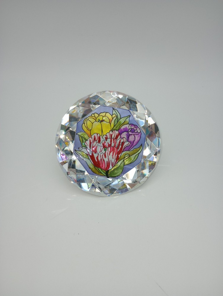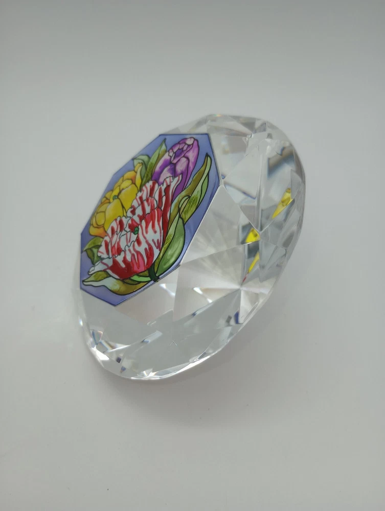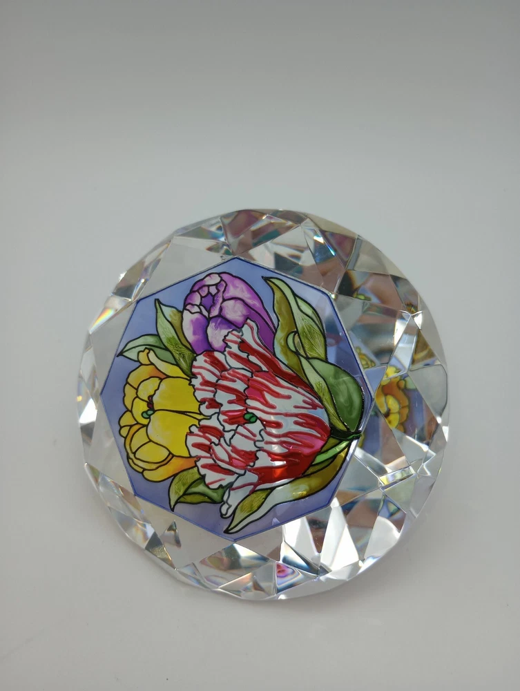 Add a touch of elegance to your collection with this stunning Amia Studios Crystal Prism Pyramid Shaped Tulip Flowers Paperweight. Crafted in the United States, this piece features vibrant multicolored tulip flowers and is made of high-quality crystal material. The prism pyramid shape adds a unique touch to the overall design, making it a perfect addition to any decorative collection. This is excellent condition! No chips or scratches. This paperweight is a great gift idea for those who appreciate collectibles and paperweights. It is not handmade and comes from a brand that is known for its exceptional craftsmanship. Display it on your desk, shelf, or table and admire its beauty. Add it to your cart now and elevate your home decor with this beautiful piece.