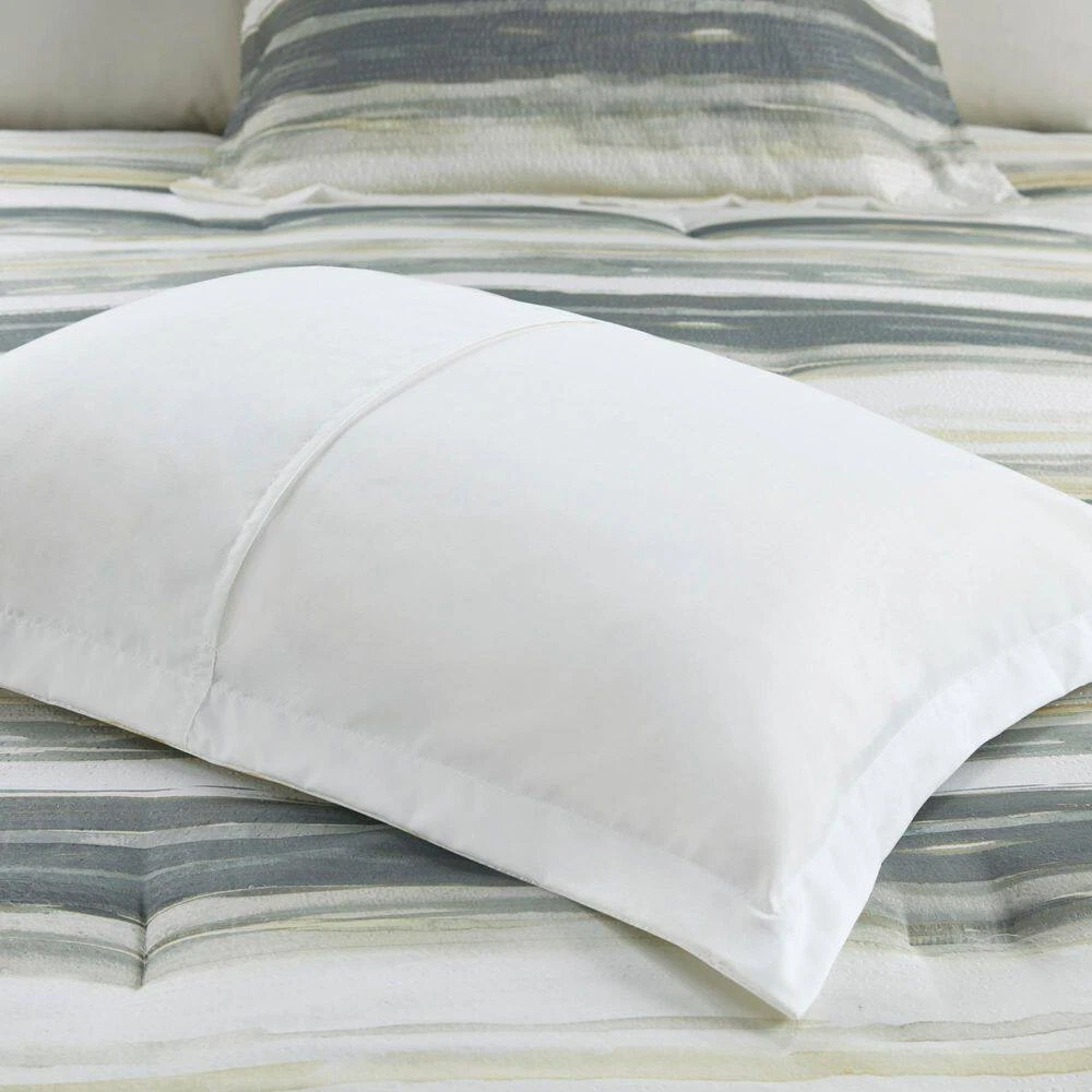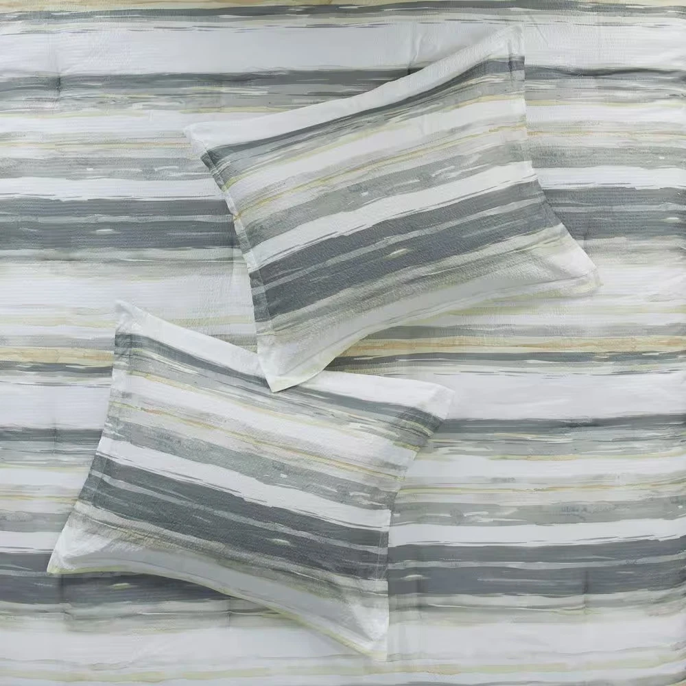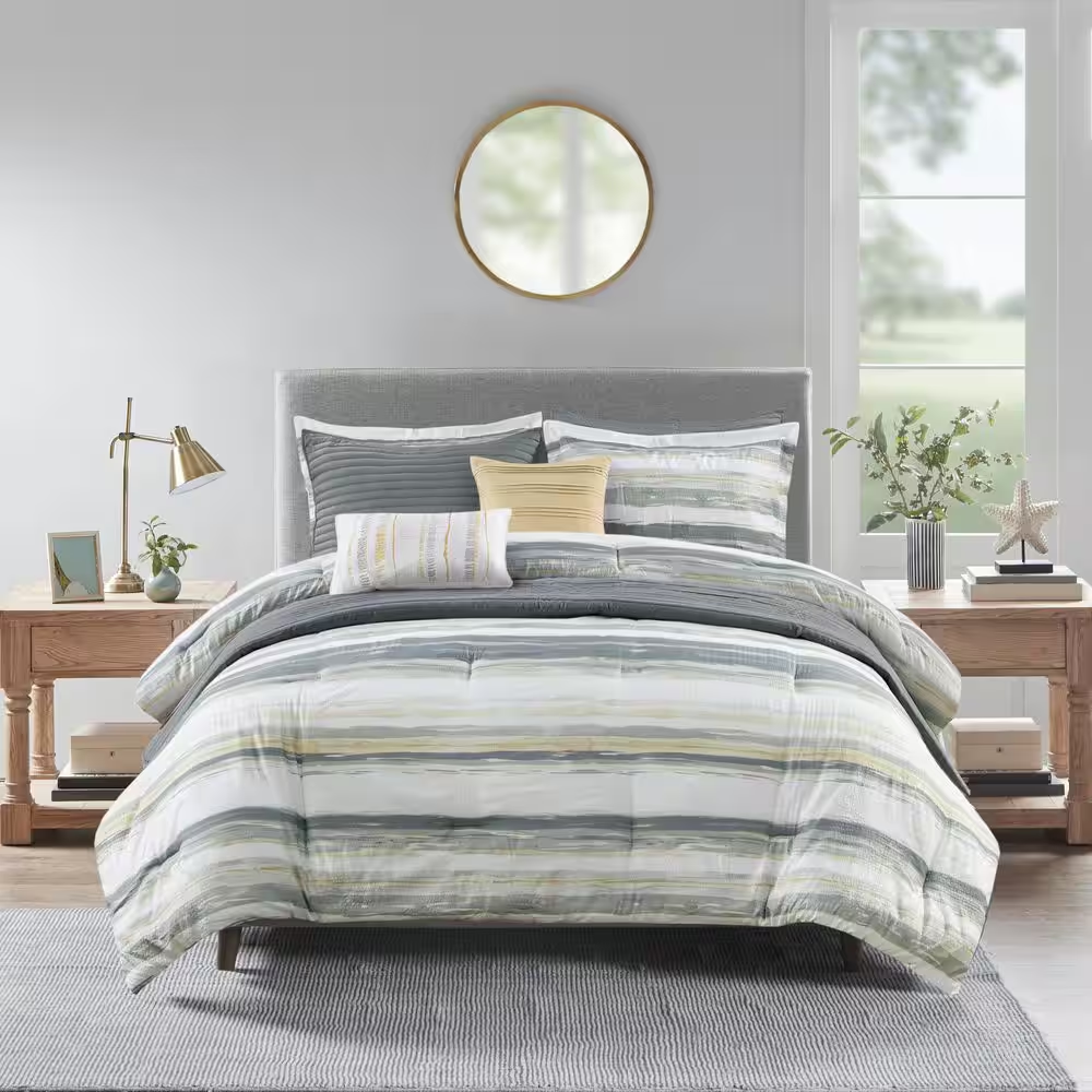 Textured seersucker comforter with watercolor stripe print Set includes 1 Comforter, 2 Shams and a decorative pillow Hypoallergenic polyester filling provides exceptional warmth Create a relaxing and tranquil atmosphere in your bedroom with Madison Park's Anchorage 8 Piece Printed Seersucker Comforter and Quilt Set Collection. The textured seersucker comforter features a watercolor stripe print in yellow and gray hues and a off white reverse, for a serene look. The included quilt features channel stitch quilting pattern and its gray color complements the bedding set. Two shams mirror the design on the face of the comforter, while the other two quilted shams pair perfectly with the quilt. Also included are two decorative pillows with embroidered and pleated details that provide the perfect finishing touches to this comforter and quilt set. Use the quilt alone for the summer season or layer it on the comforter for extra warmth. Hypoallergenic polyester filling in the comforter, quilt, and decorative pillows provide exceptional warmth and comfort. Machine washable for easy care, this seersucker comforter and quilt set collection provides a complete transformation for your bedroom decor. Set includes 1 Comforter:90 in. W x 90 in. L2 Standard Shams:20 in. W x 26 in. L + 1.5 in. D (2)1 Decorative Pillow:16 in. W x 16 in. L1 Decorative Pillow:12 in. W x 18 in. L1 Coverlet:90 in. W x 90 in. L2 Standard Quilted Shams:20 in. W x 26 in. L (2) Items in this set may come in rolled or compressed packaging and will need to be fluffed up Textured seersucker comforter features watercolor stripe in muted yellow and gray hues and an off-white reverse Set includes a quilt set with channel stitch quilting in gray color Use quilt alone for summer season or layer it on the comforter for extra warmth Hypoallergenic polyester filling in the comforter, quilt and decorative pillows Machine washable for easy care
