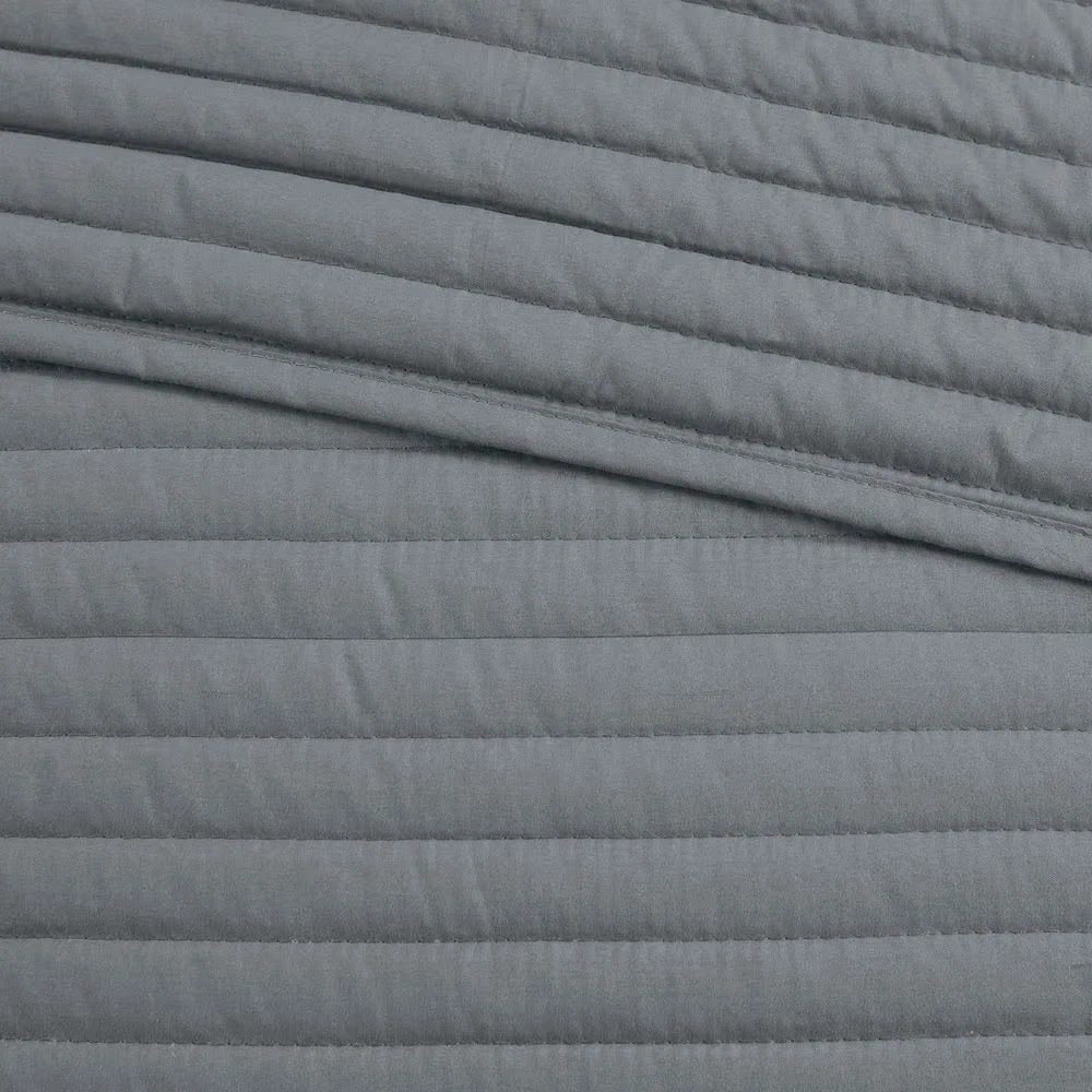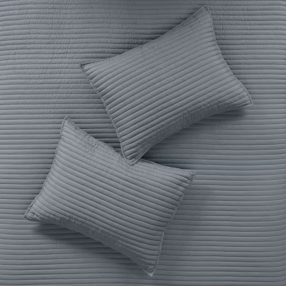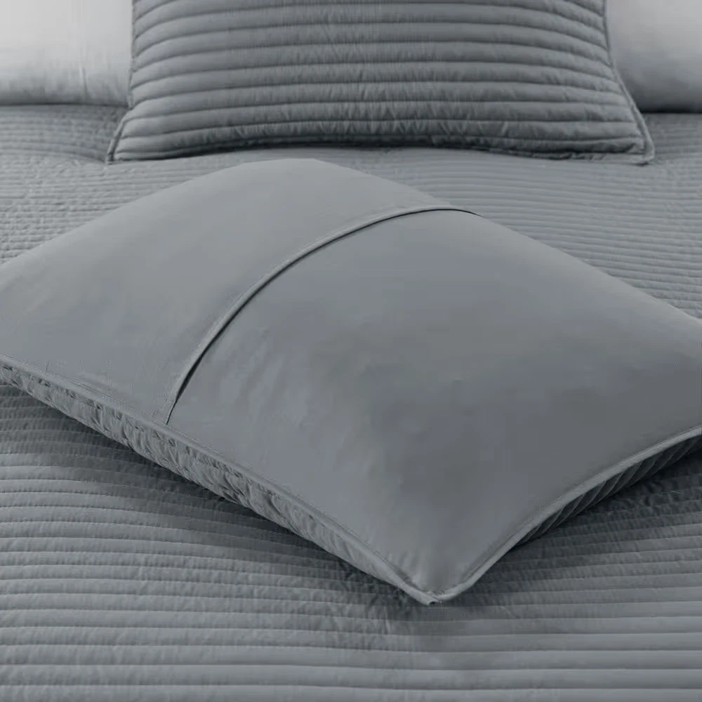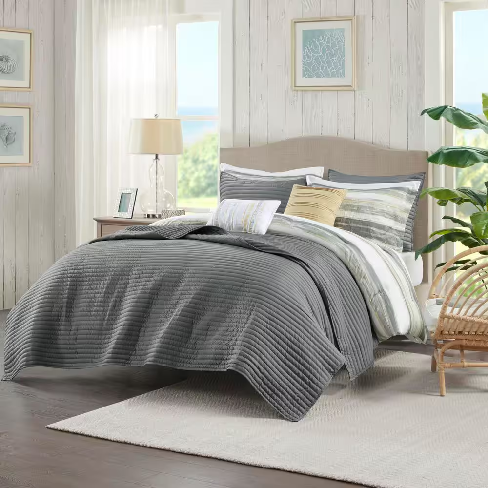 Textured seersucker comforter with watercolor stripe print Set includes 1 Comforter, 2 Shams and a decorative pillow Hypoallergenic polyester filling provides exceptional warmth Create a relaxing and tranquil atmosphere in your bedroom with Madison Park's Anchorage 8 Piece Printed Seersucker Comforter and Quilt Set Collection. The textured seersucker comforter features a watercolor stripe print in yellow and gray hues and a off white reverse, for a serene look. The included quilt features channel stitch quilting pattern and its gray color complements the bedding set. Two shams mirror the design on the face of the comforter, while the other two quilted shams pair perfectly with the quilt. Also included are two decorative pillows with embroidered and pleated details that provide the perfect finishing touches to this comforter and quilt set. Use the quilt alone for the summer season or layer it on the comforter for extra warmth. Hypoallergenic polyester filling in the comforter, quilt, and decorative pillows provide exceptional warmth and comfort. Machine washable for easy care, this seersucker comforter and quilt set collection provides a complete transformation for your bedroom decor. Set includes 1 Comforter:90 in. W x 90 in. L2 Standard Shams:20 in. W x 26 in. L + 1.5 in. D (2)1 Decorative Pillow:16 in. W x 16 in. L1 Decorative Pillow:12 in. W x 18 in. L1 Coverlet:90 in. W x 90 in. L2 Standard Quilted Shams:20 in. W x 26 in. L (2) Items in this set may come in rolled or compressed packaging and will need to be fluffed up Textured seersucker comforter features watercolor stripe in muted yellow and gray hues and an off-white reverse Set includes a quilt set with channel stitch quilting in gray color Use quilt alone for summer season or layer it on the comforter for extra warmth Hypoallergenic polyester filling in the comforter, quilt and decorative pillows Machine washable for easy care
