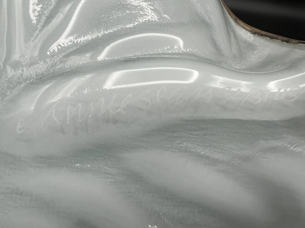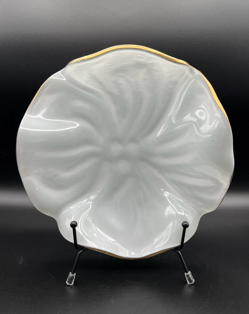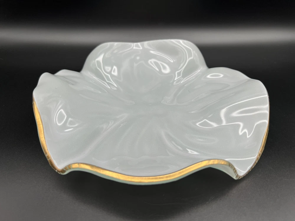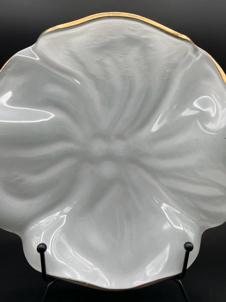 Gorgeous Vintage Annieglass Shell Shaped Bowl White Frosted with Gold Rim ~ Signed. Measures approx. 8.5” in diameter. Good condition, no chips or cracks. There are a couple of small scratches in the white but they are in the glass so done during production (see photos).