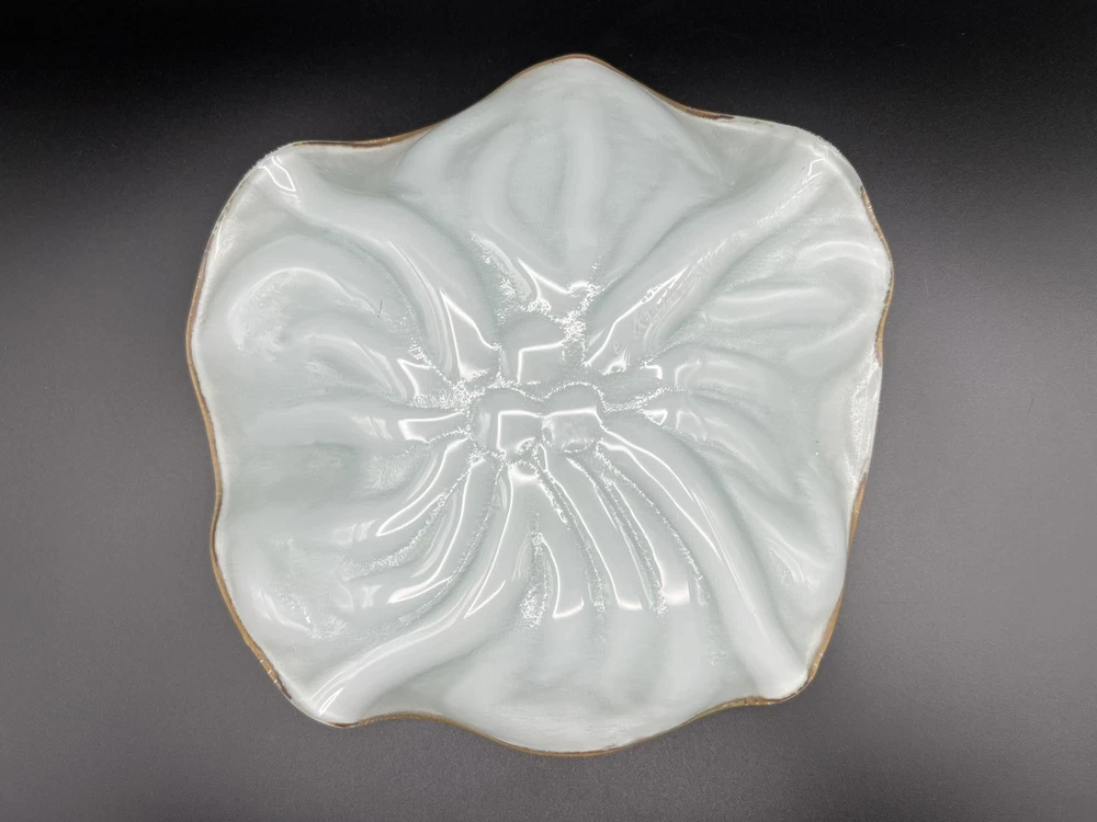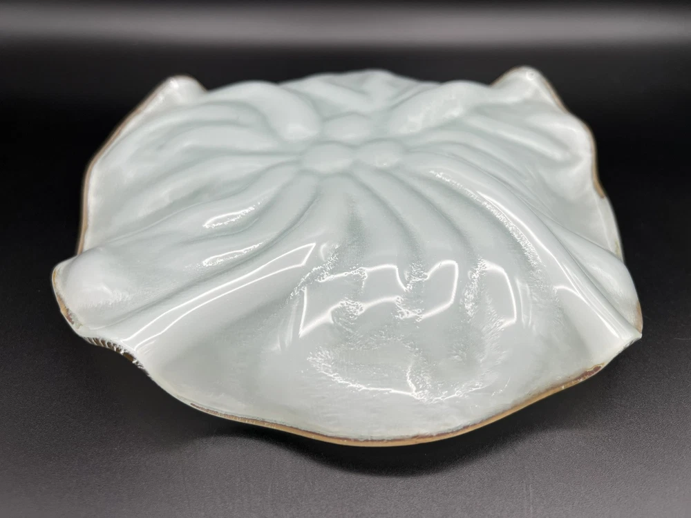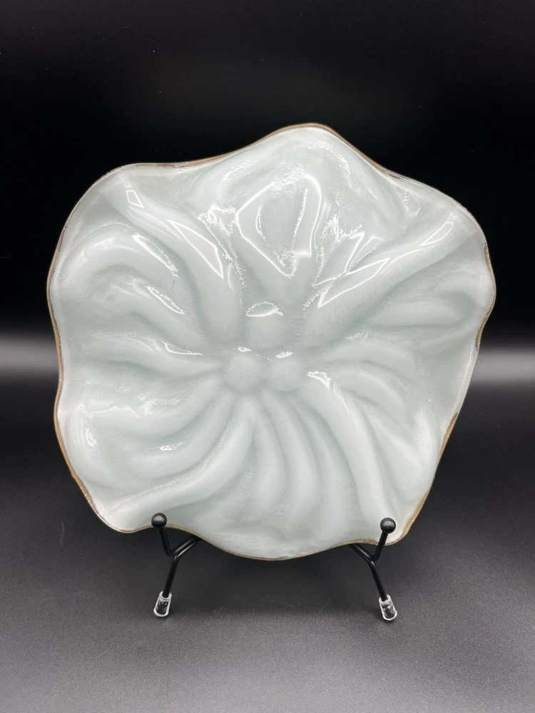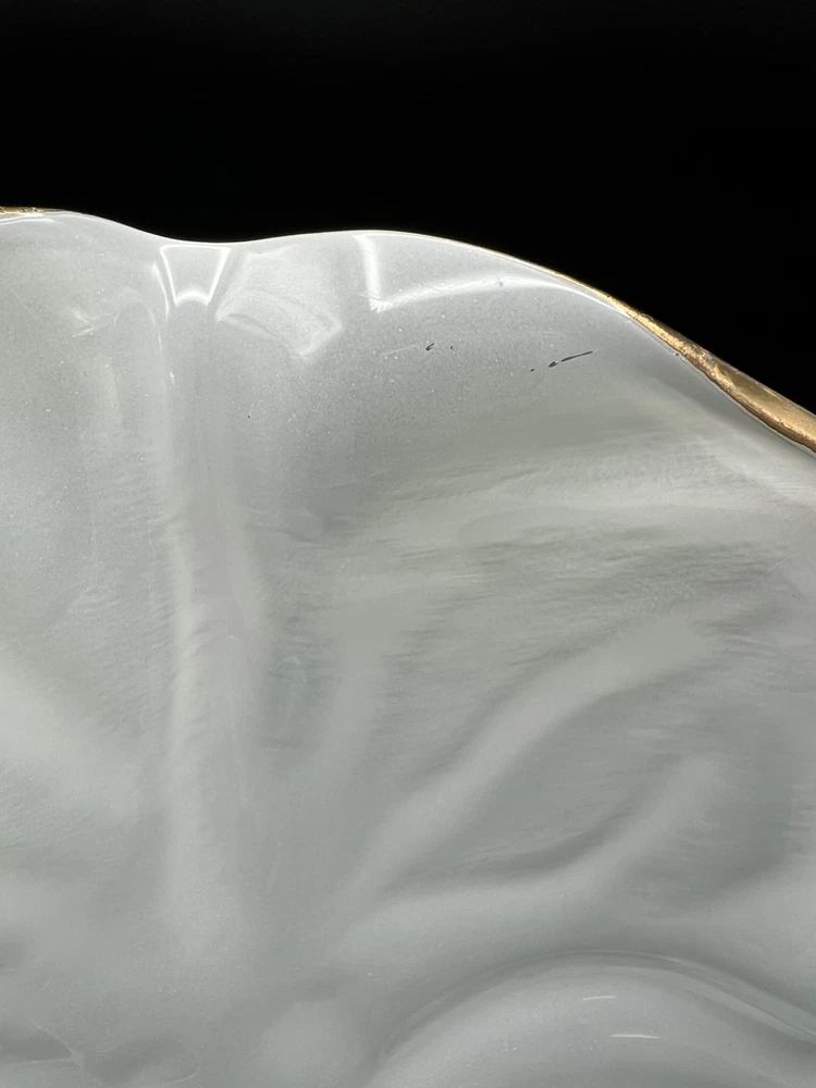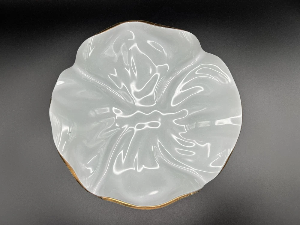 Gorgeous Vintage Annieglass Shell Shaped Bowl White Frosted with Gold Rim ~ Signed. Measures approx. 8.5” in diameter. Good condition, no chips or cracks. There are a couple of small scratches in the white but they are in the glass so done during production (see photos).