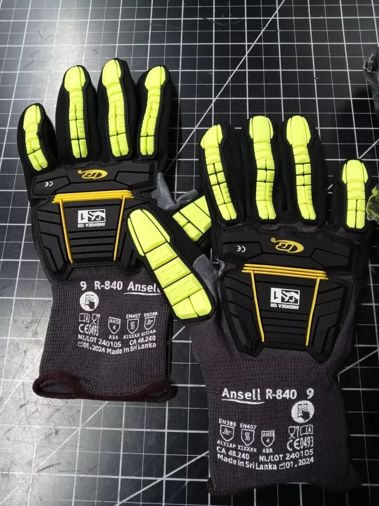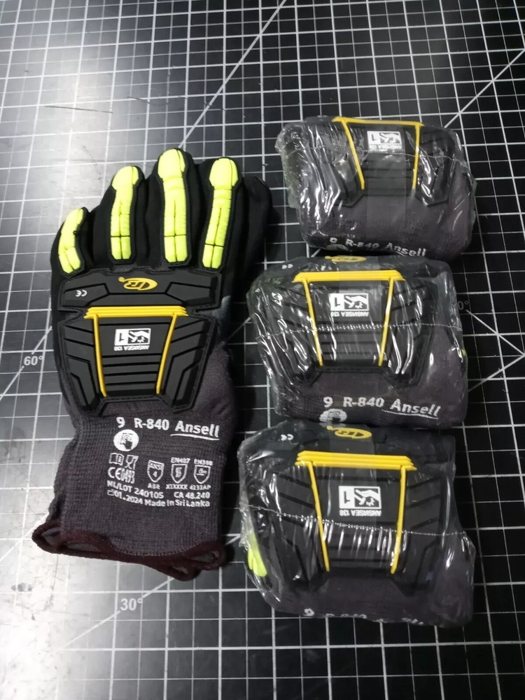 Ansell Ringers® Nitrile Half-Dipped Anti-Impact Gloves R-840 Size 9 L Lot of 4 KEY FEATURES AND BENEFITS RINGERS Signature TPR (Thermoplastic Rubber) Unique blend of impact technology reduces the force of impact. Low profile Level 1 TPR covers the full length of fingers, thumb, and back of the hand. Dipped nitrile palm coating offering 2x more grip vs. previous technology. PU Thumb Crotch Reinforcement (TCR) provides additional durability in a high abrasion area extending the lifespan of the glove.Improved FORTIX™ Technology delivers up to 20% more abrasion resistance for longer-lasting wear. ERGOFORM™ Ergonomic gloves reduce stress on hands ensuring a fit shaped to natural hand contours that maximizes the range of motion which improves performance. Ansell ZONZ™ Comfort Fit Technology optimizes the knitting in selected zones of the 15-gauge nylon and spandex blend liner improving support, breathability, and range of movement resulting in optimal comfort.
