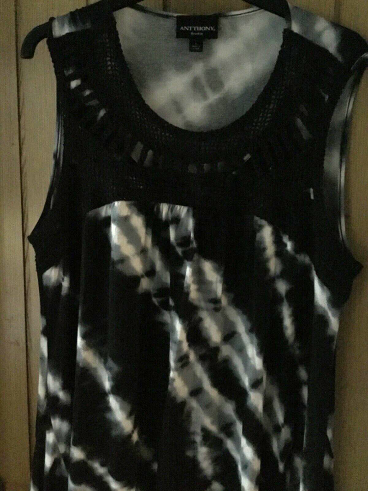 Lovely shaped hem top in tie die black with black crochet to neck. From Anthony Studios size L SELLING LOTS OF ITEMS AND ALWAYS HAPPY TO COMBINE POSTAGE JUST REQUEST A TOTAL AFTER PURCHASING....