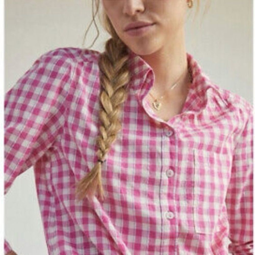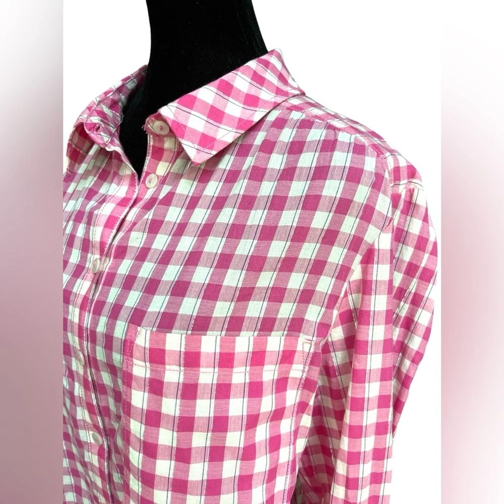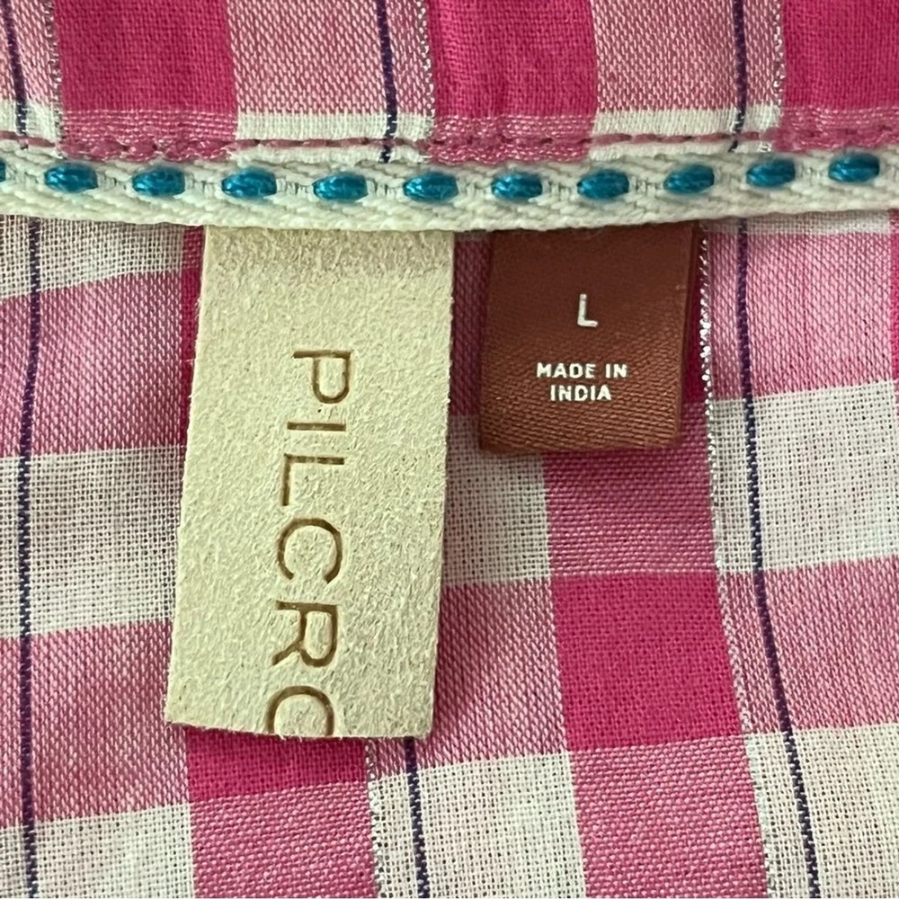 PILCRO for ANTHROPOLOGIE PINK GINGHAM WESTERN DIPPED IN BLUE BUTTON UP METALLIC THREADING SIZE LARGE EXCELLENT CONDITION MEASUREMENTS IN INCHES LAID FLAT: BUST - 21 LENGTH - 30...