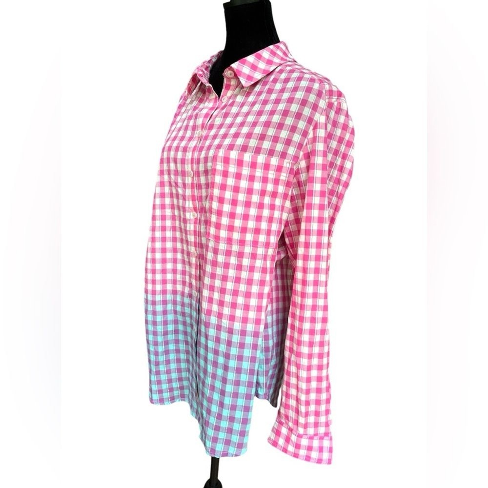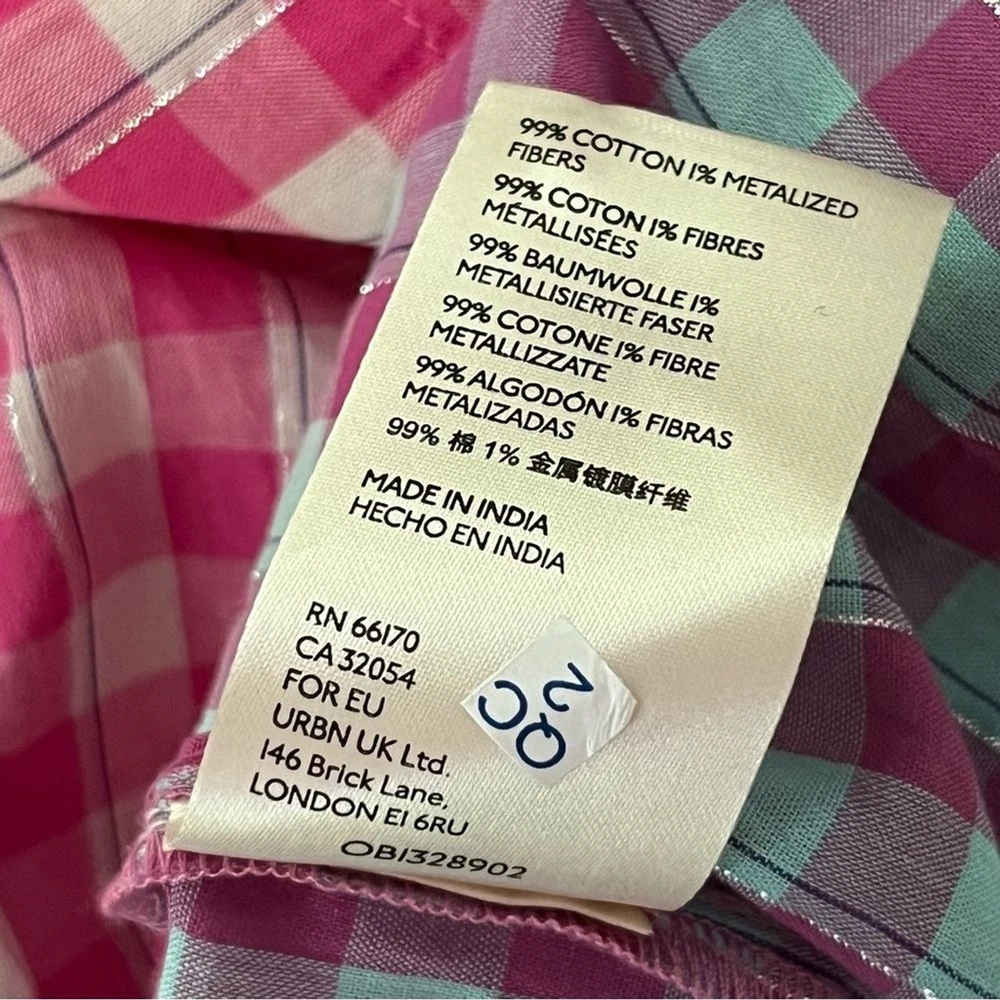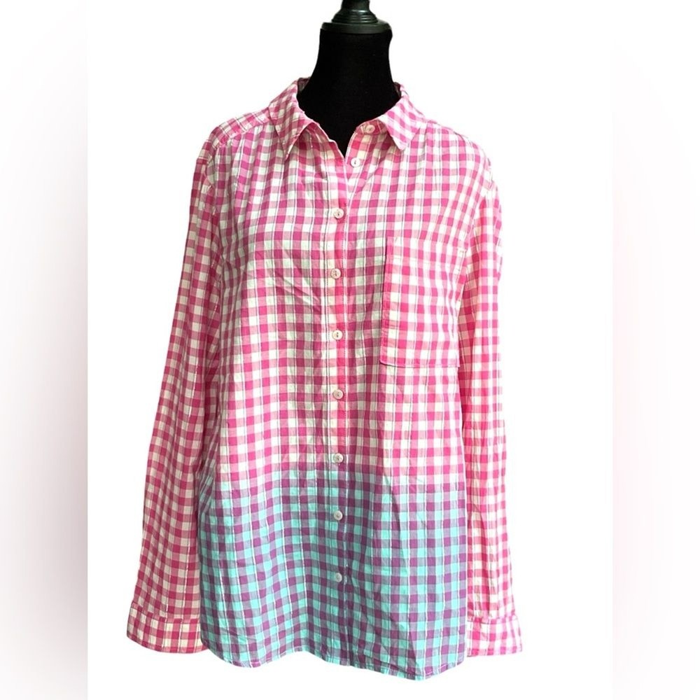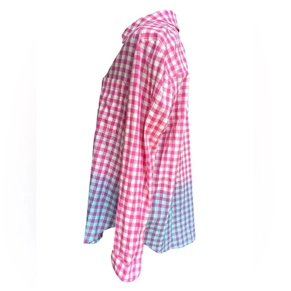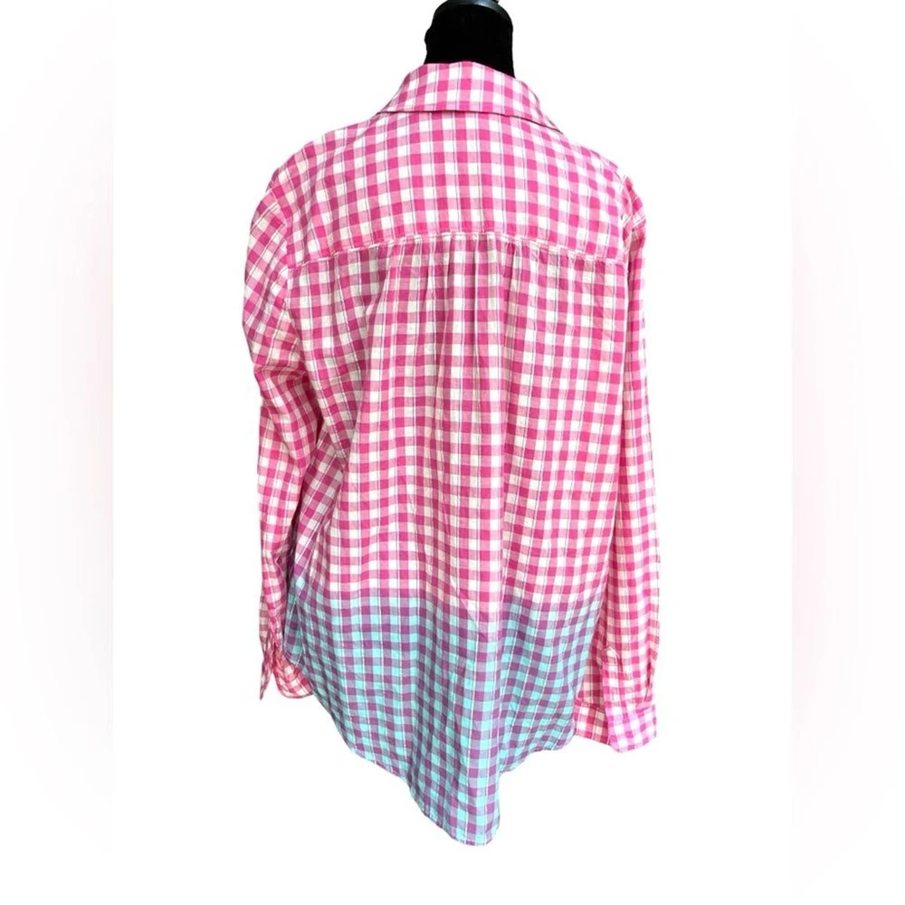 This shirt is a dream! The pink gingham with blue dip-dye details gives it such a fun, retro vibe, and the metallic threading adds a subtle sparkle. The fit is perfect—relaxed but still flattering—and the fabric is soft yet sturdy. Love the western-style buttons for that extra touch of charm. It’s in amazing condition and looks even better in person. A total standout piece!