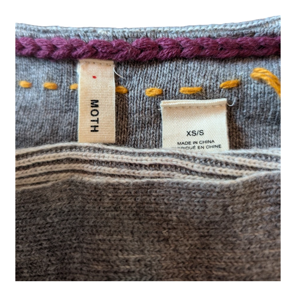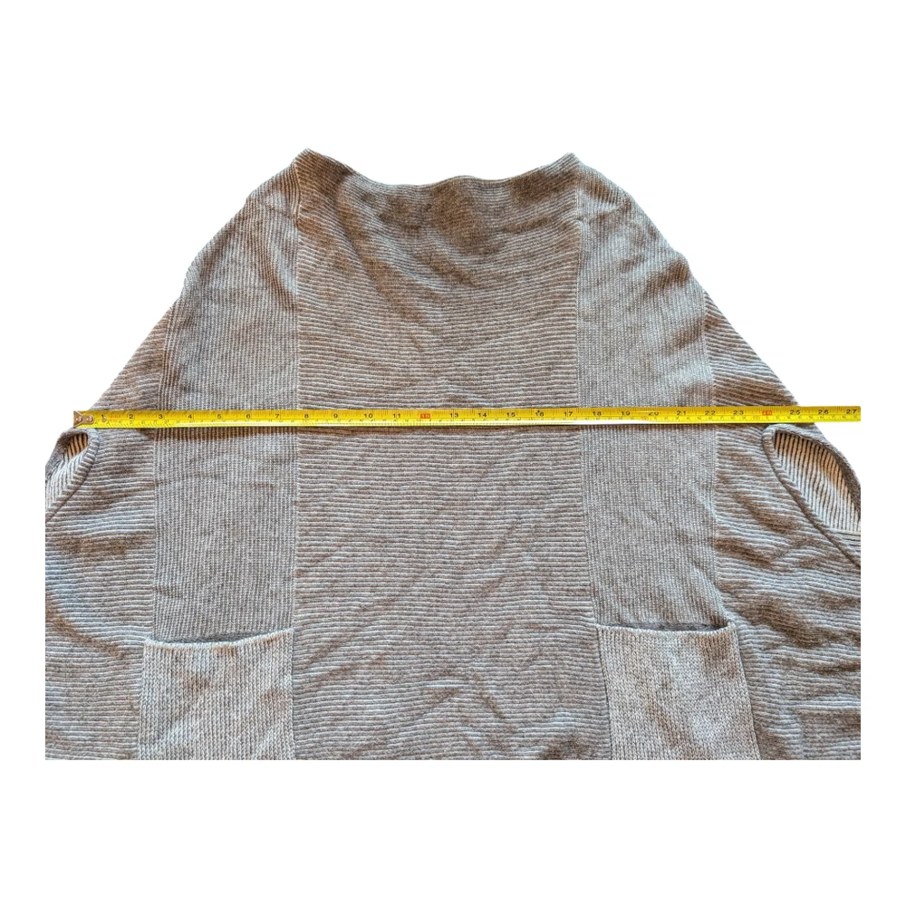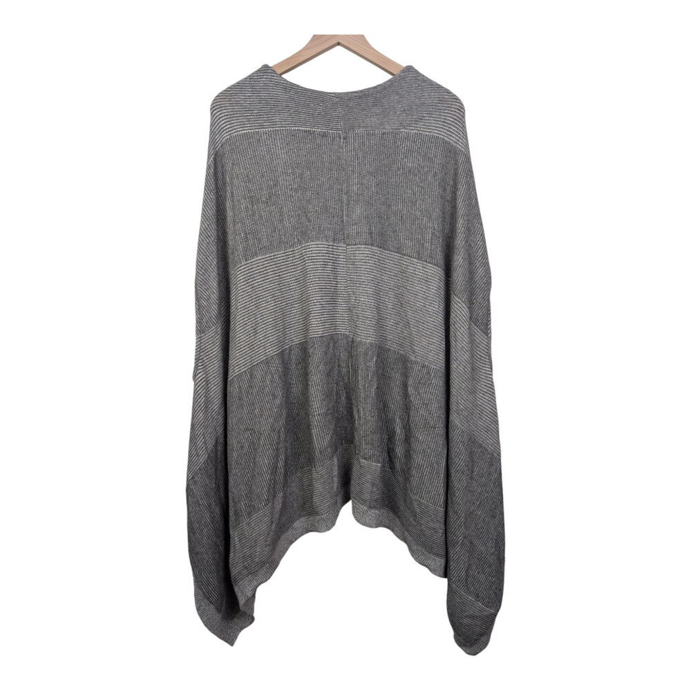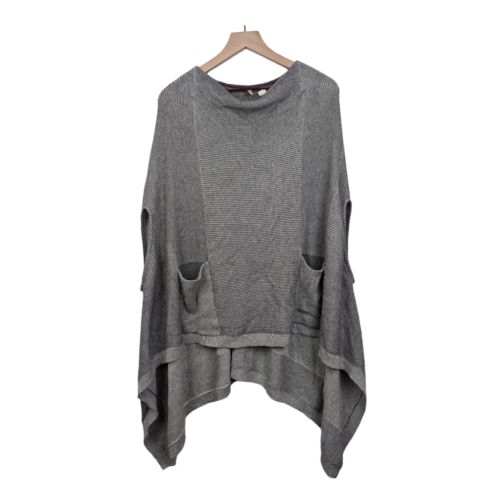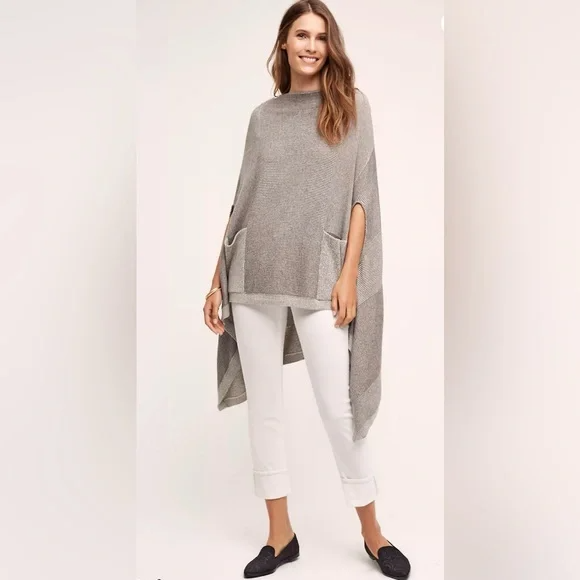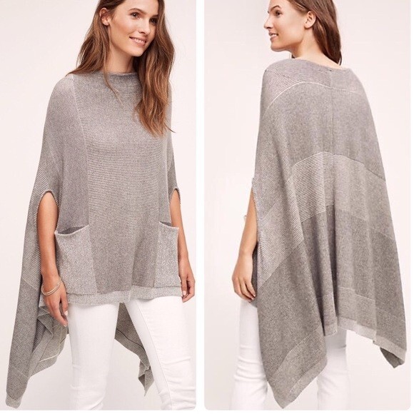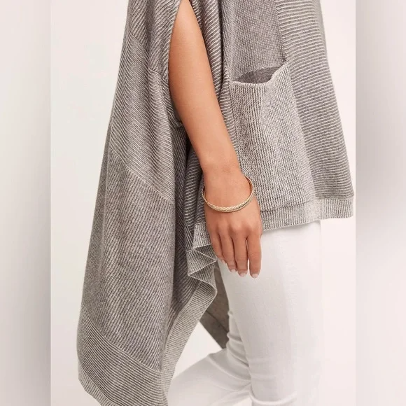 Brand: Moth (Anthropologie) Style: Madison Park Poncho Sweater Color: Gray Size: Women's XS/S Extra Small/Small (oversized) *Excellent Pre-Owned Condition **Please see photos for measurements Gray striped knit sweater poncho. Two front patch pockets. High low hem. Pullover style. Arm holes. Oversized. 54% Cotton, 24% Rayon, 15% Nylon, 5% Cashmere, 1% Wool tags - anthro, sweater, Poncho, Cape, Soft, cozy, fall, winter, comfy, comfortable, boho, western, lagen, lagenlook, warm